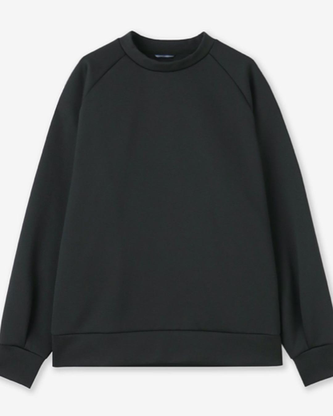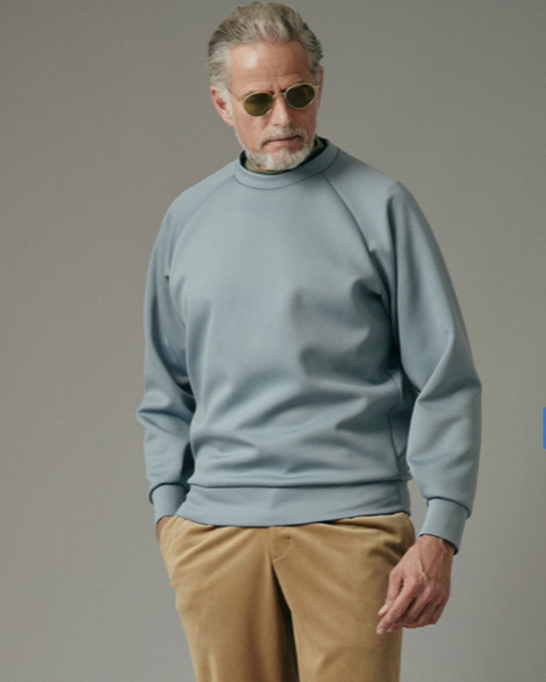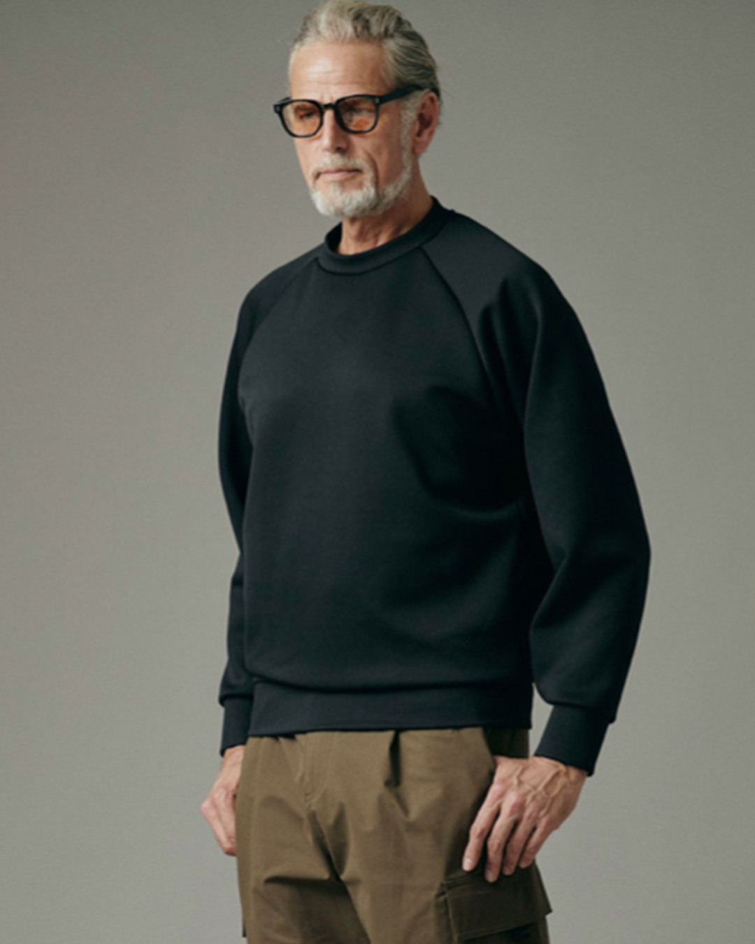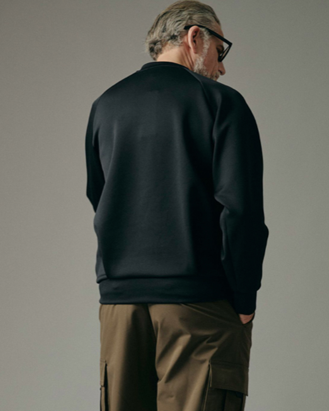 デザインも、流行に捉われないクルーネック仕様で、肩周りの身体の動きを快適にサポートするラグランスリーブを採用、着心地もしっかりと考慮されて襟、袖先、裾に安定したフィット感があります。