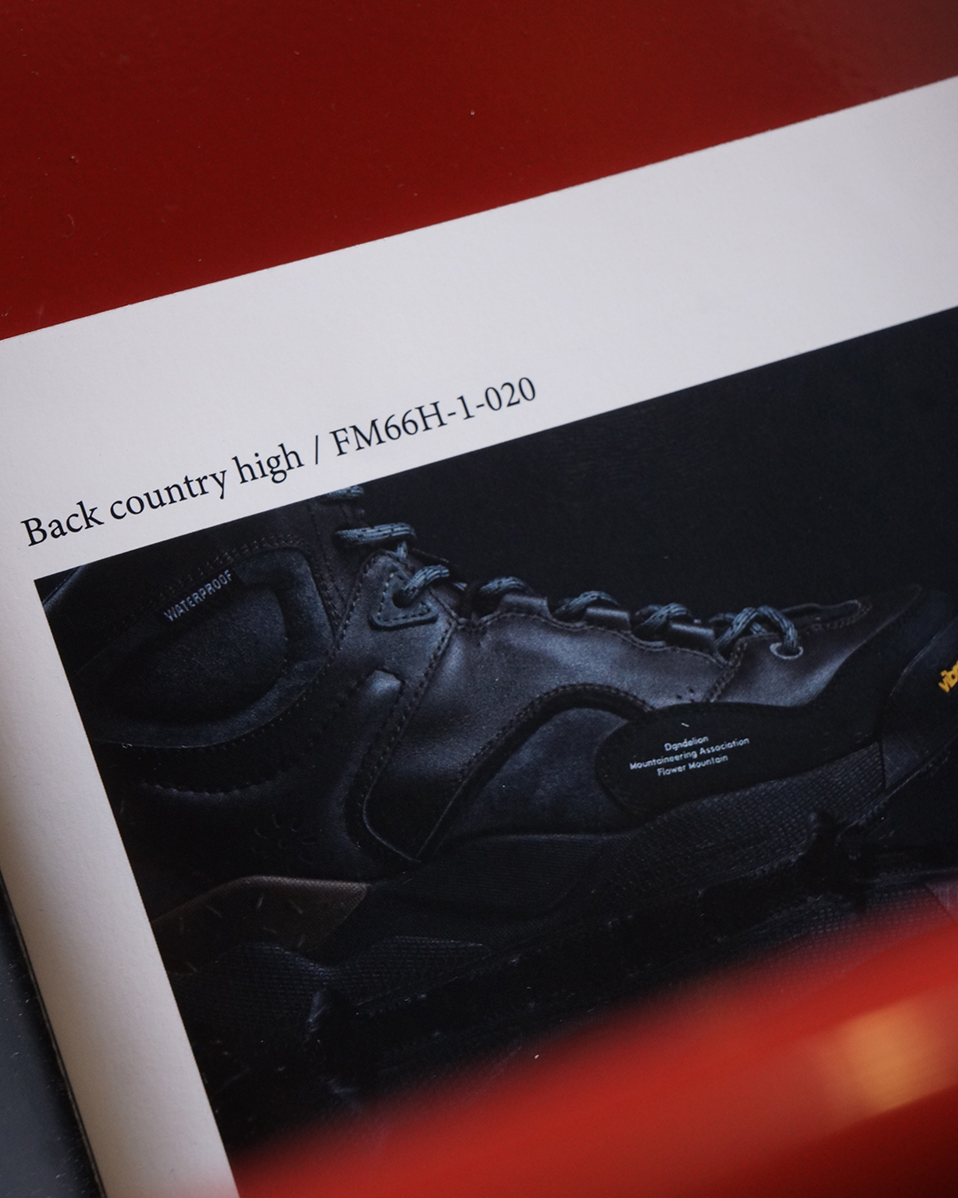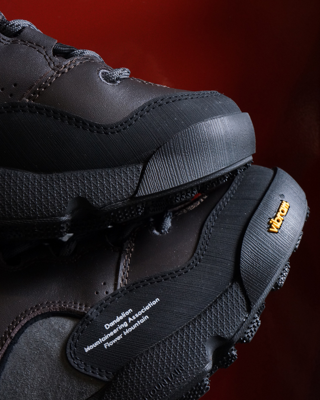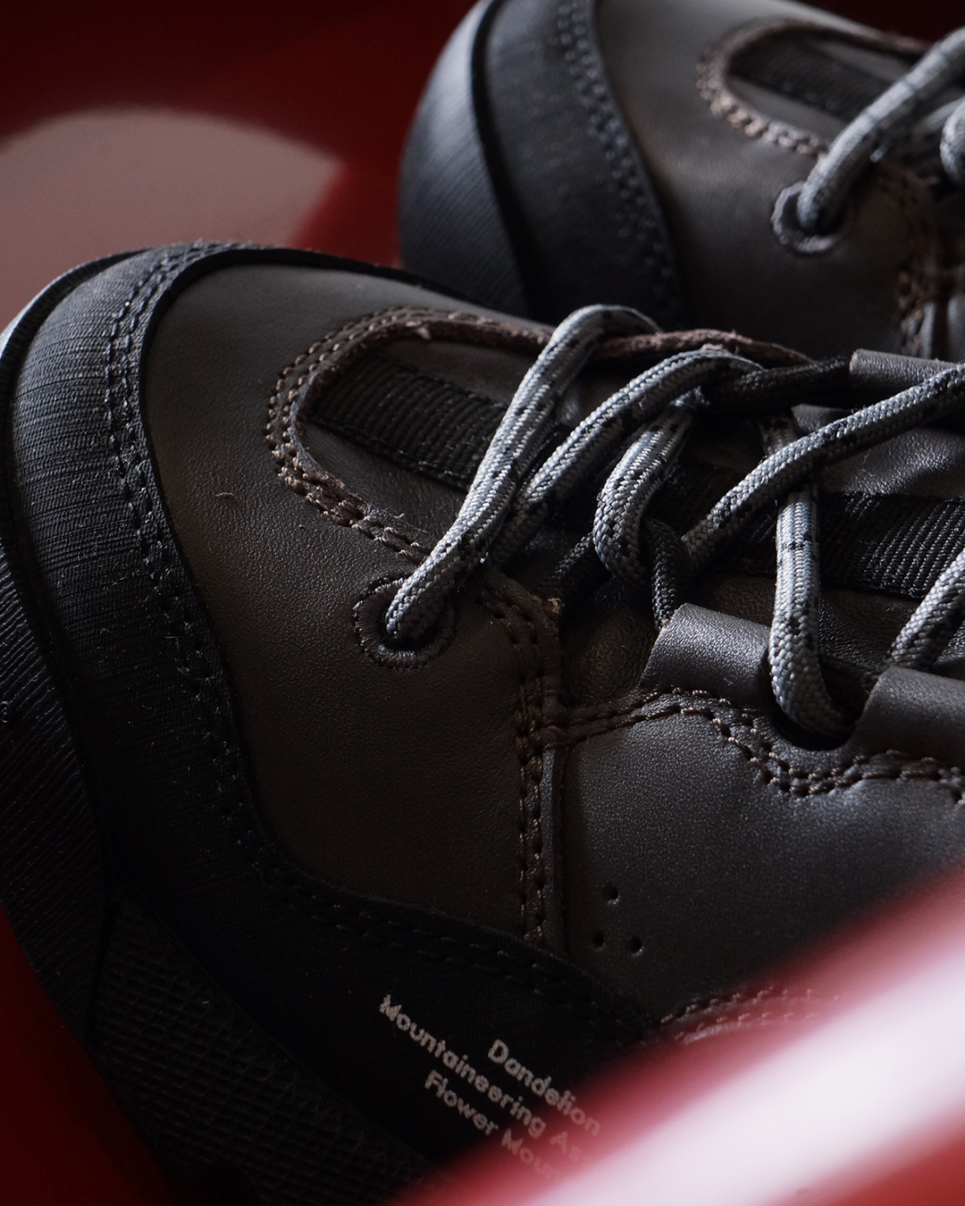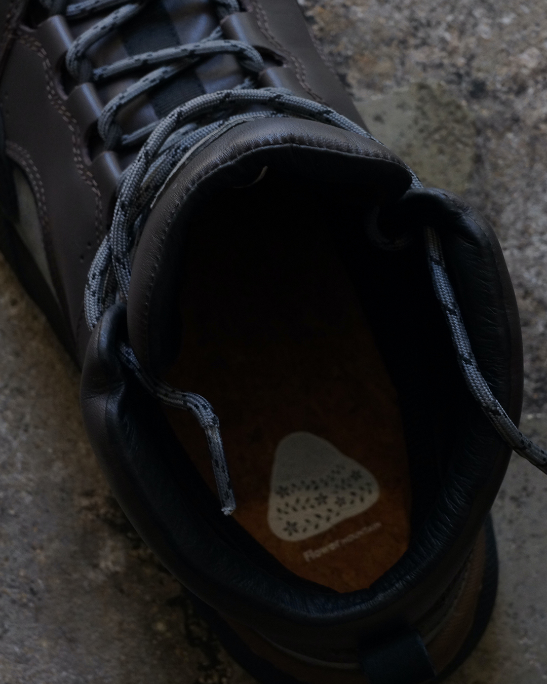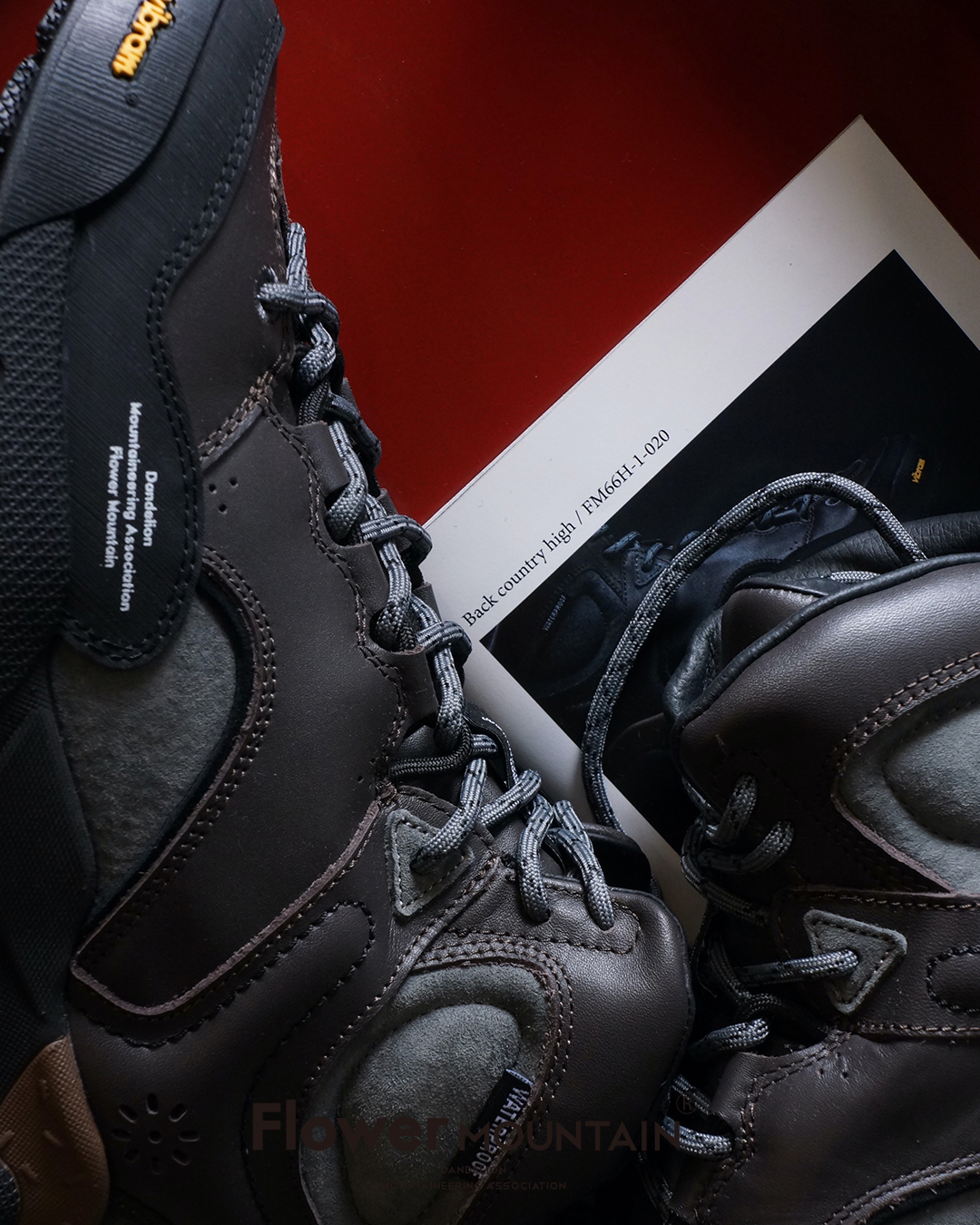 アウトドアシーン対応する機能性にこだわったトレッキングモデル “BACK COUNTRY”のハイカット。「DMA」のプロデーュスにより足首周りを保護するアンクル丈に改修。機能性はローカットモデルをそのまま継承。完全防水・パラコードシューレースを採用。ツーリングには悪路でも確実に路面をグリップするビブラム社の『 MEGA GRIP 』を使用したFlower MOUNTAINオリジナルソールを搭載。