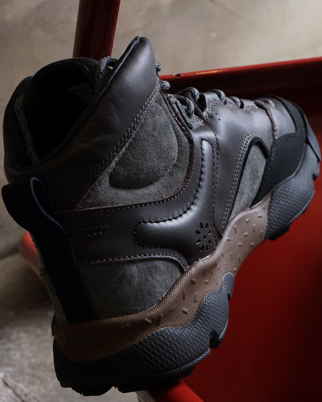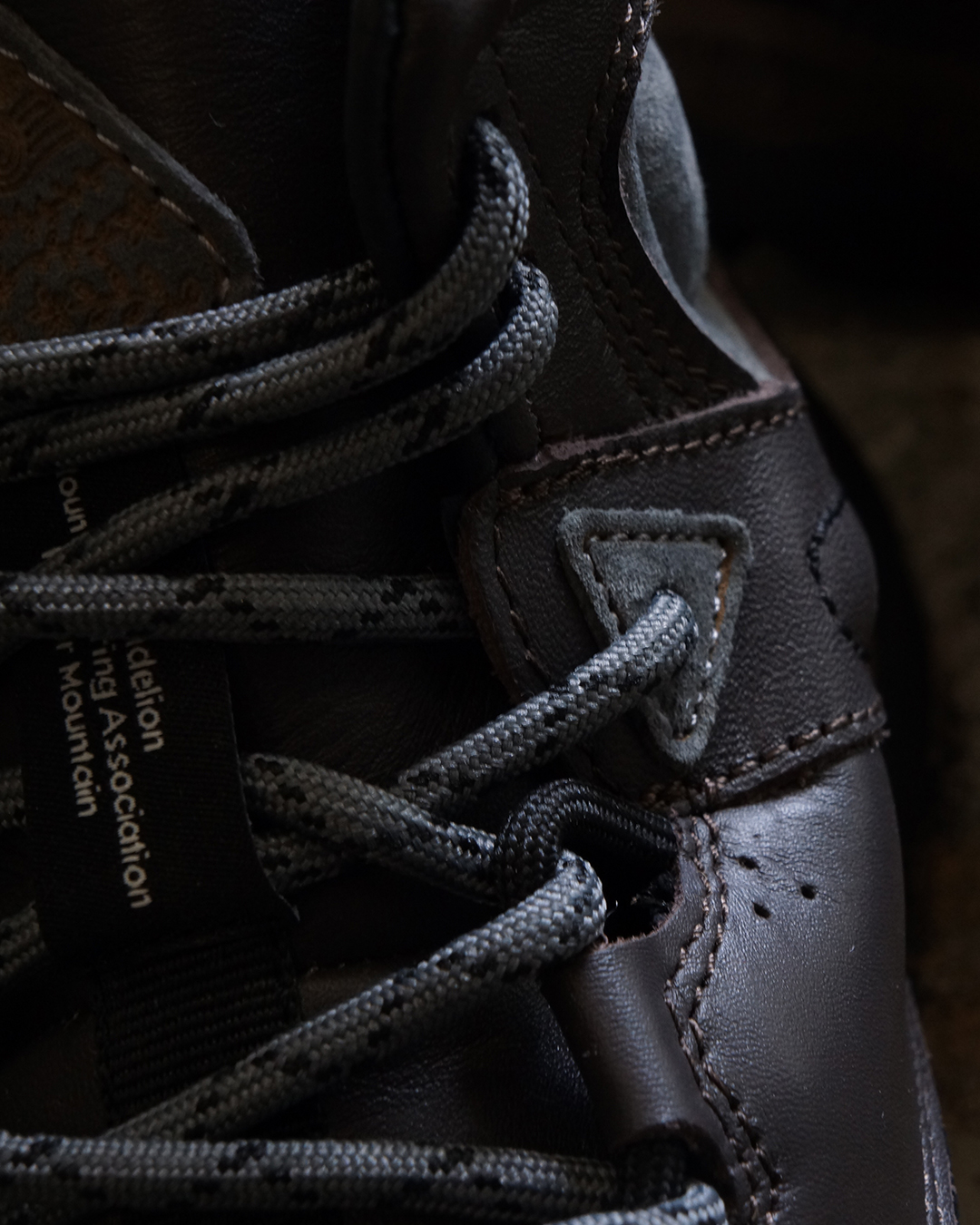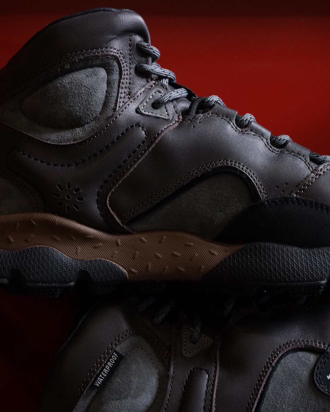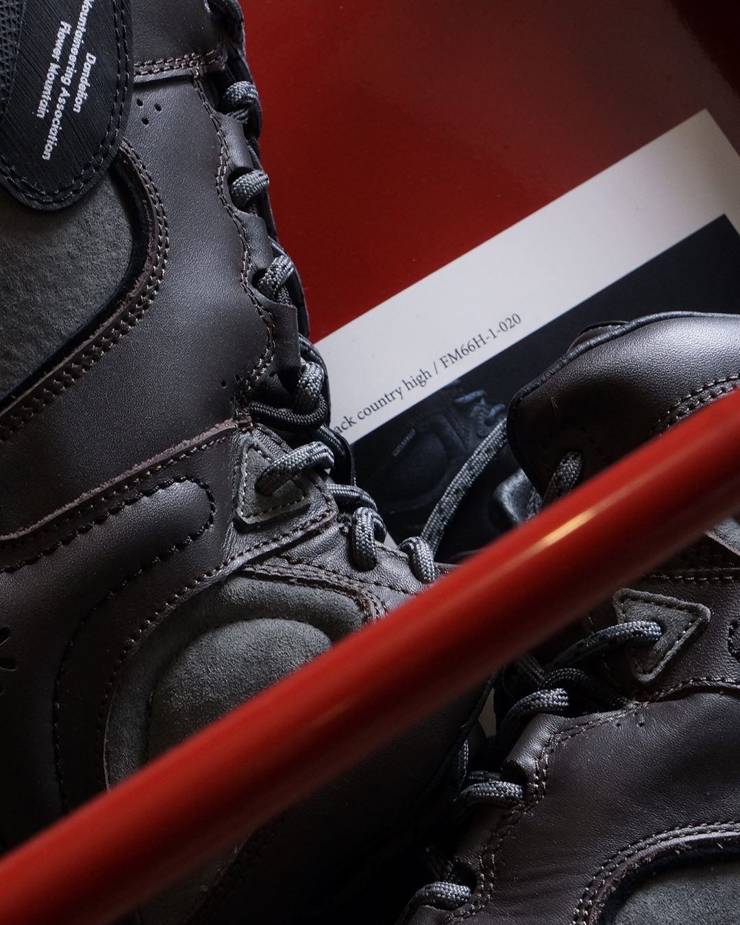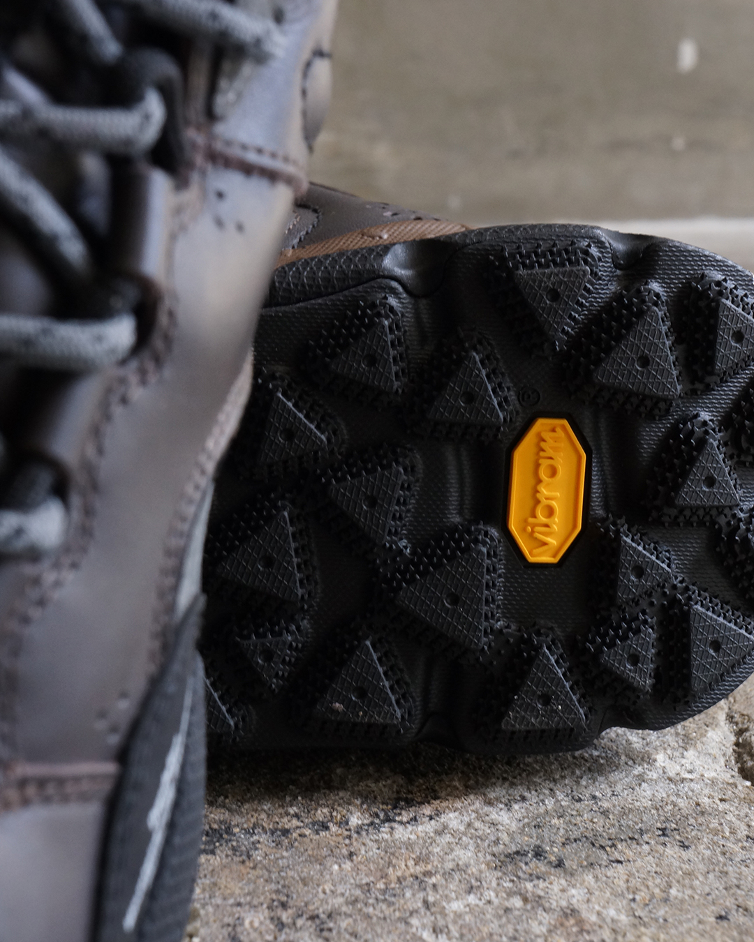 アウトドアシーン対応する機能性にこだわったトレッキングモデル “BACK COUNTRY”のハイカット。「DMA」のプロデーュスにより足首周りを保護するアンクル丈に改修。機能性はローカットモデルをそのまま継承。完全防水・パラコードシューレースを採用。ツーリングには悪路でも確実に路面をグリップするビブラム社の『 MEGA GRIP 』を使用したFlower MOUNTAINオリジナルソールを搭載。