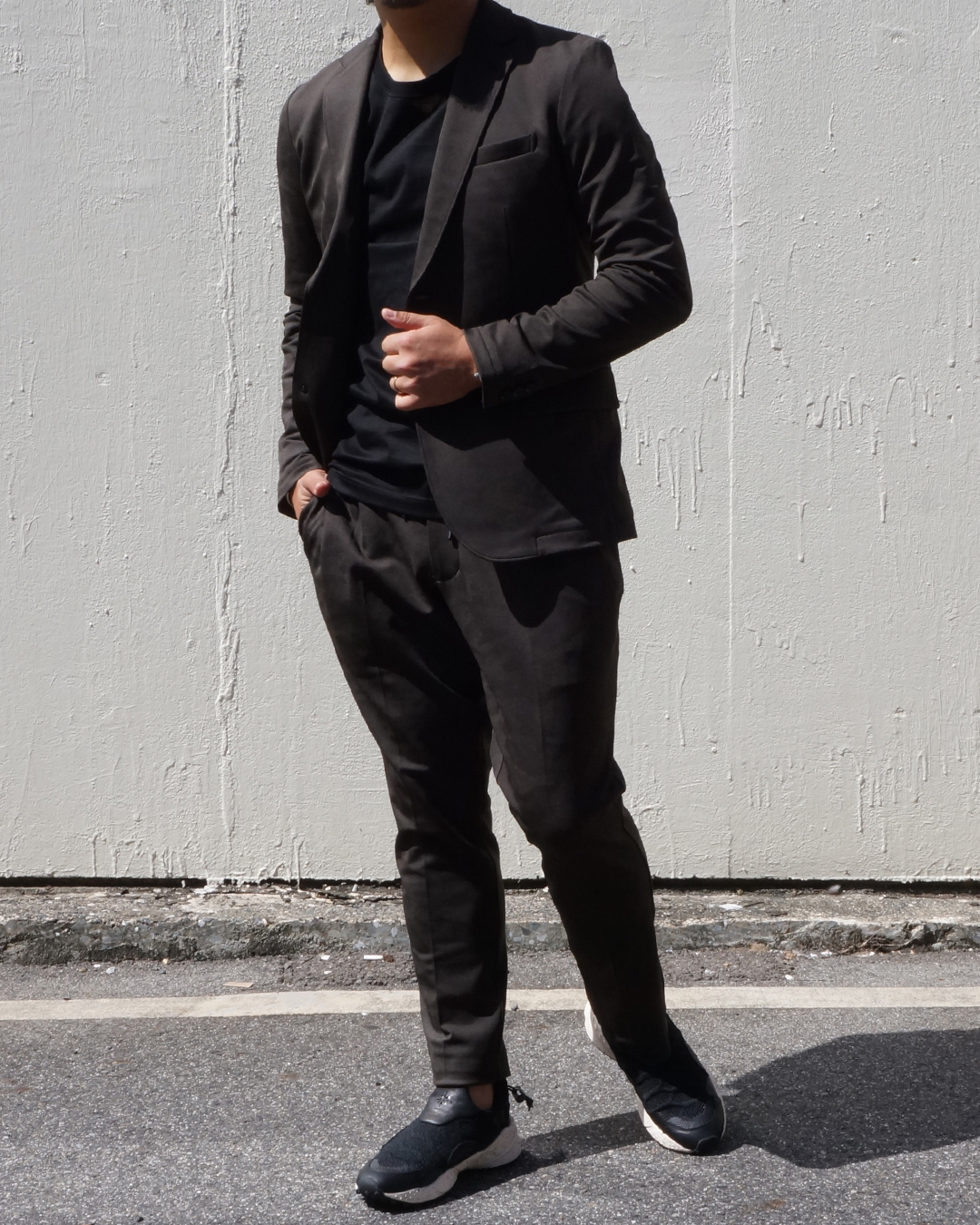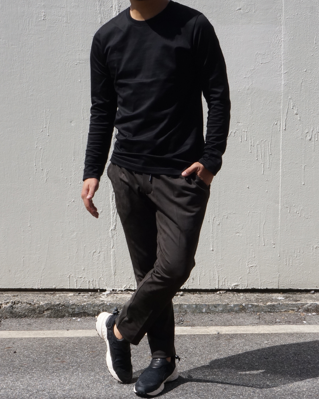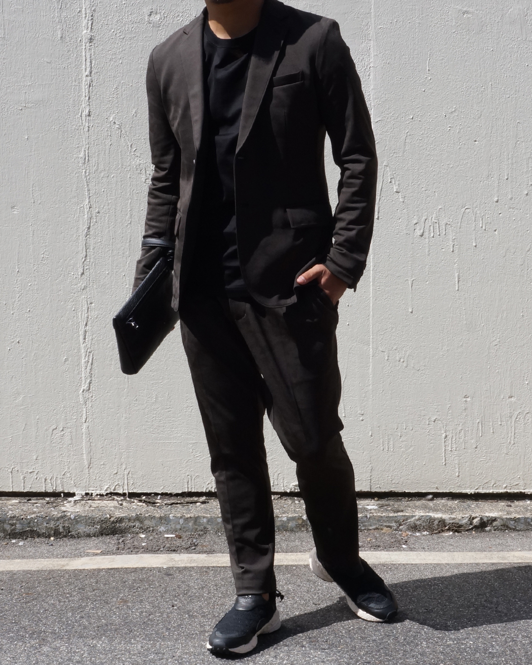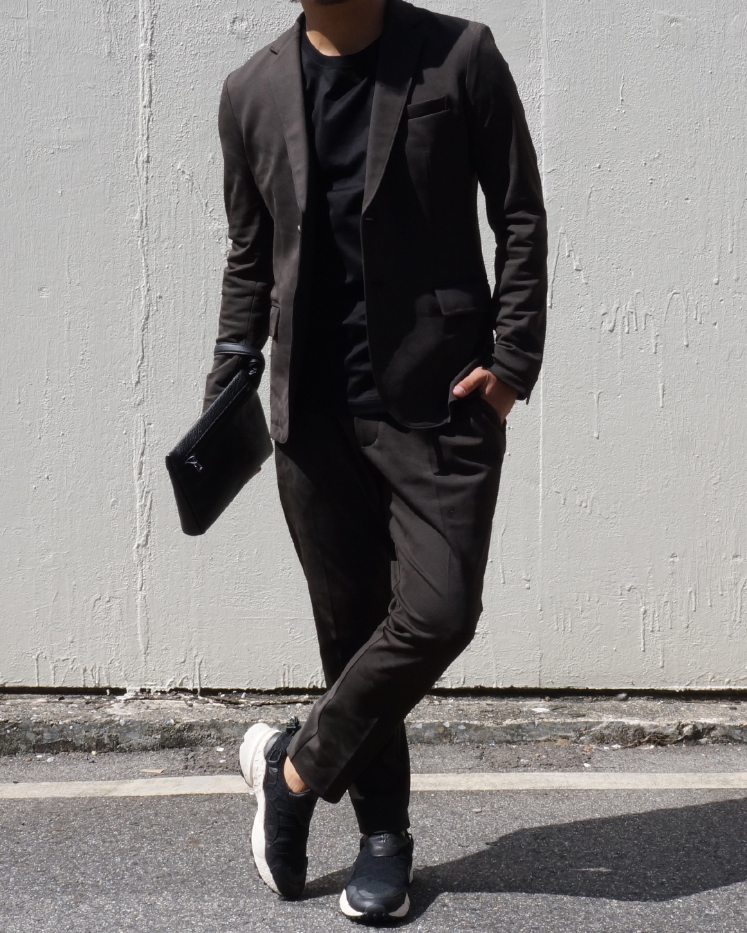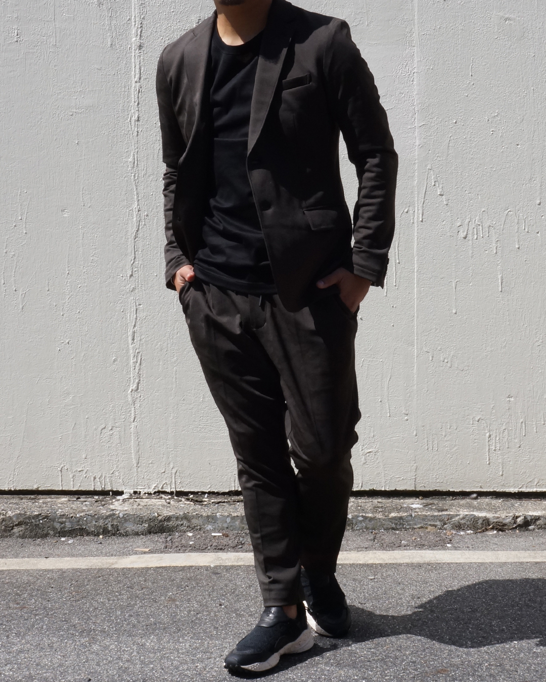 素材はリラックスウェア、シルエットは程良くシャープに。