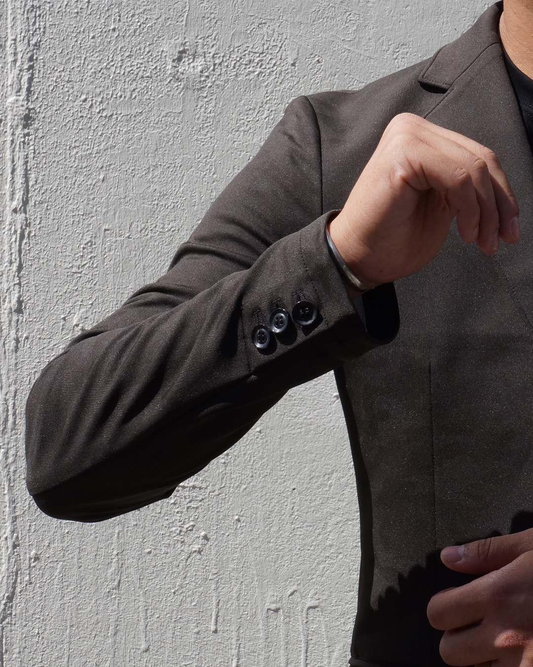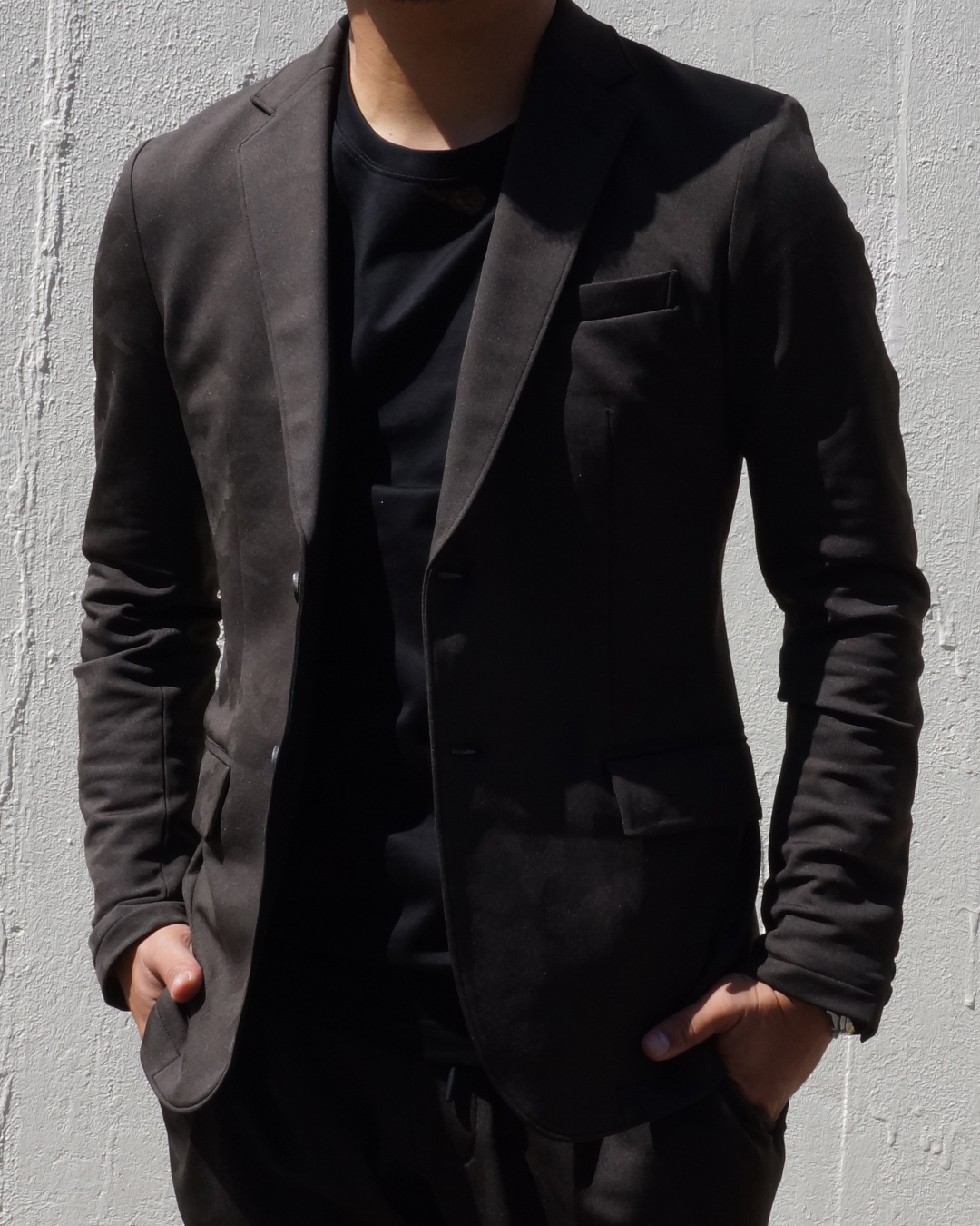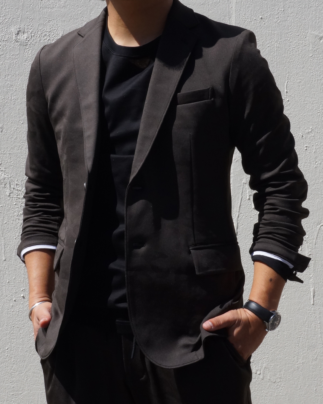 フロントは2つボタンで、雨蓋付きポケット。そして、袖は本切羽仕上げ。