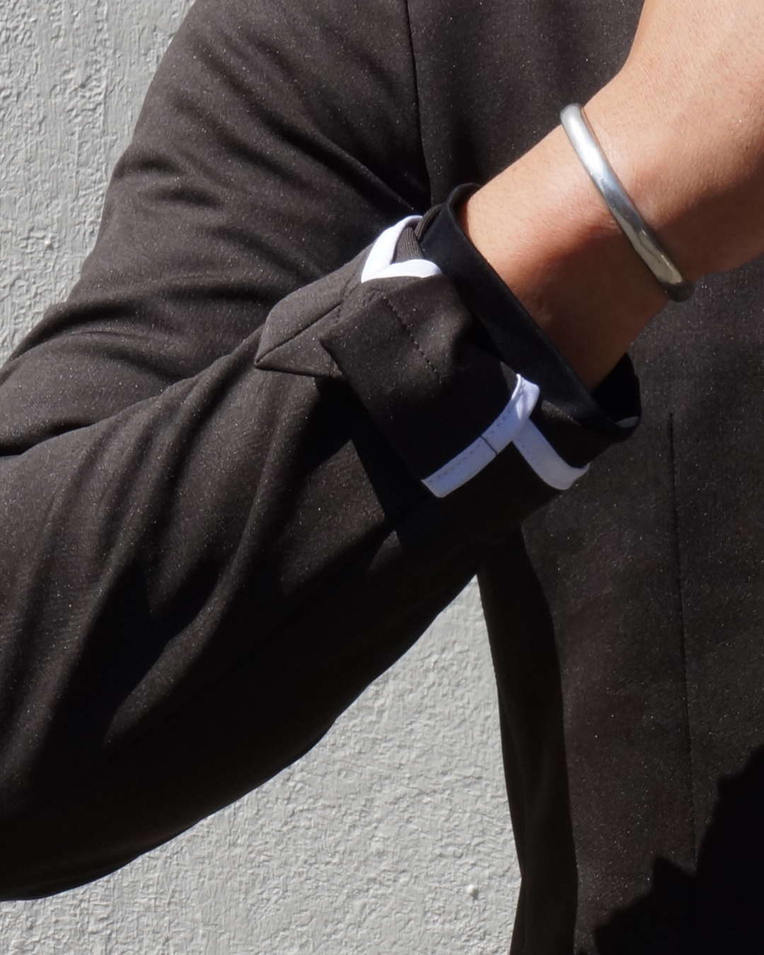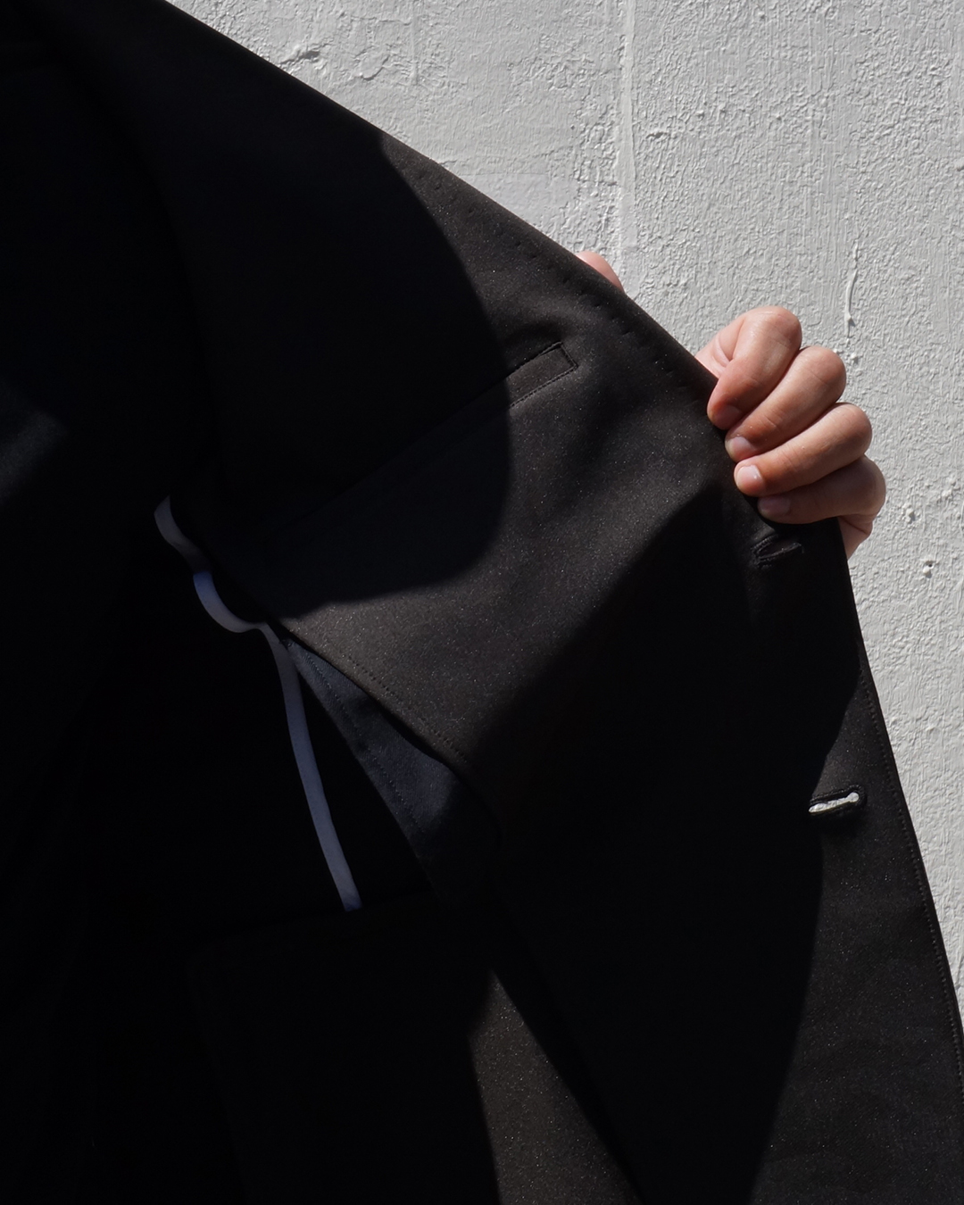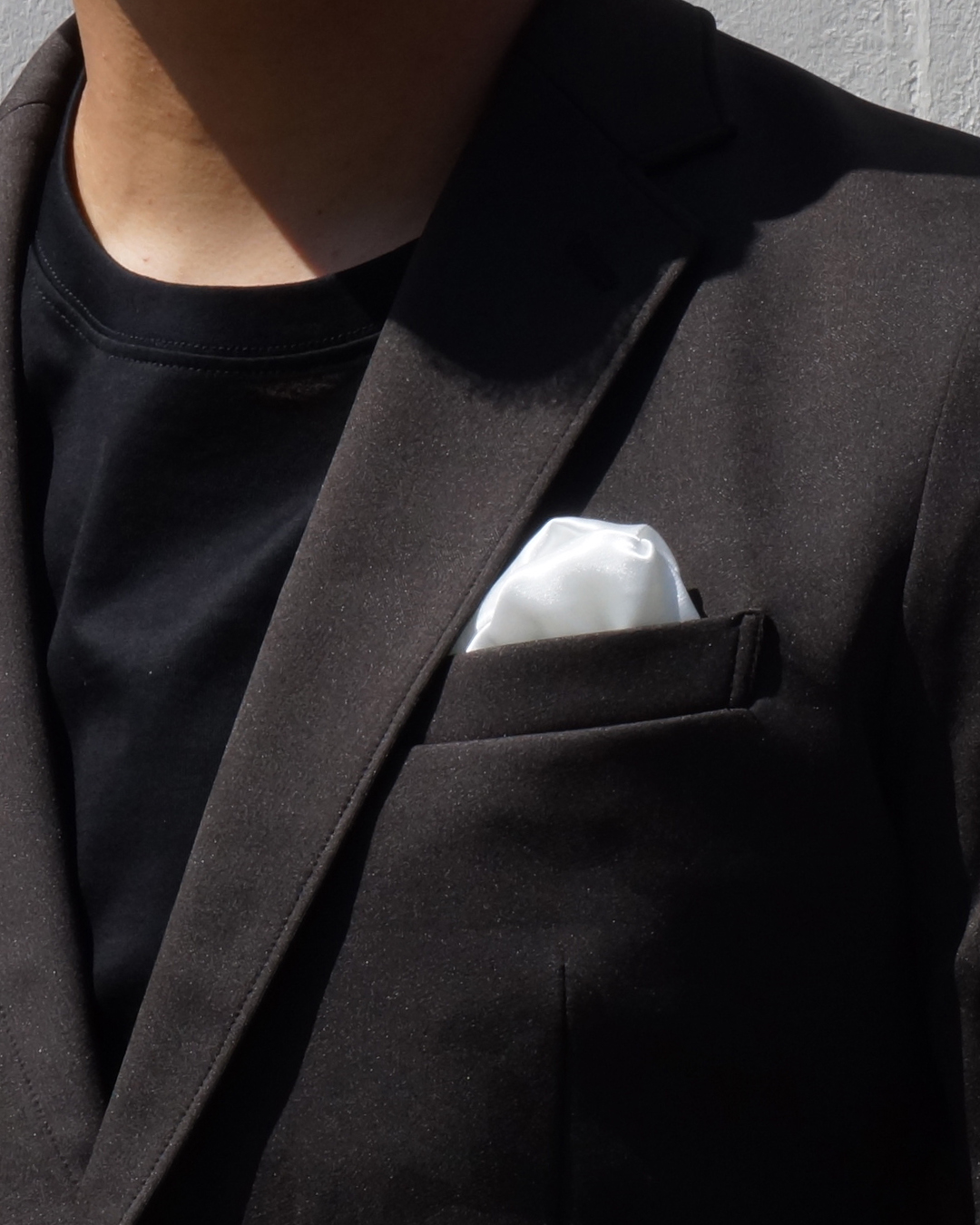 胸ポケットには、ホワイトのチーフを裏地として忍ばせており、ワンアクションで、印象を変える事が可能です。