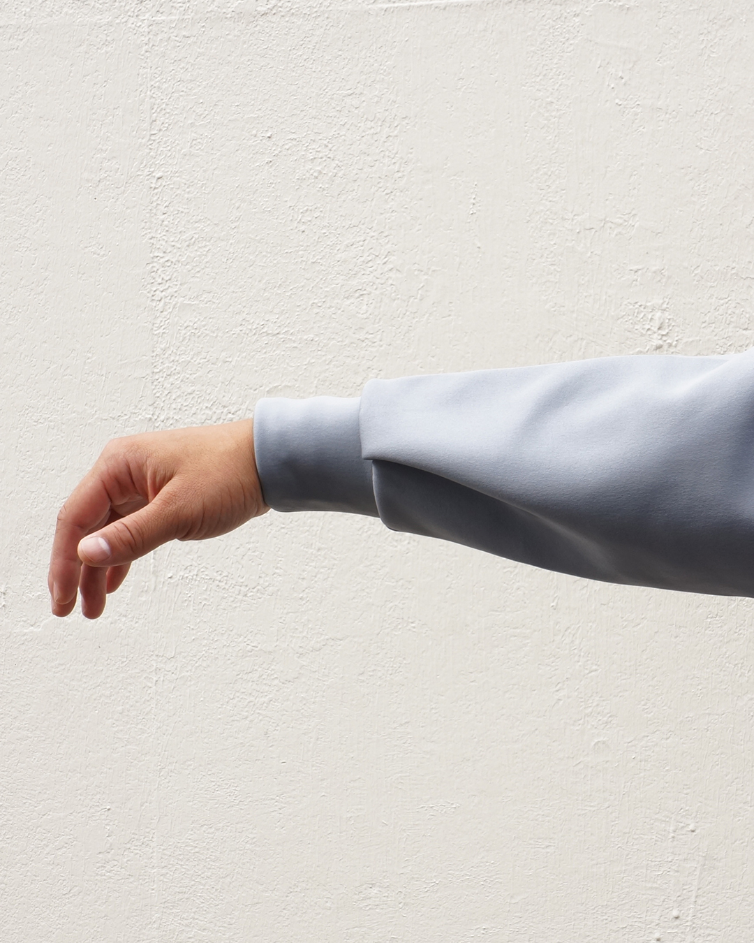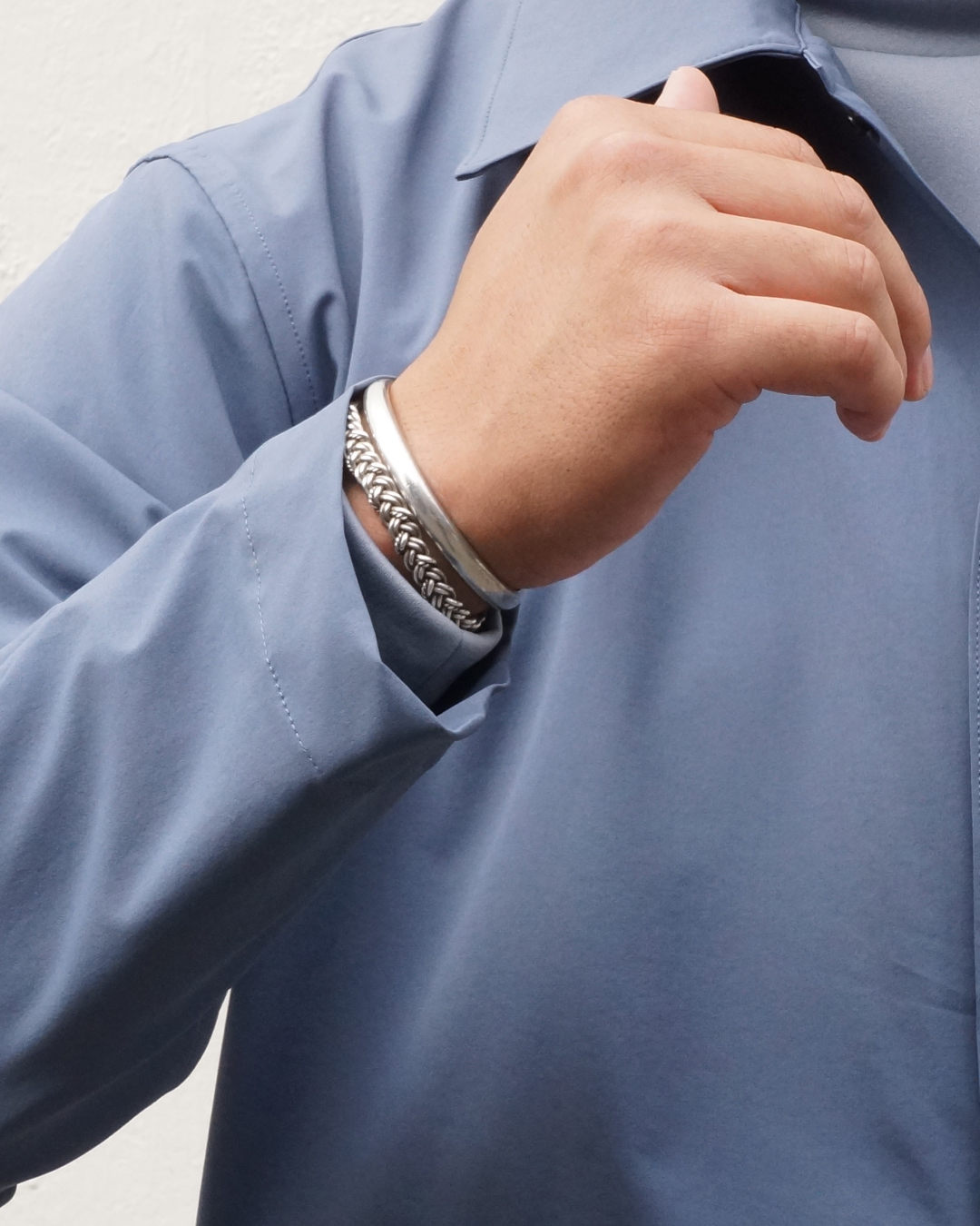 ブルーグレーを活かすイメージで組んだスタイリング。