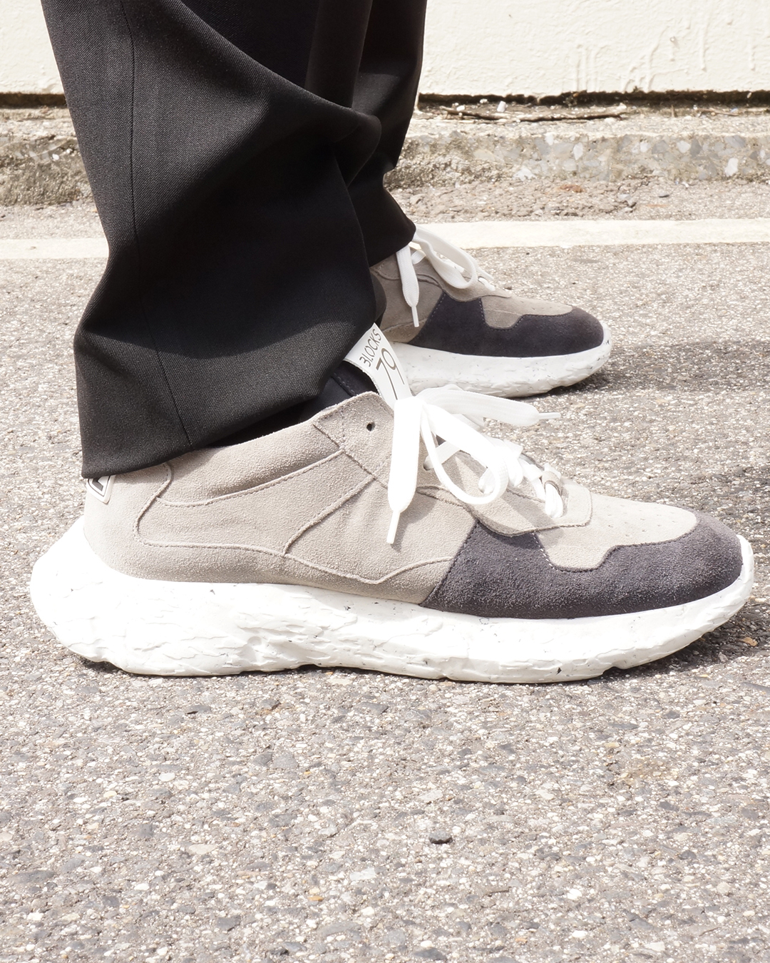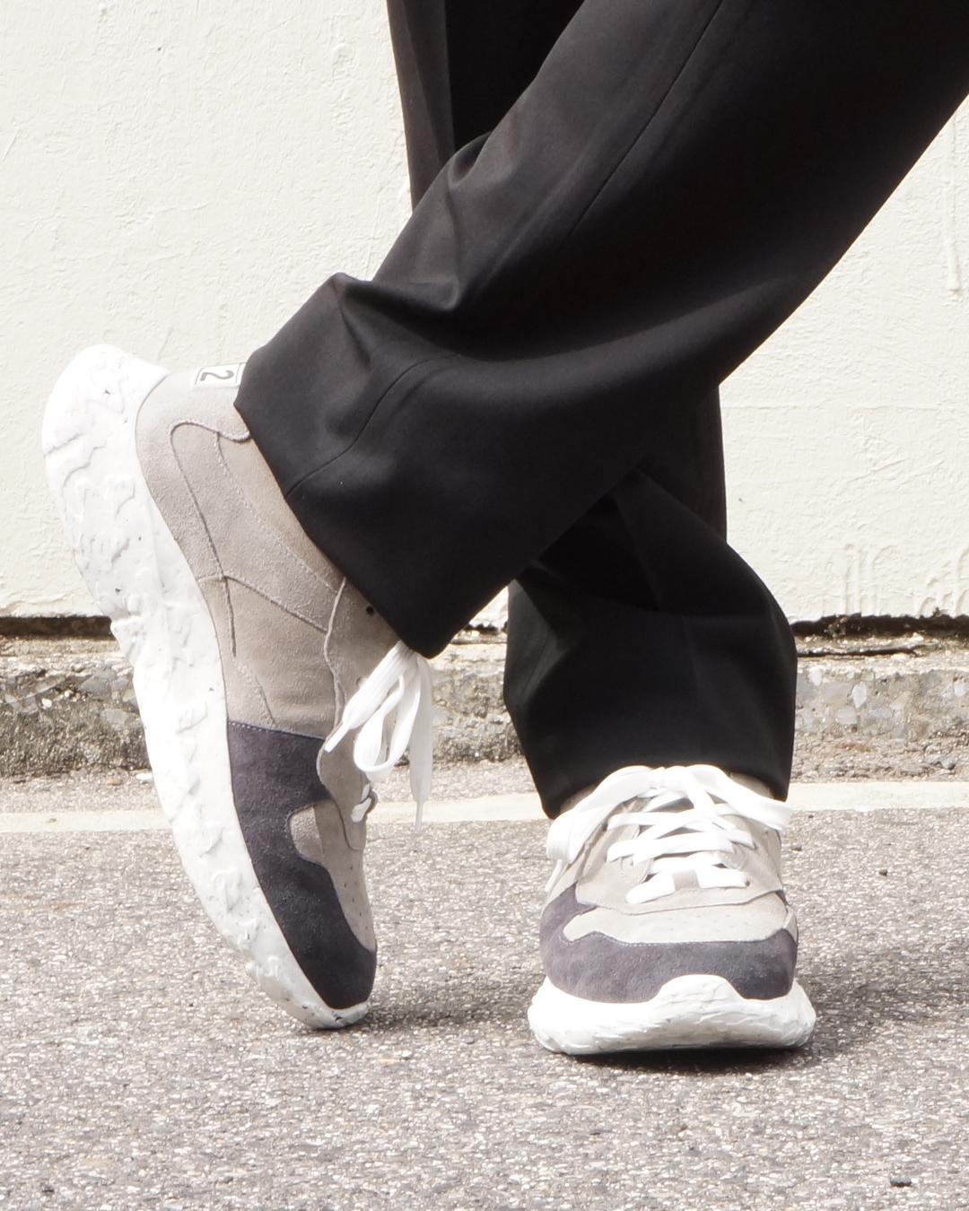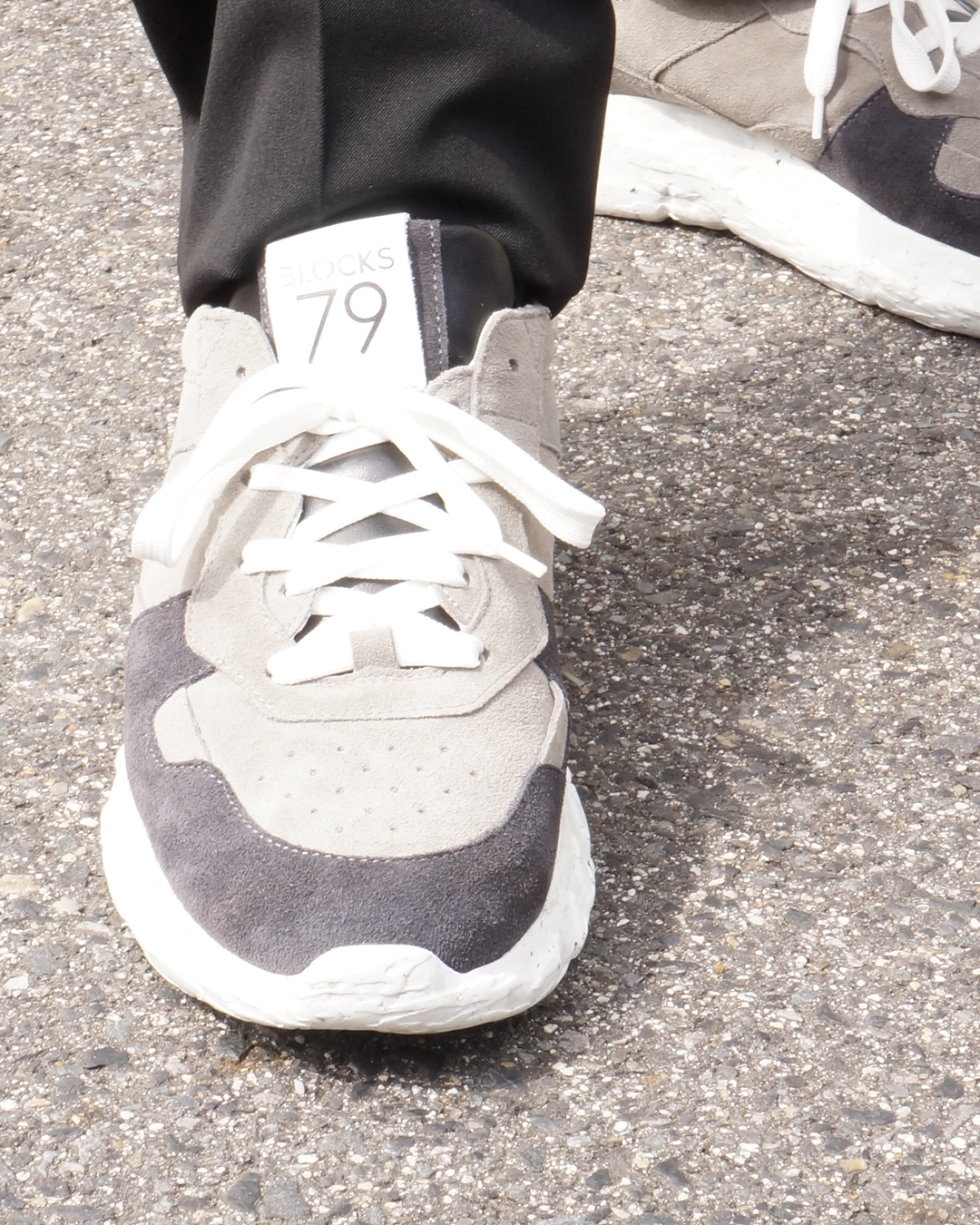 足元はBLOCKS79のチャコールスエードを組み合わせ、