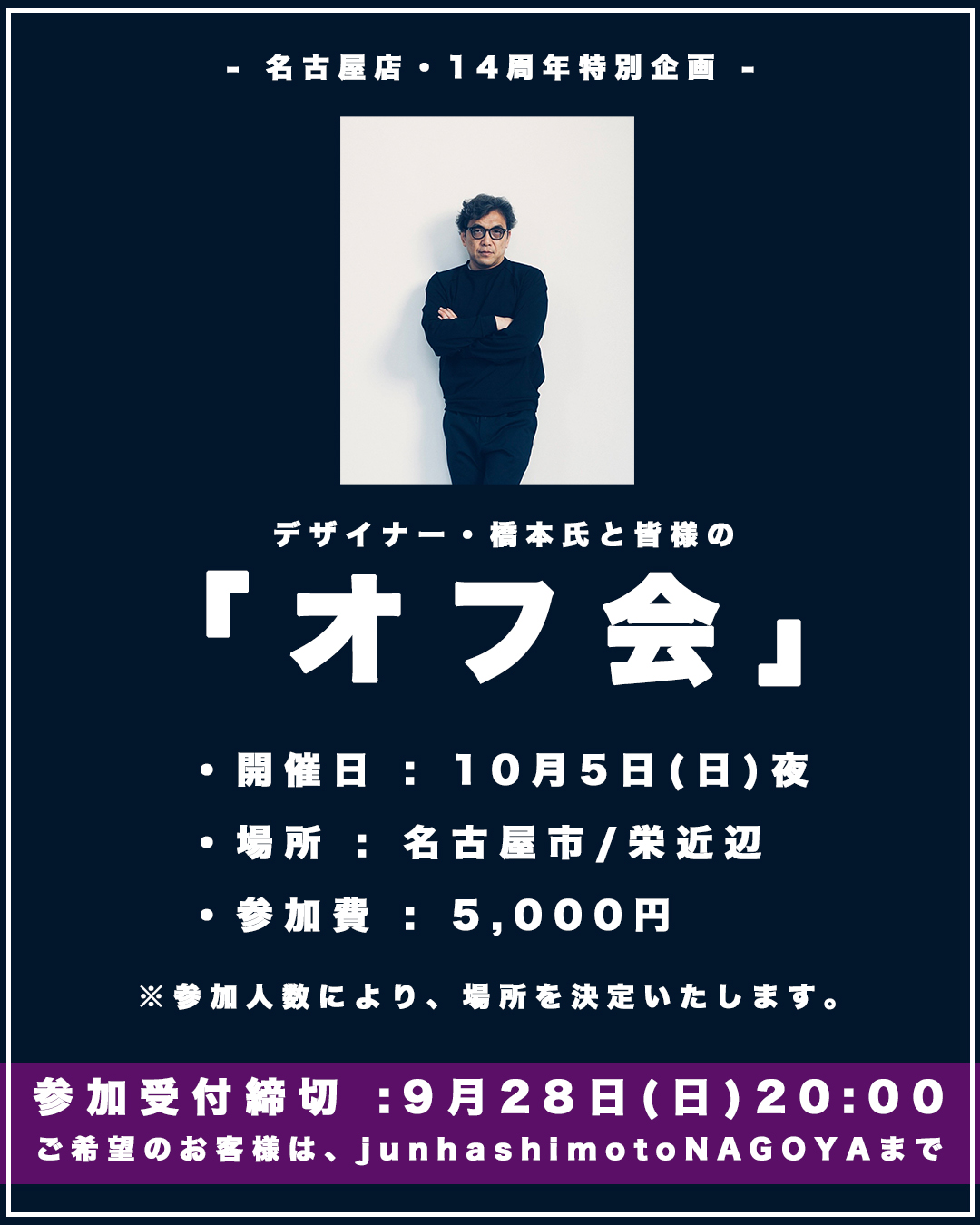 ・10月5日(日)19:00 〜 junhashimotoNAGOYA店から徒歩10分の某飲食店にて開催いたします。(参加者のみにご案内させて頂きます)