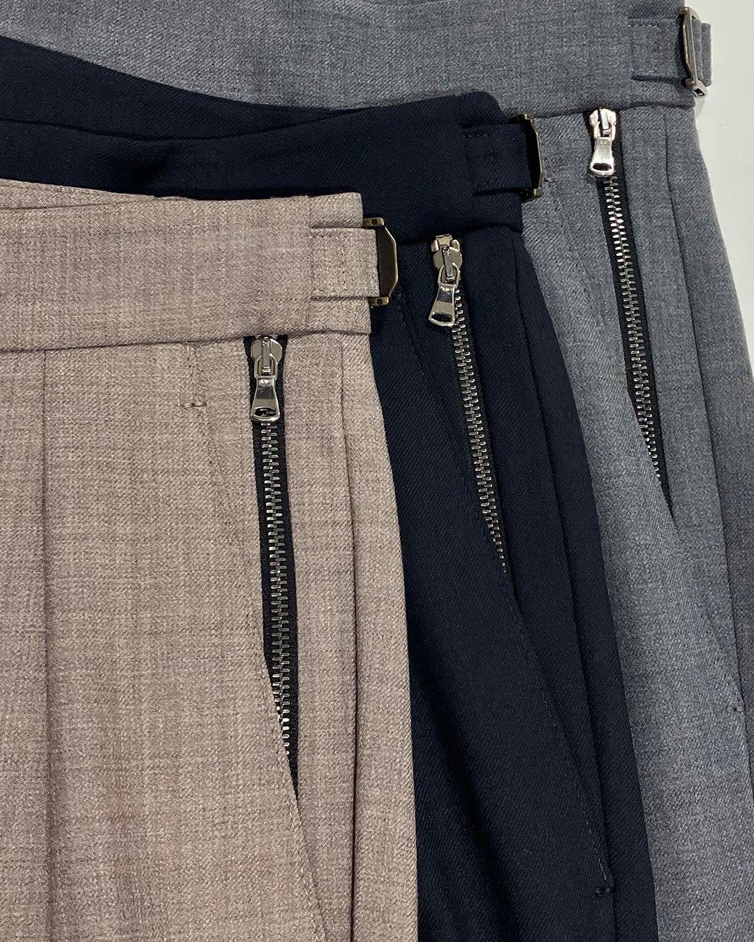 現代風に再構築された2プリーツから生まれる ゆったりとした腰回りに、サイズの微調整が可能なサイド アジャスターを備えていて、裾にかけての綺麗なテーパードが全体のシルエットをスマートに見せます。
