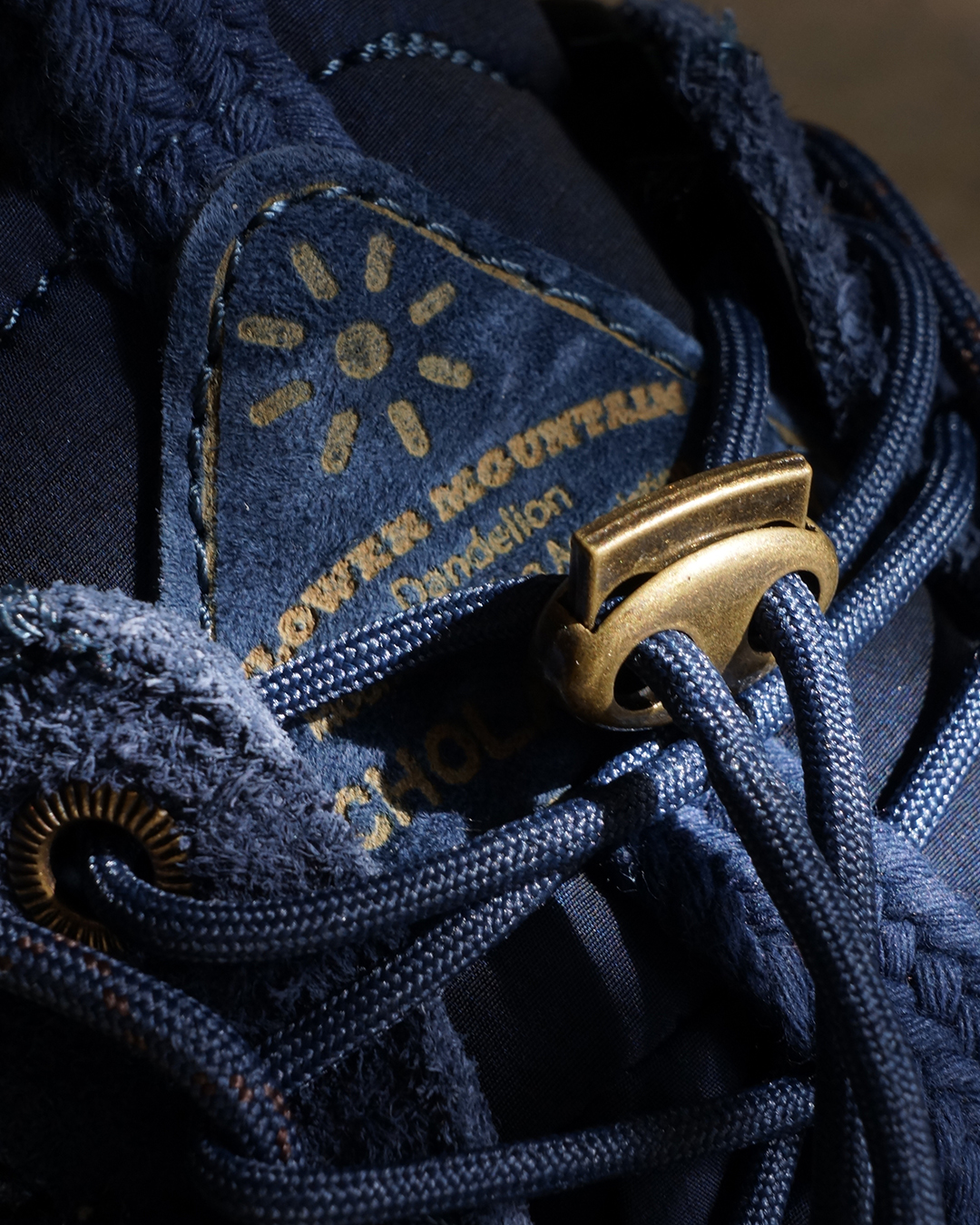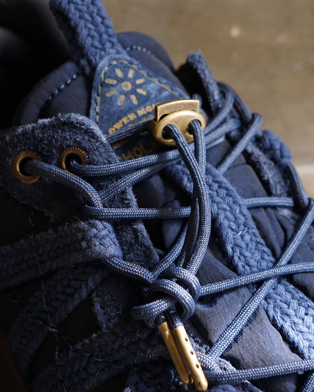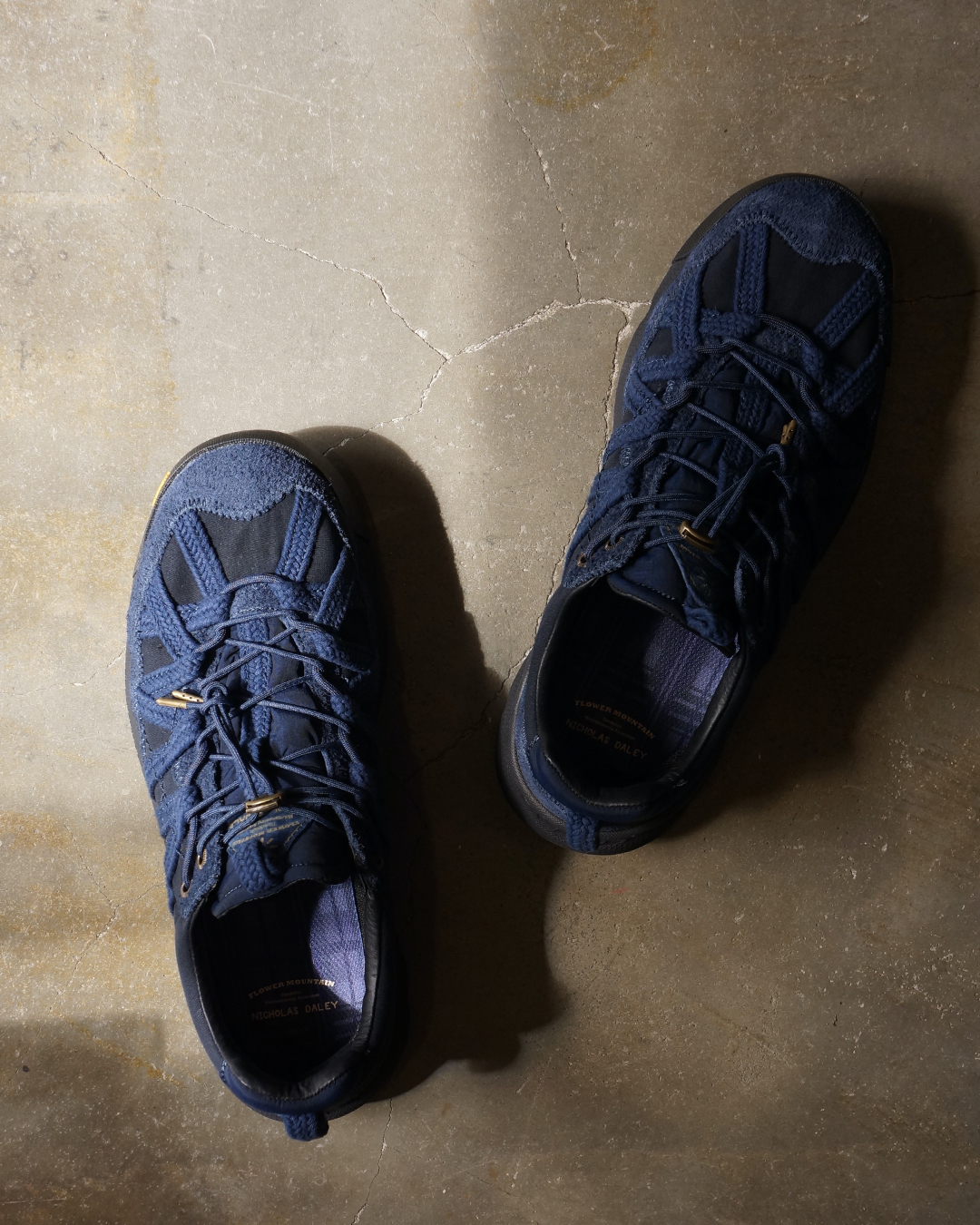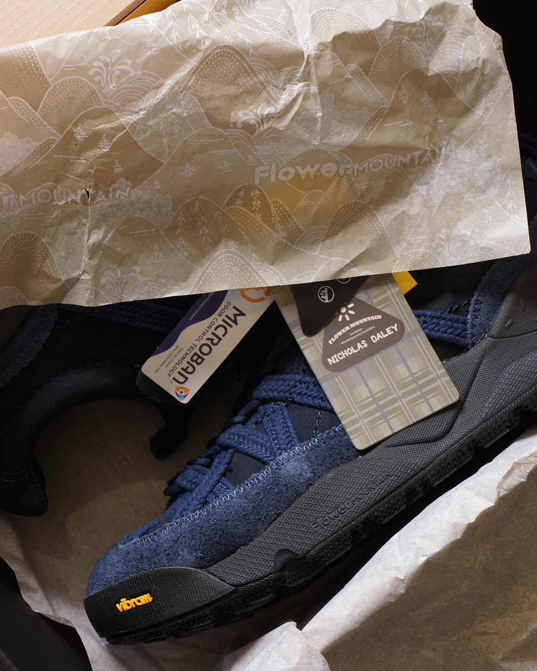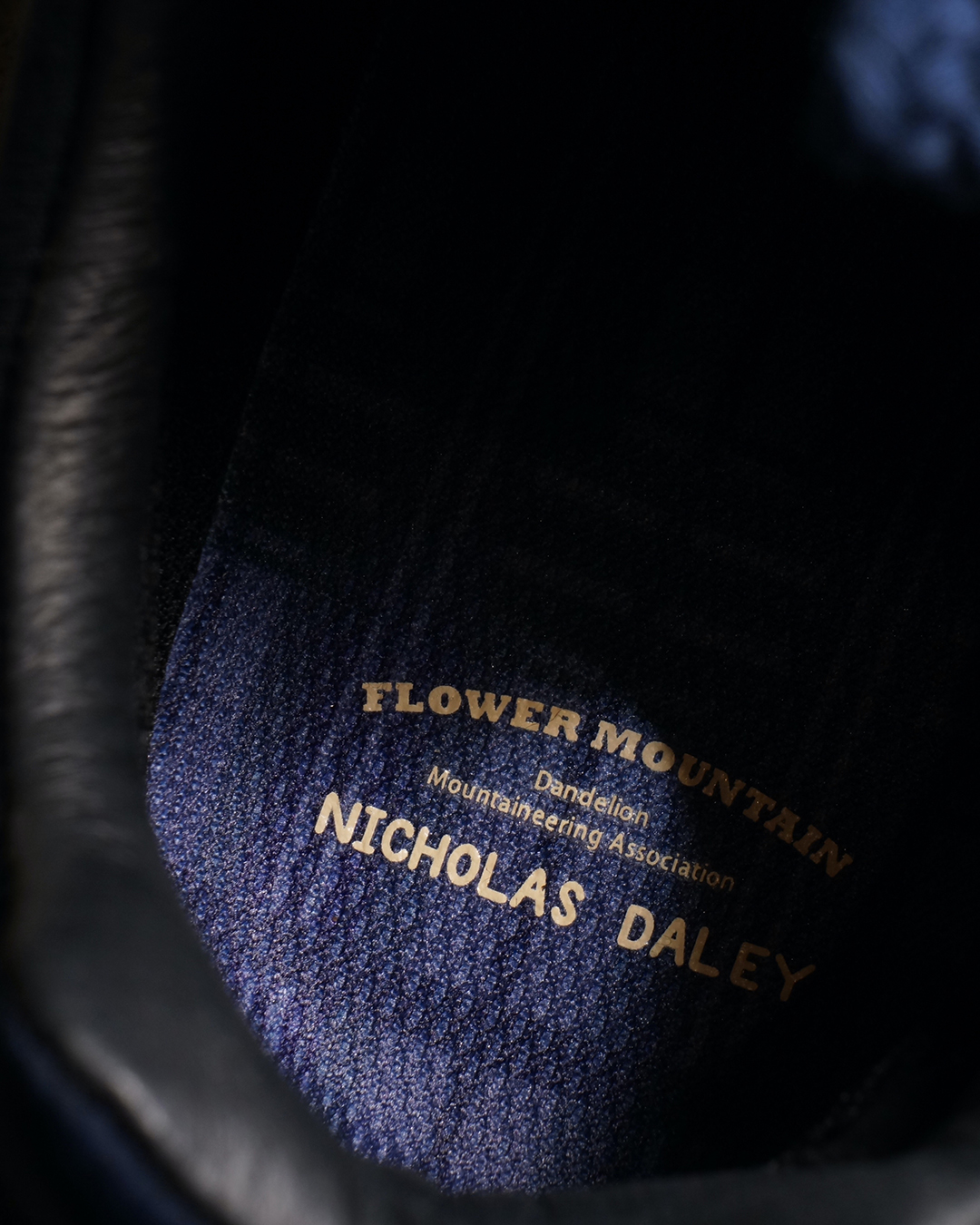 撥水性のある日本製リサイクルナイロンと天然ワックスコットンを組み合わせることで、アウトドアの地形で優れたパフォーマンス特性を実現。ニコラス・デイリーのシグネチャータータンインソール、アンティークブラスのディテール、フラワーマウンテンのシグネチャーデザインのビブラムソールなどで構成されており、その中でも洗練された触感のカスタムコットンへリンポーンテープレースは注目。