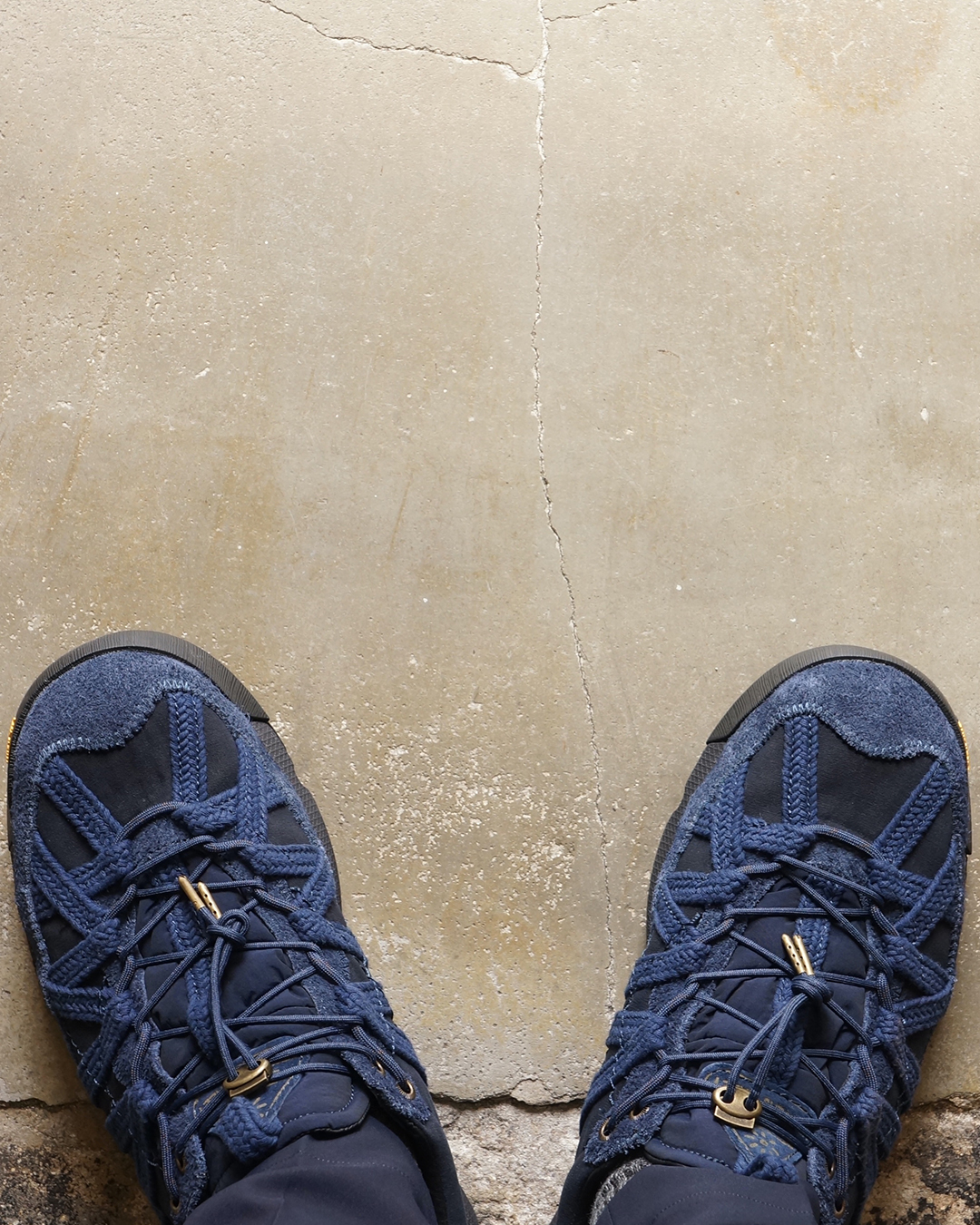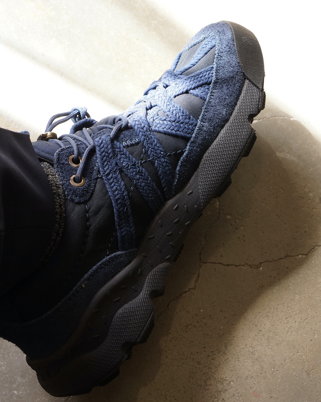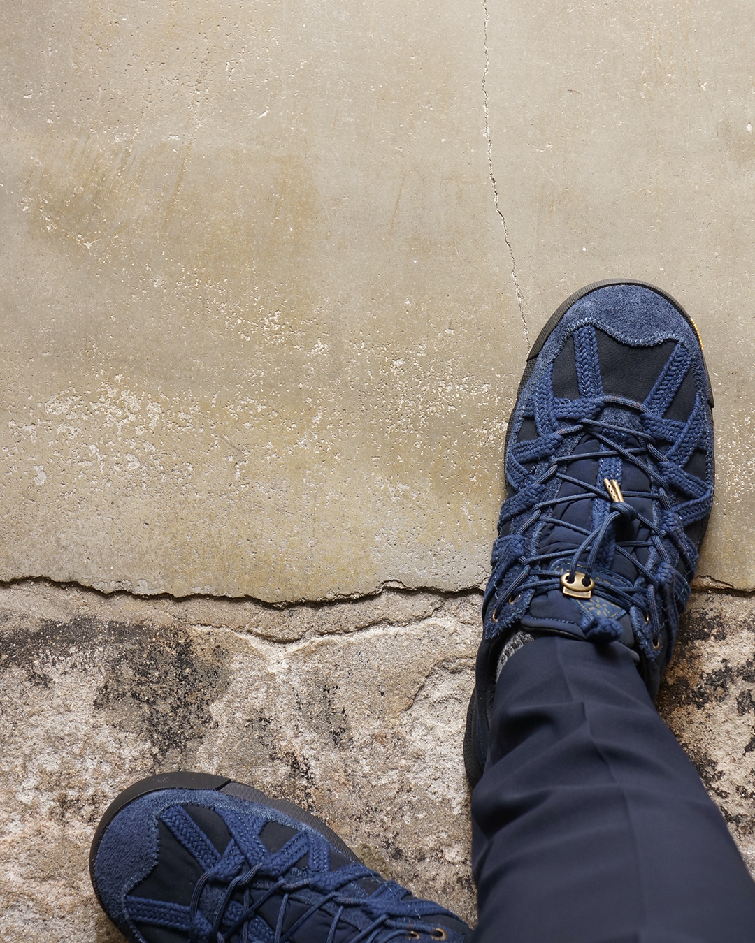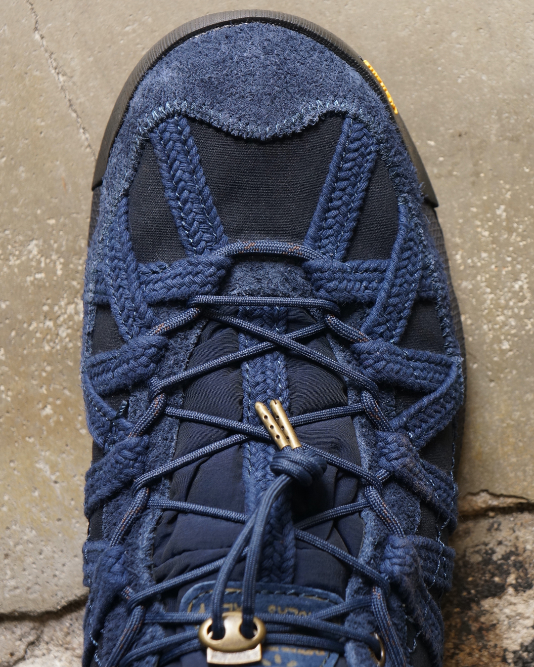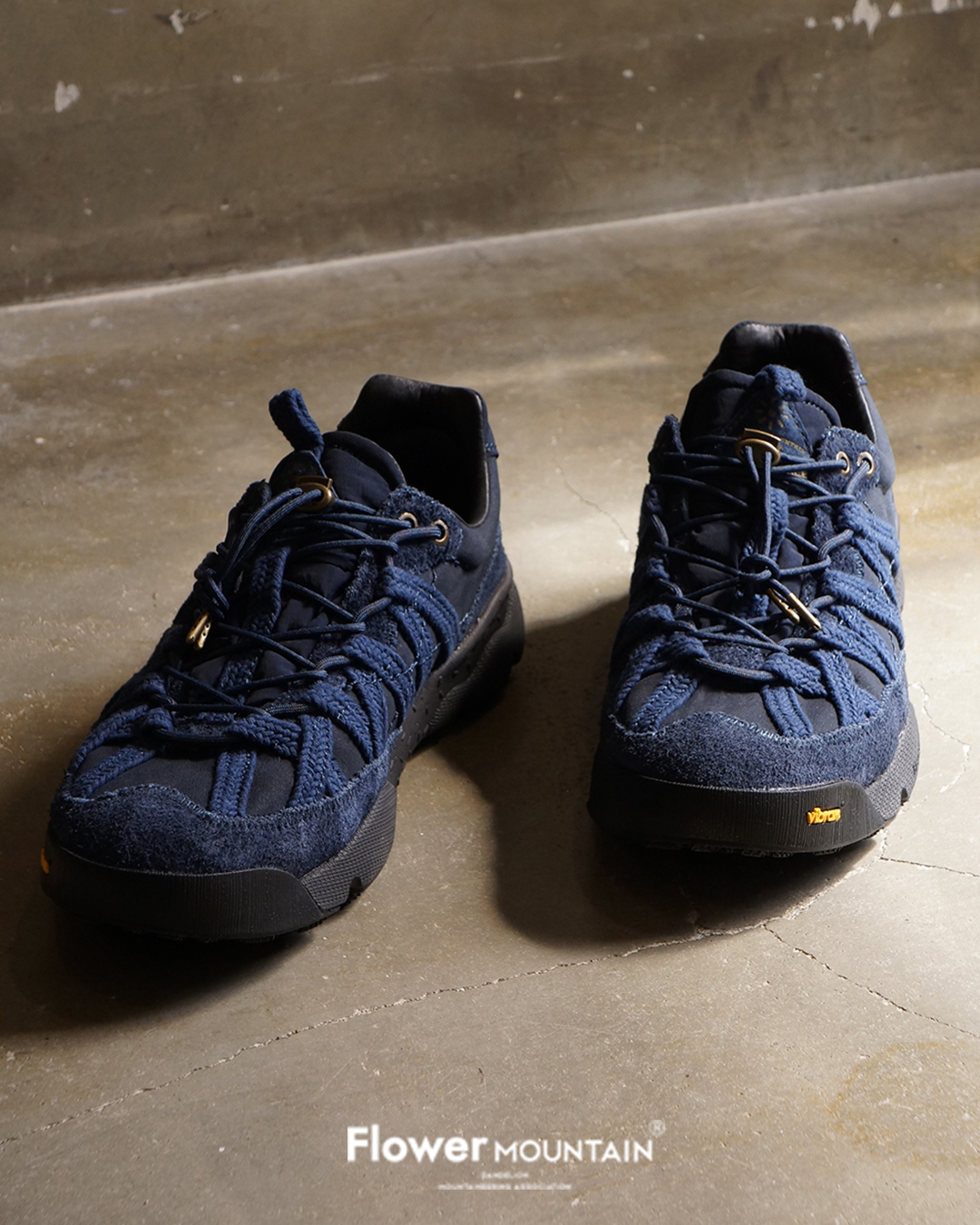 撥水性のある日本製リサイクルナイロンと天然ワックスコットンを組み合わせることで、アウトドアの地形で優れたパフォーマンス特性を実現。ニコラス・デイリーのシグネチャータータンインソール、アンティークブラスのディテール、フラワーマウンテンのシグネチャーデザインのビブラムソールなどで構成されており、その中でも洗練された触感のカスタムコットンへリンポーンテープレースは注目。