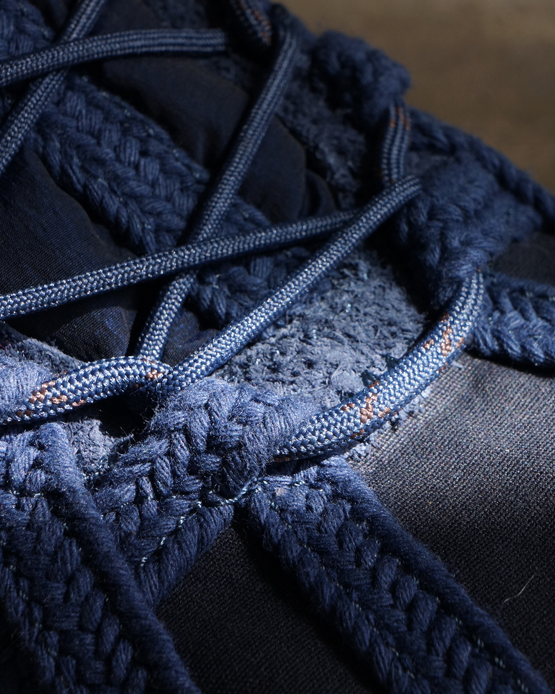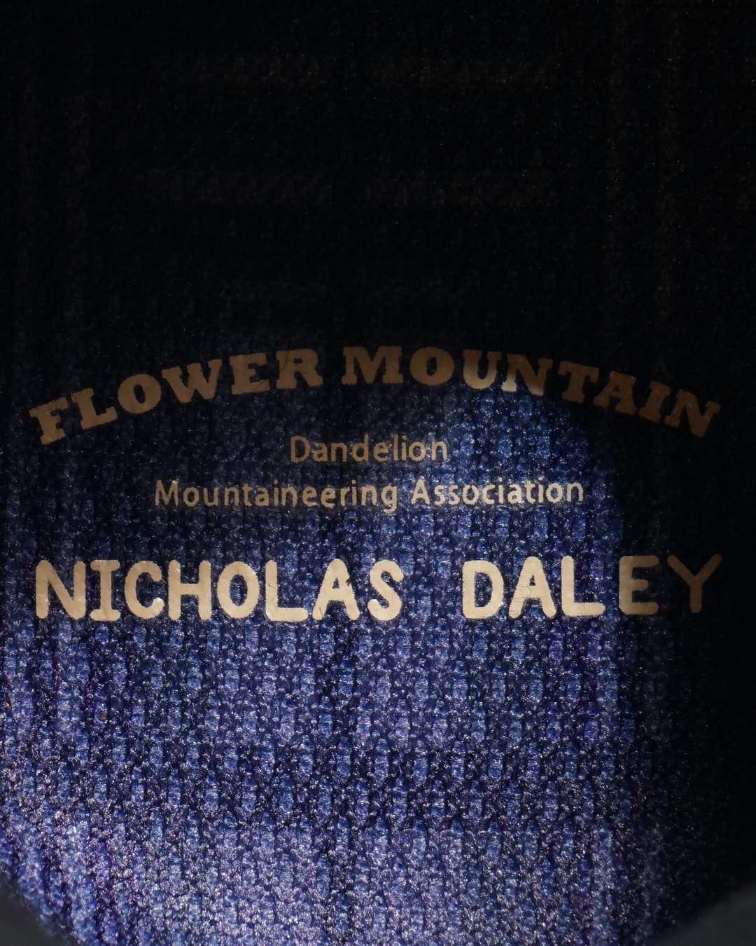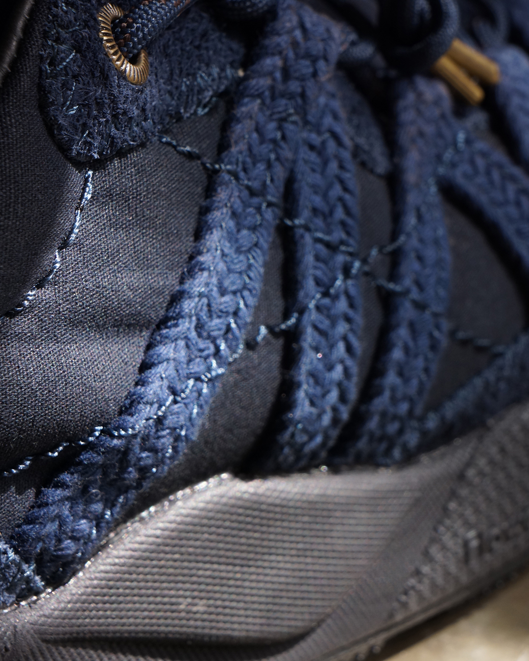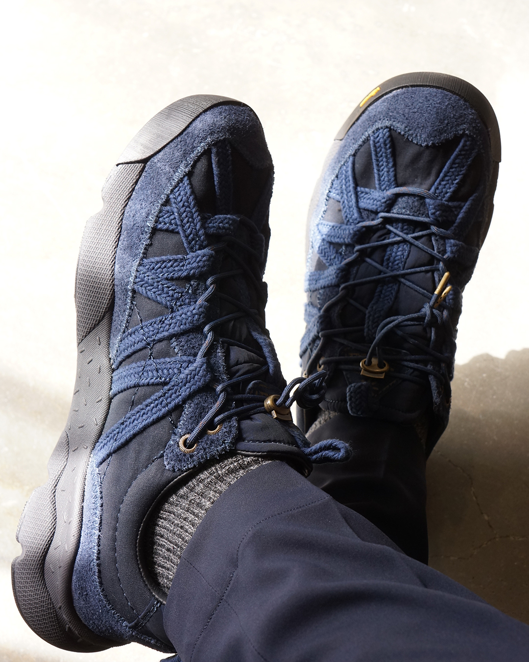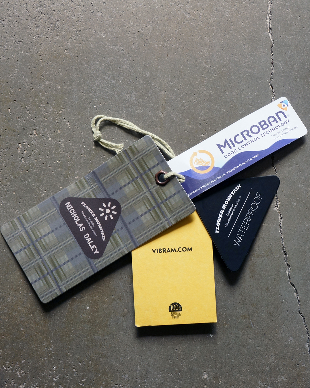 撥水性のある日本製リサイクルナイロンと天然ワックスコットンを組み合わせることで、アウトドアの地形で優れたパフォーマンス特性を実現。ニコラス・デイリーのシグネチャータータンインソール、アンティークブラスのディテール、フラワーマウンテンのシグネチャーデザインのビブラムソールなどで構成されており、その中でも洗練された触感のカスタムコットンへリンポーンテープレースは注目。