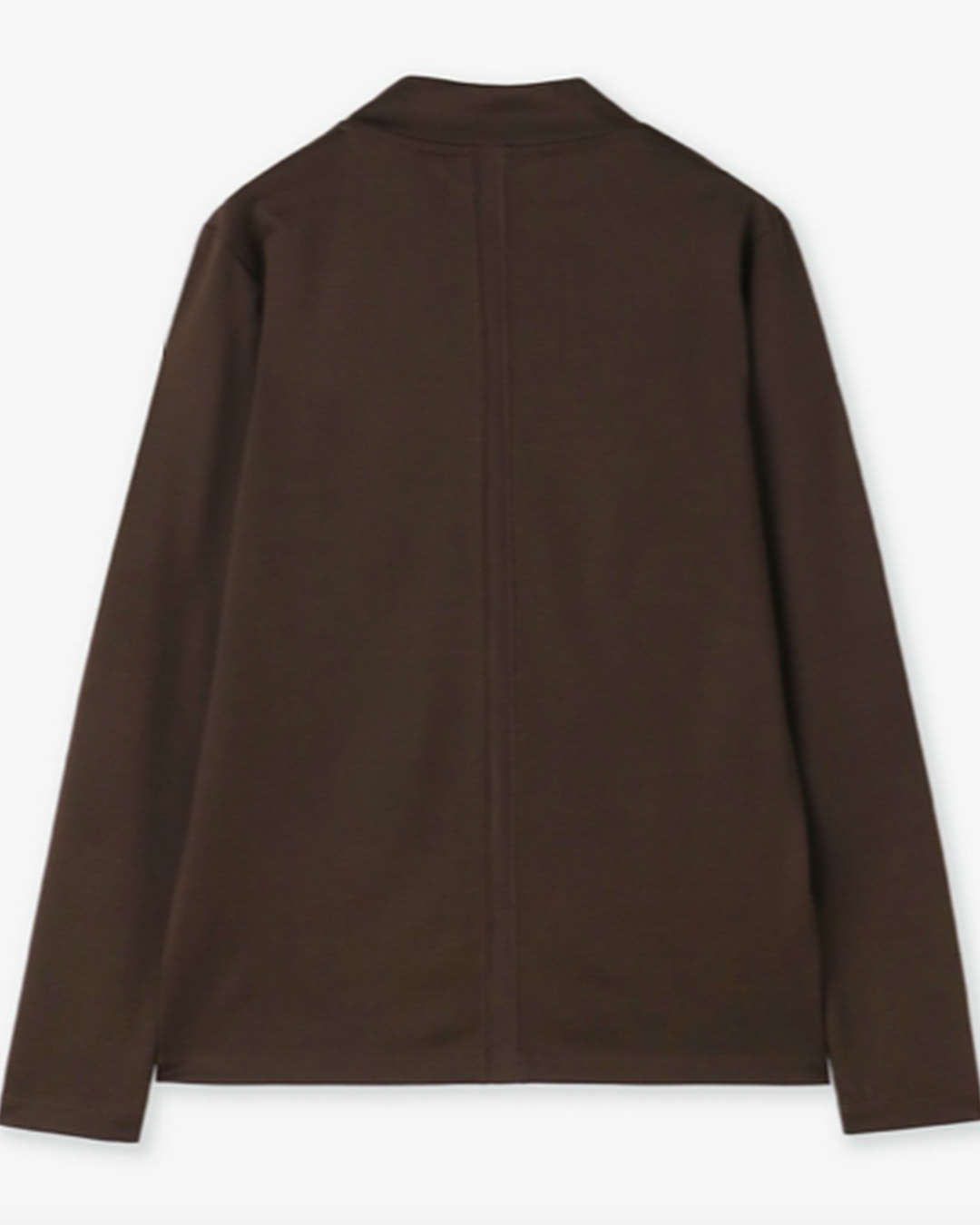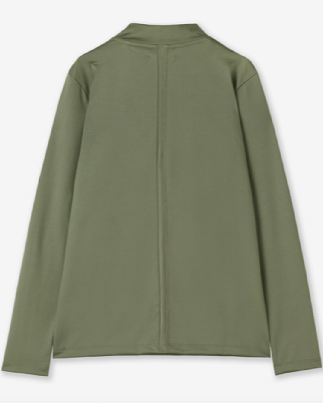 デザインも、モックネックの程良い高さの襟が、首周りを柔らかいフィット感で包み込んで、長時間の着用でも首が疲れにくく、首から肩、腕にかけてのシルエットは、エレガントな雰囲気を感じさせます。