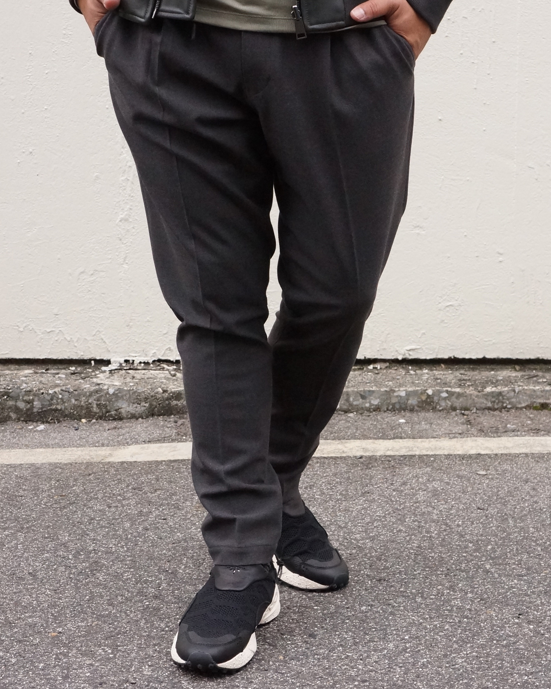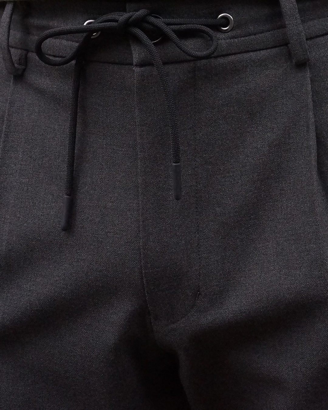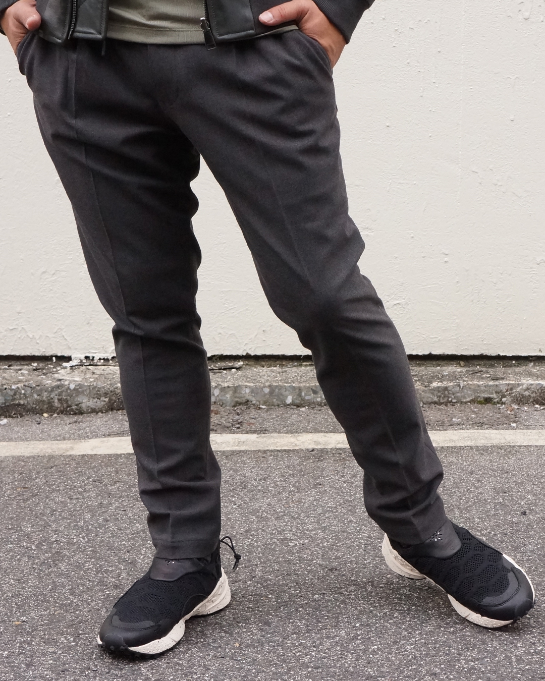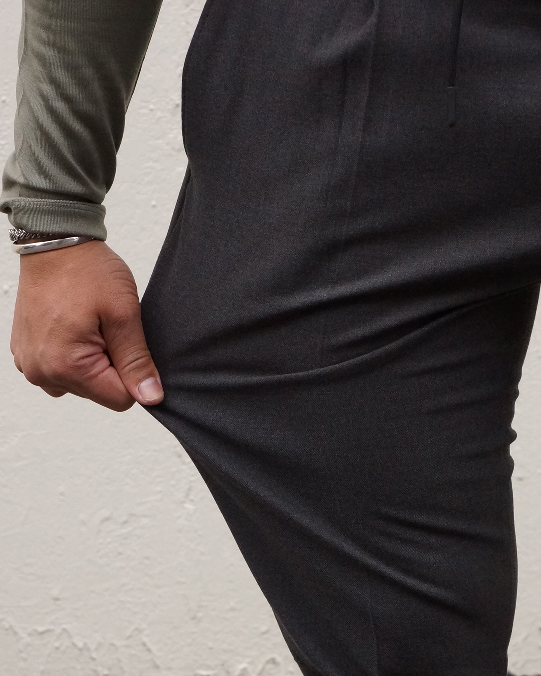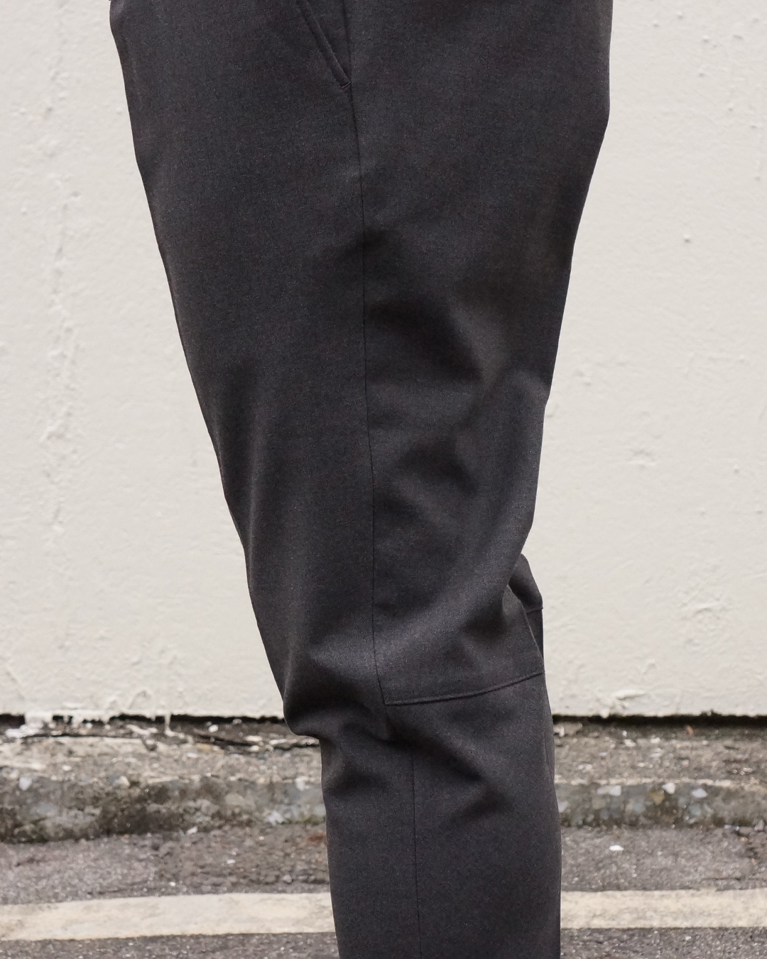 タックによる腿周りのゆとりと、膝下のビシッとしたメリハリの利いたシルエット。