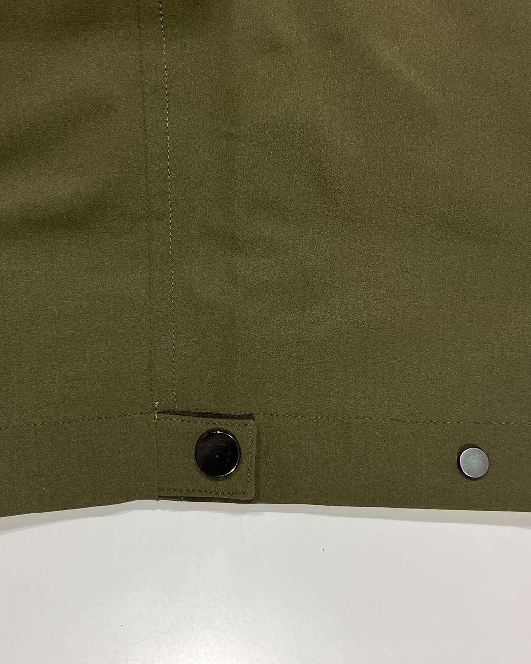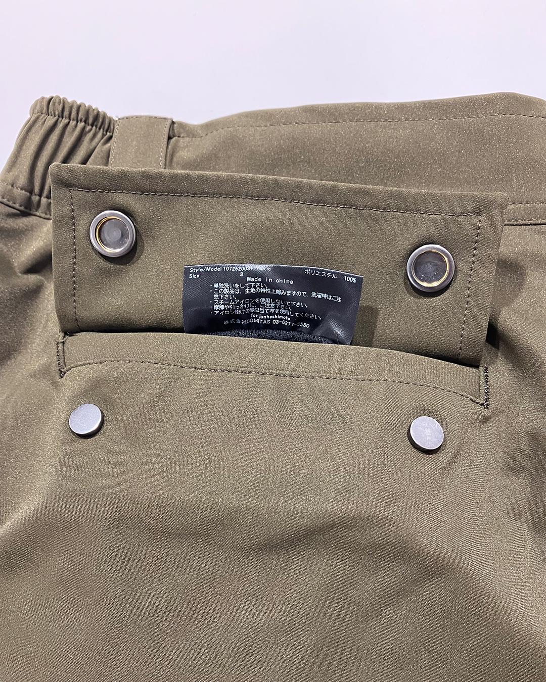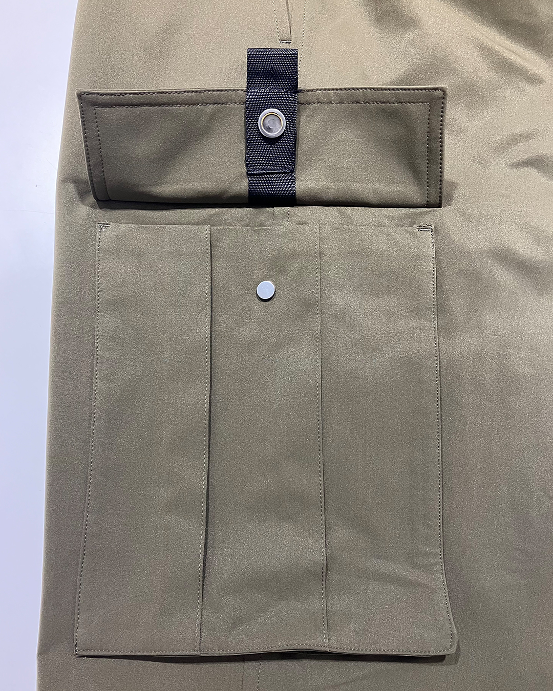 その全体のラインを引き締めるかのように、裾口のドットボタンで裾周りを調整できる機能を持っていて、合わせるシューズによって使い分けることが可能です。