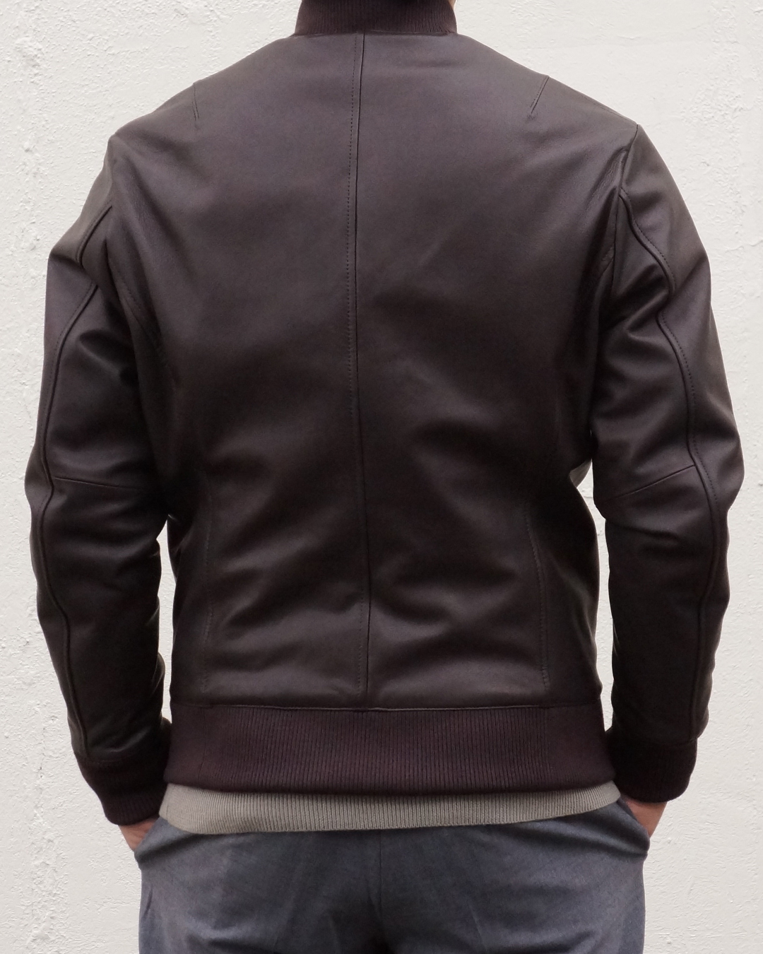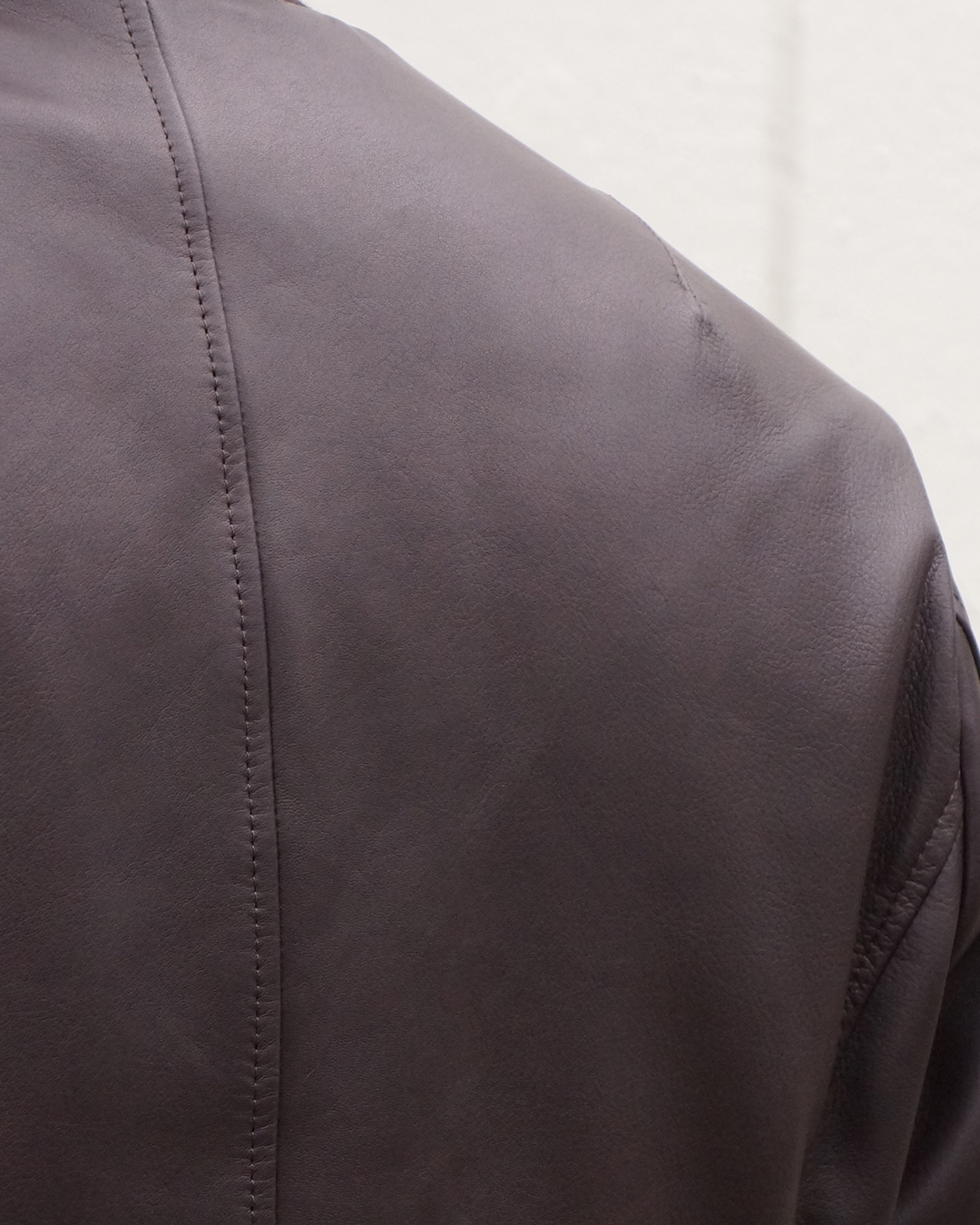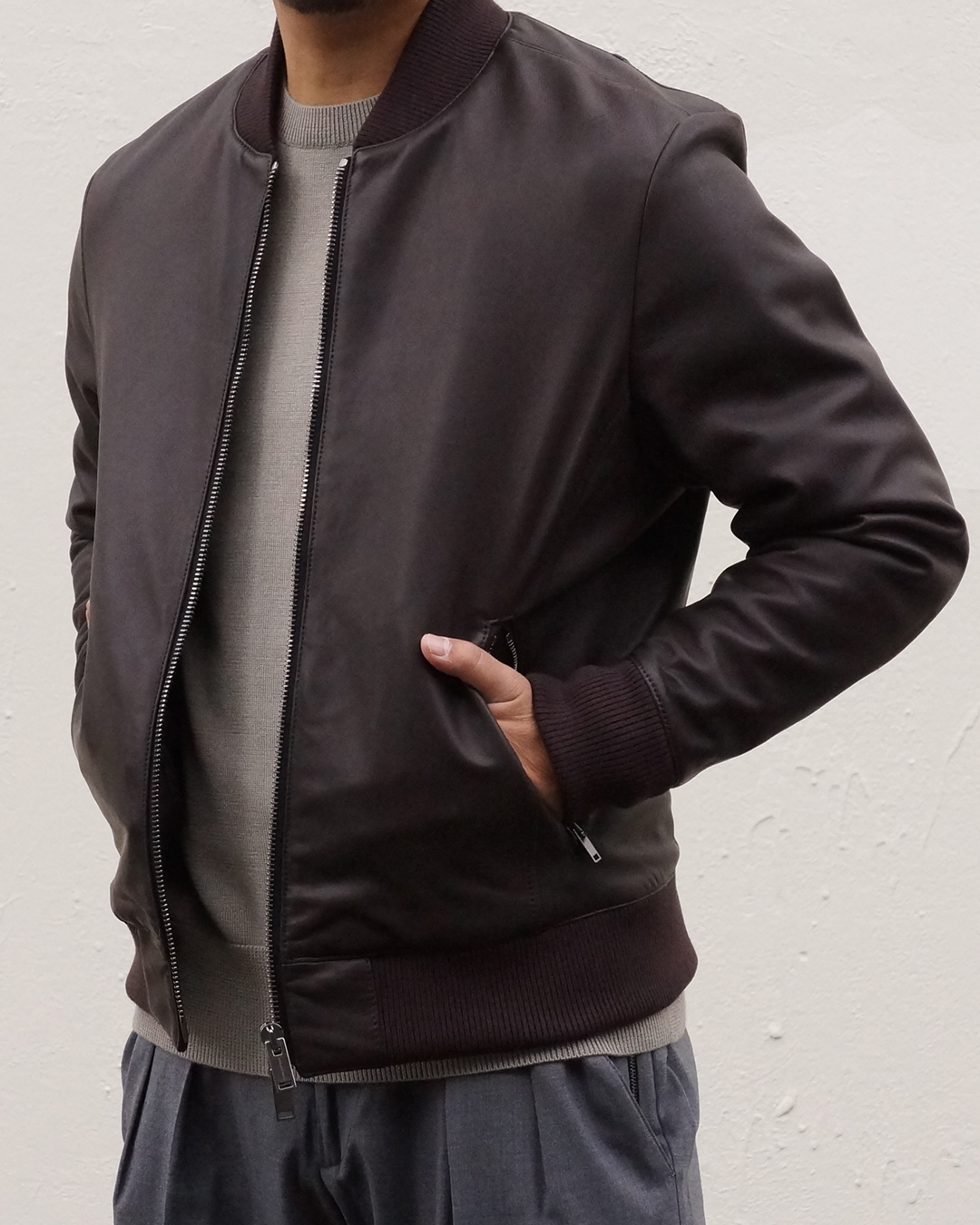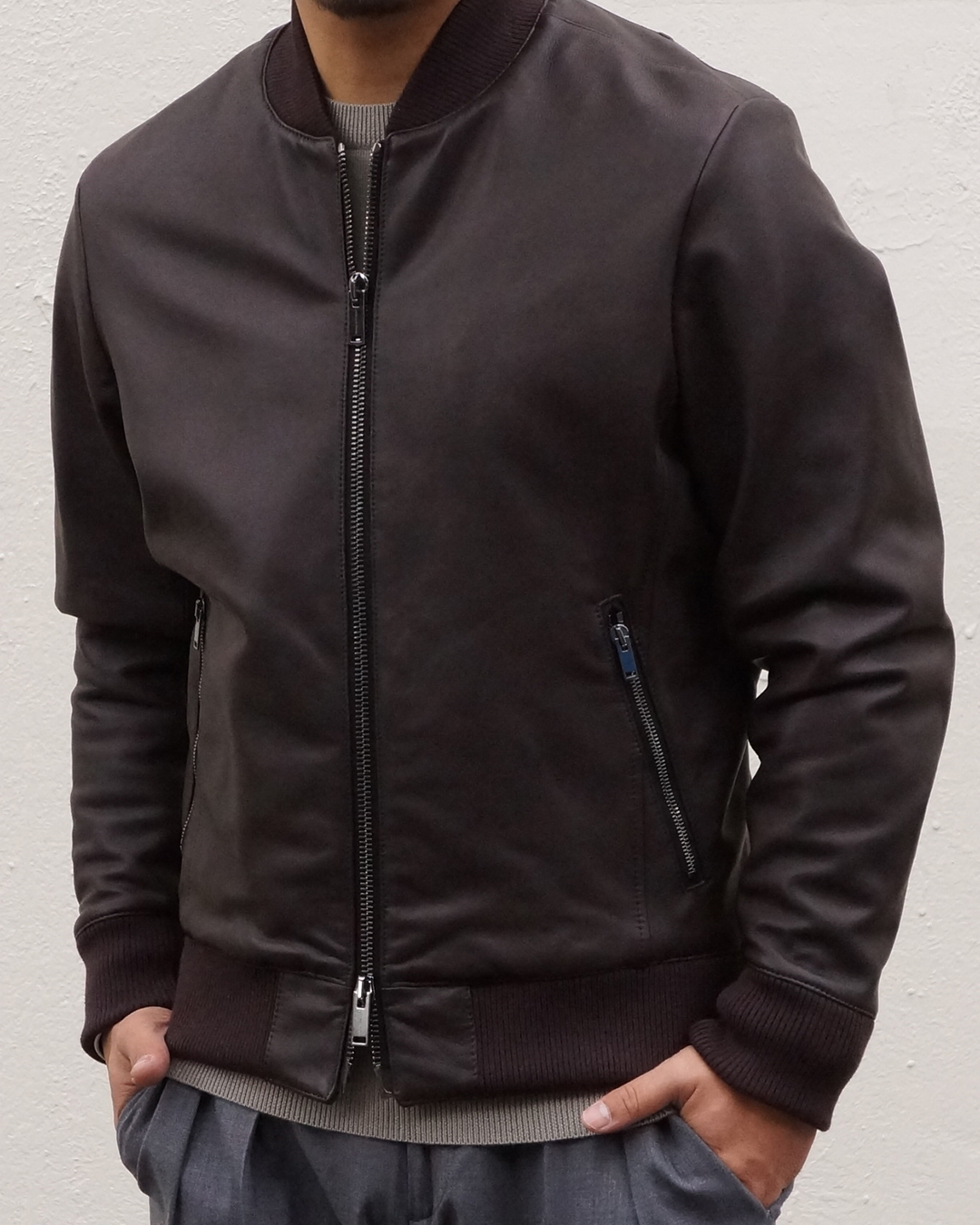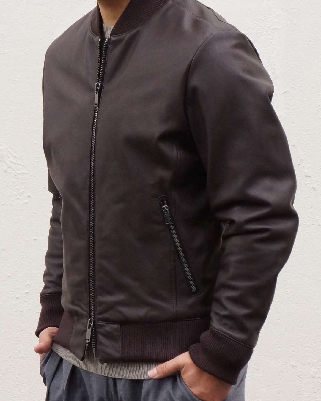 渋くて優しい印象のダークブラウンで染め上げた、シープレザーのMA-1。