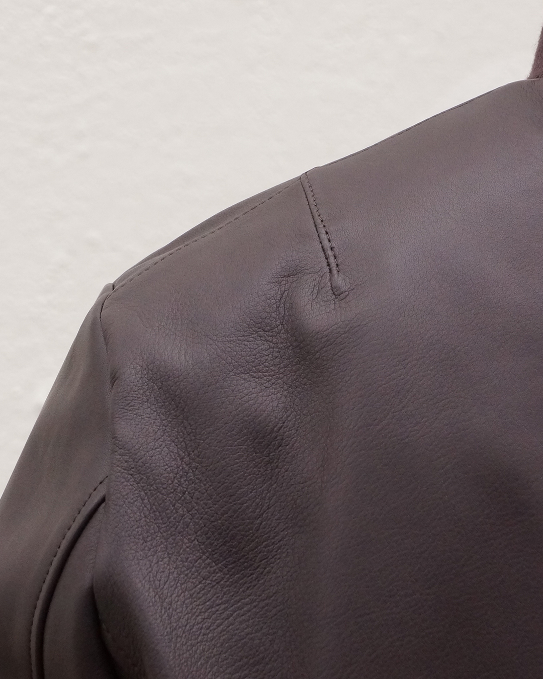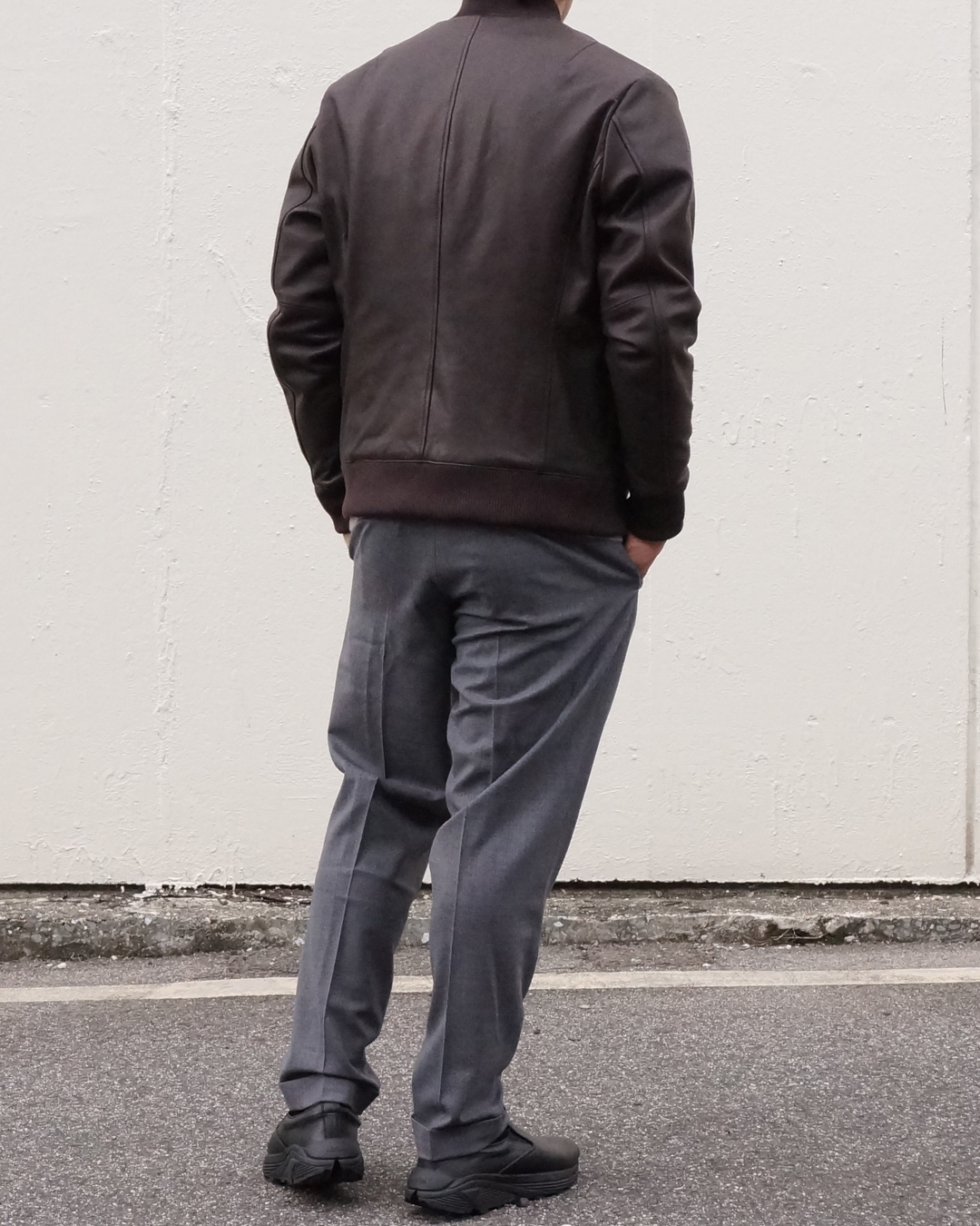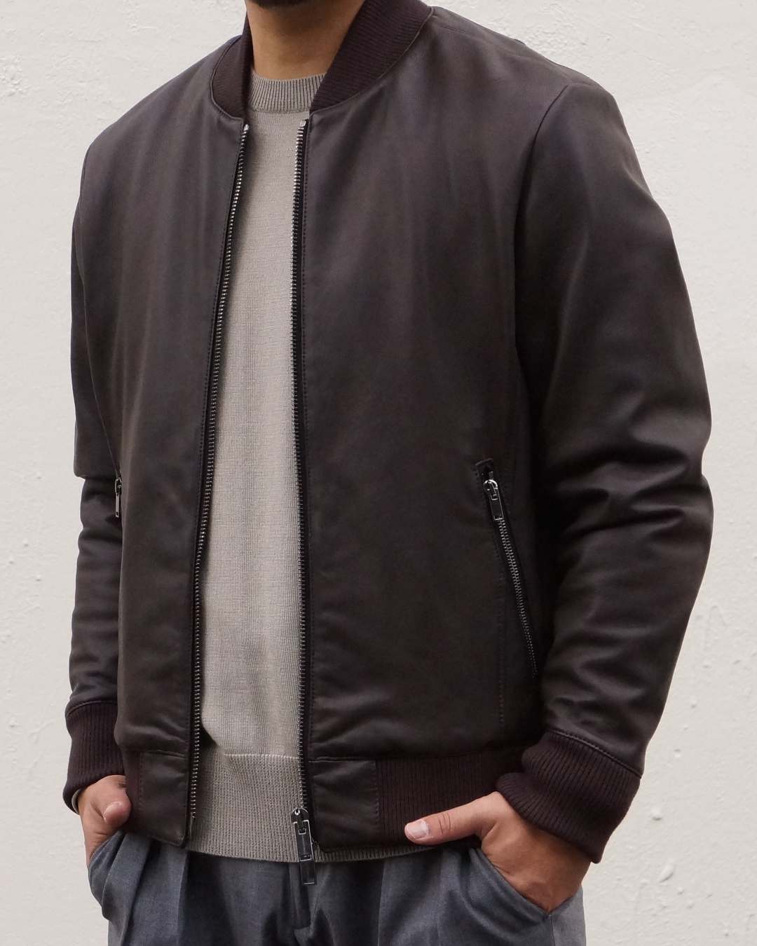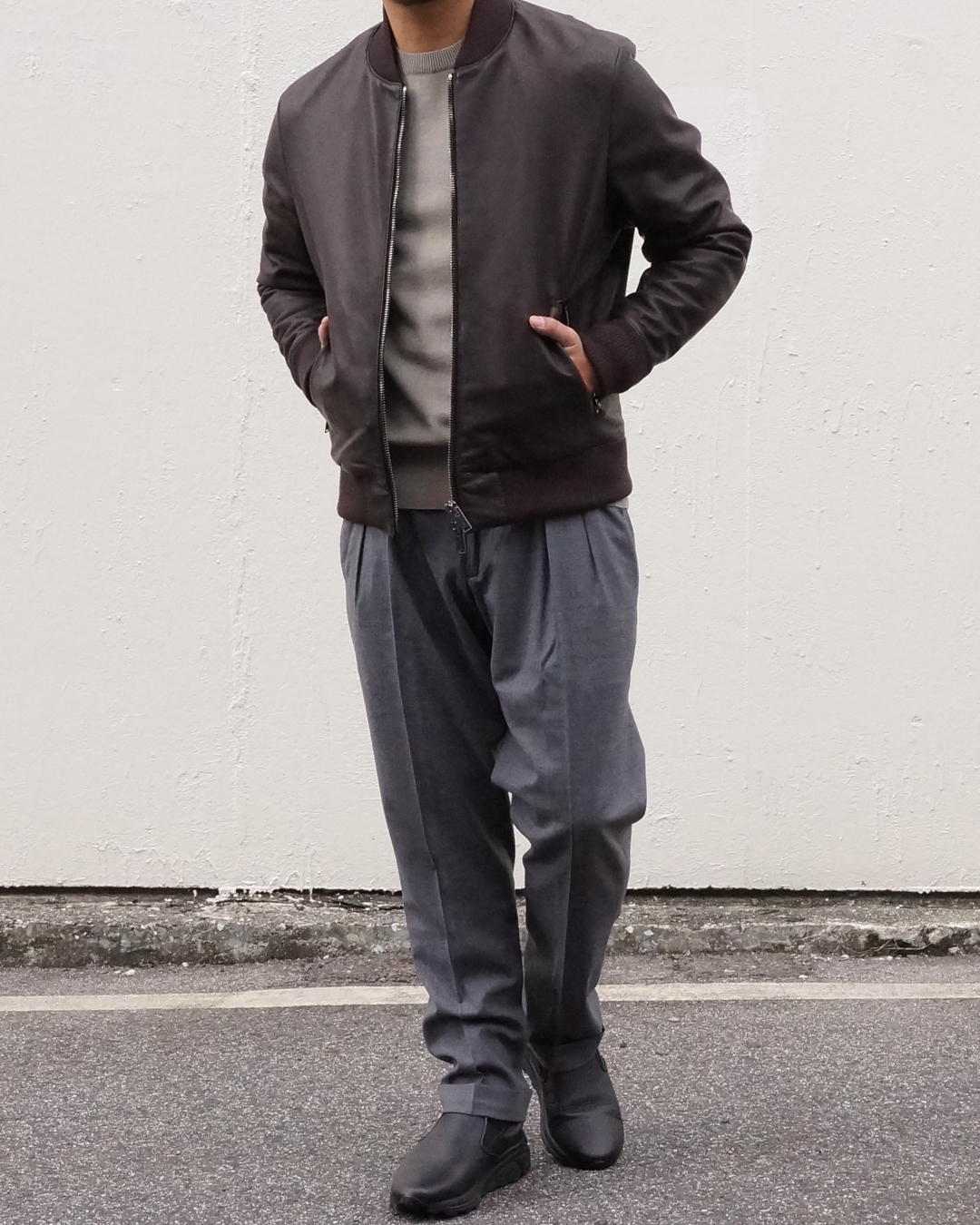 渋くて優しい印象のダークブラウンで染め上げた、シープレザーのMA-1。