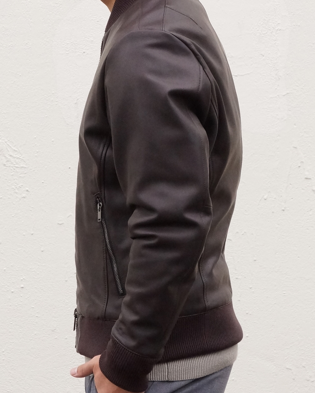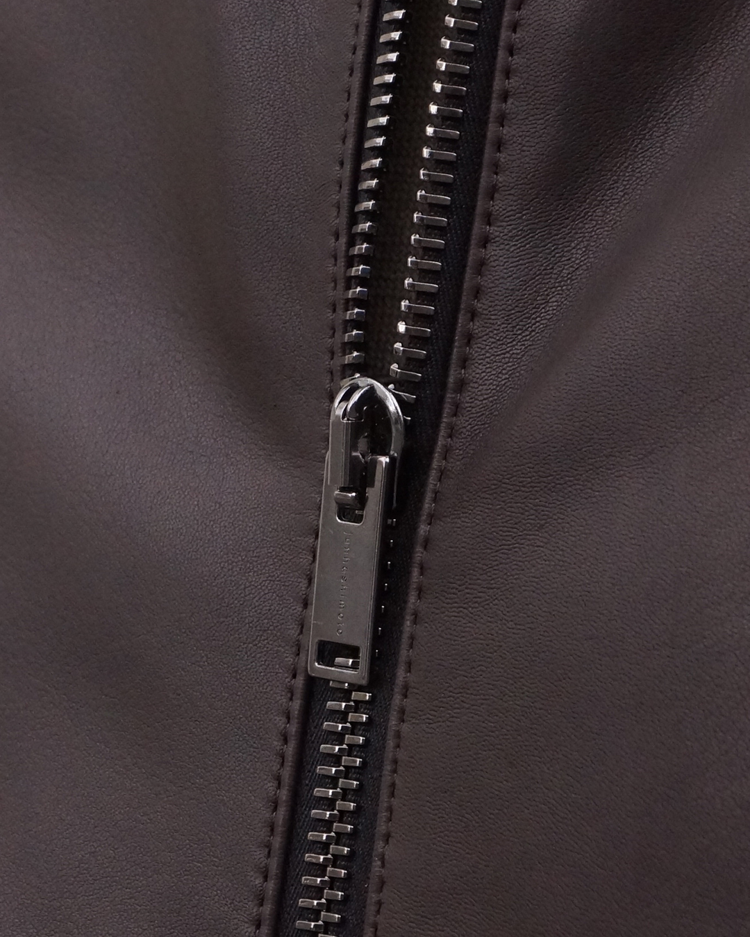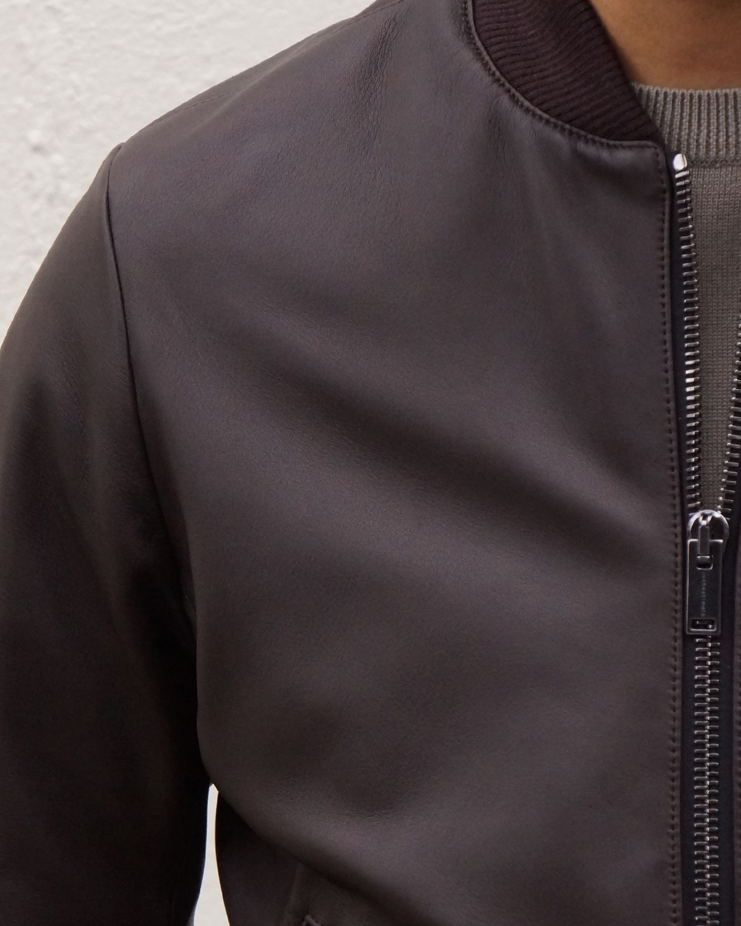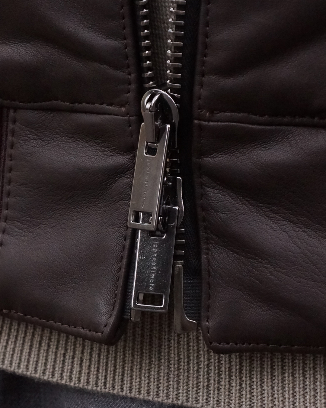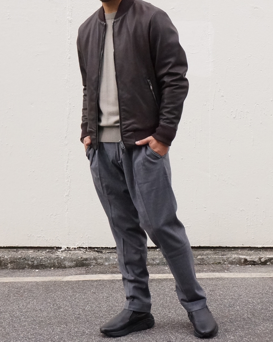 渋くて優しい印象のダークブラウンで染め上げた、シープレザーのMA-1。