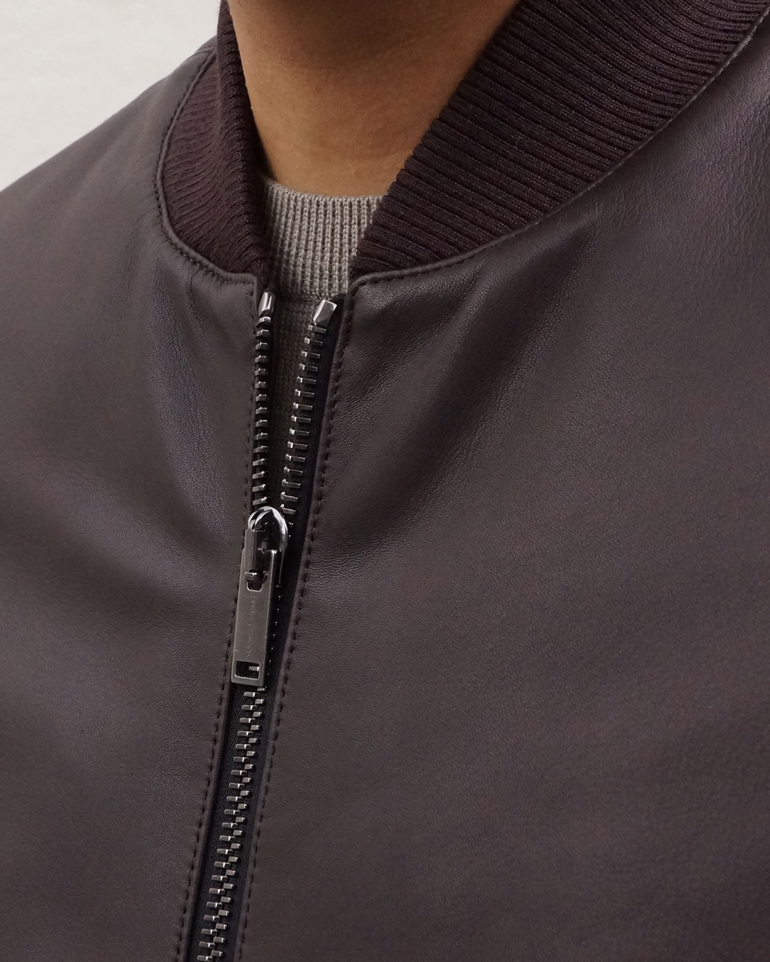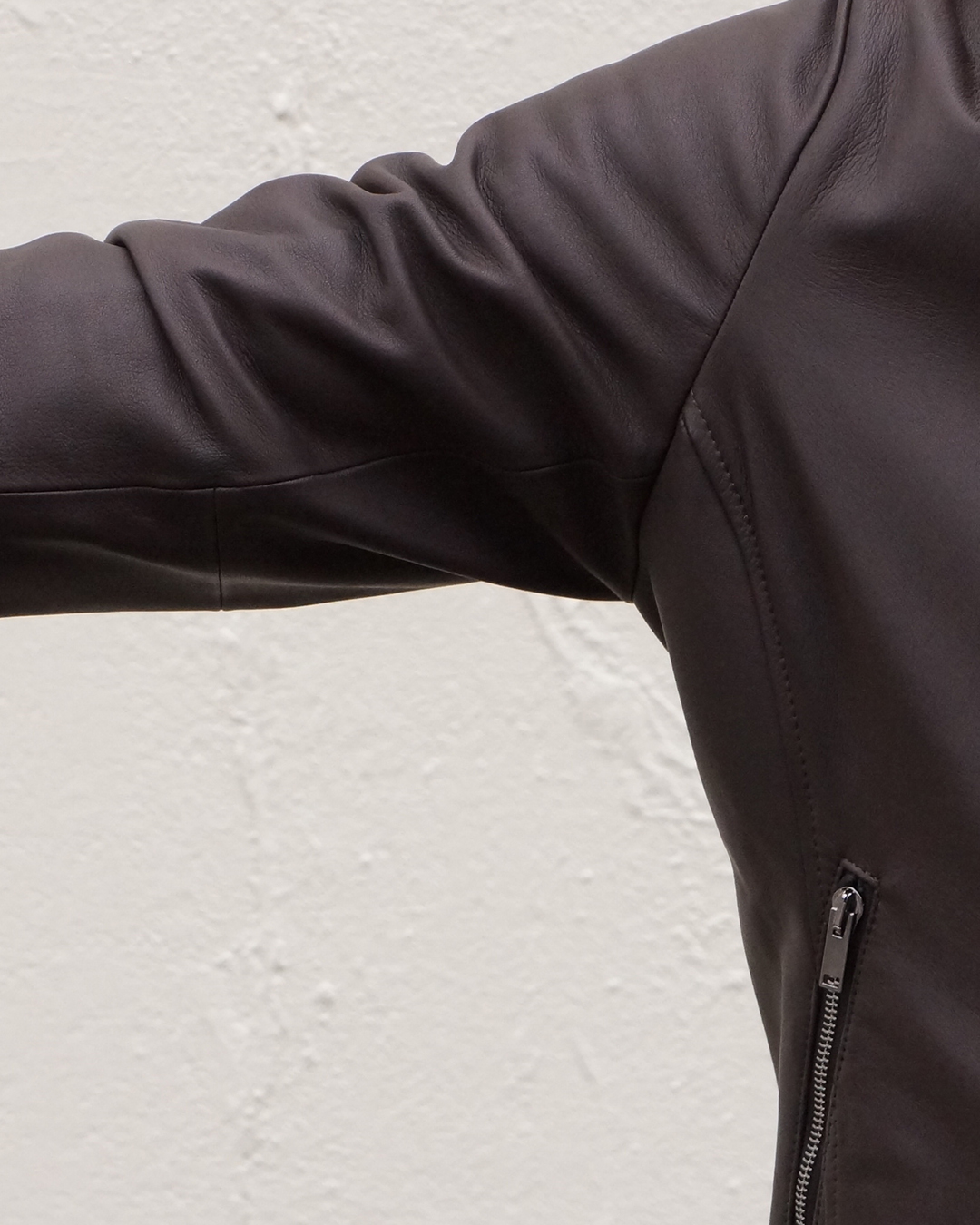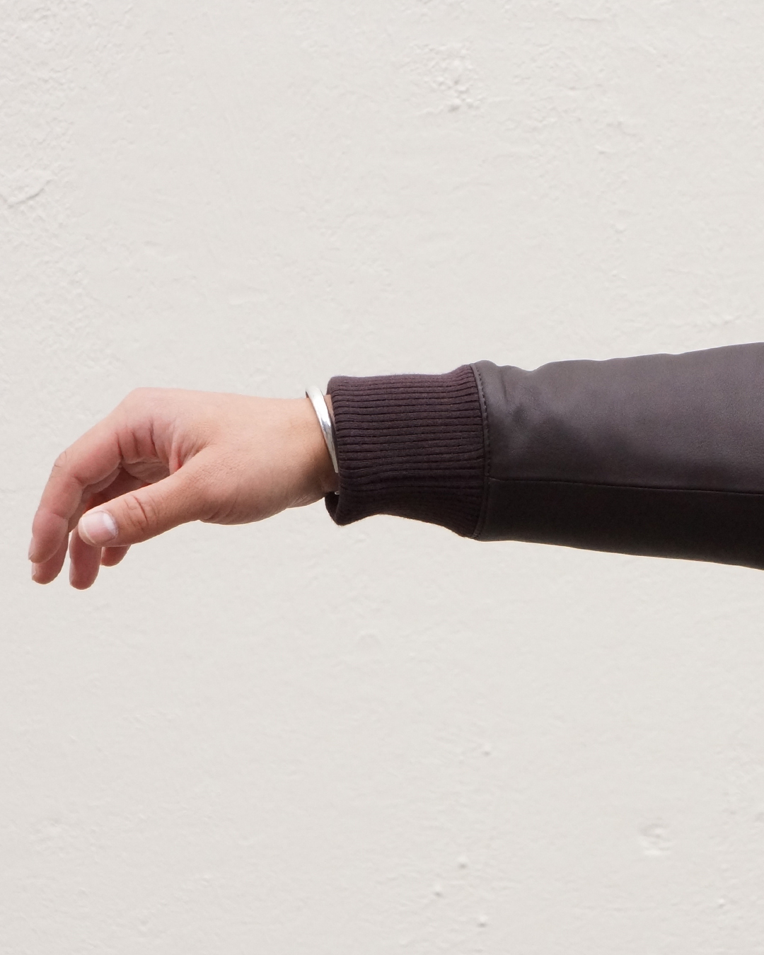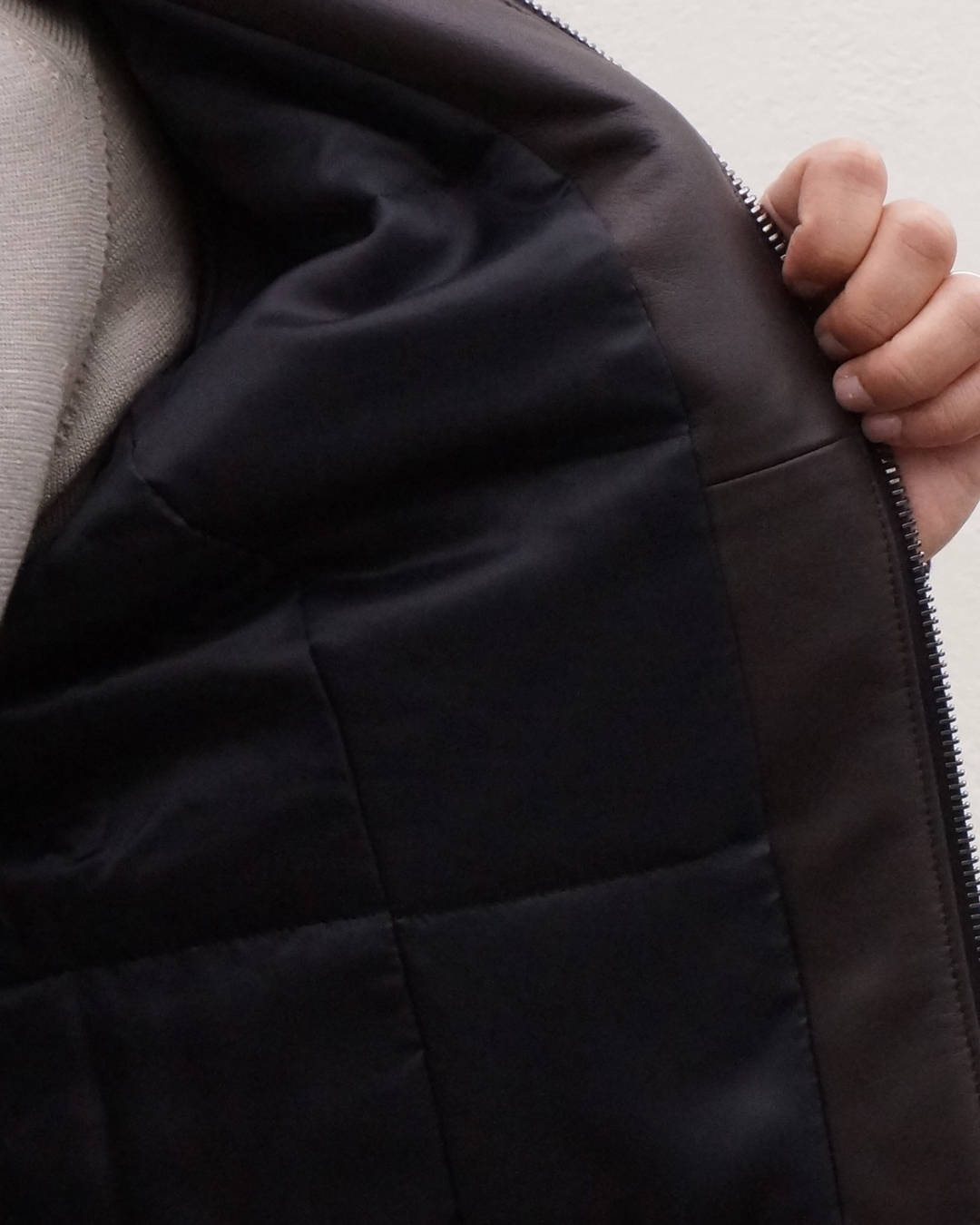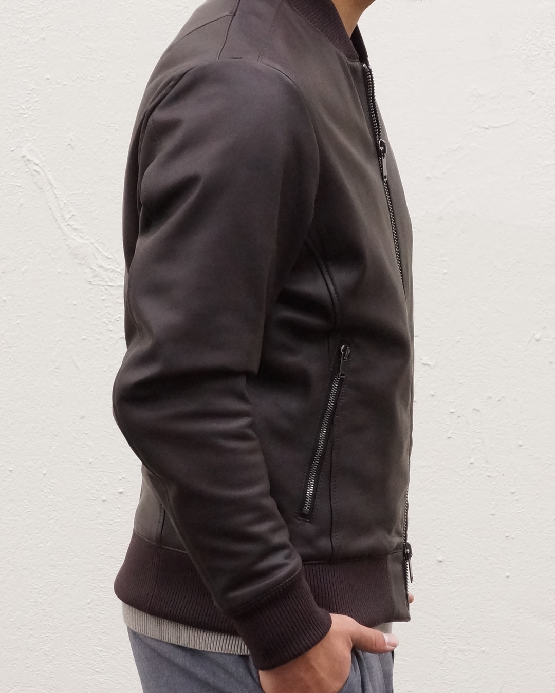 渋くて優しい印象のダークブラウンで染め上げた、シープレザーのMA-1。