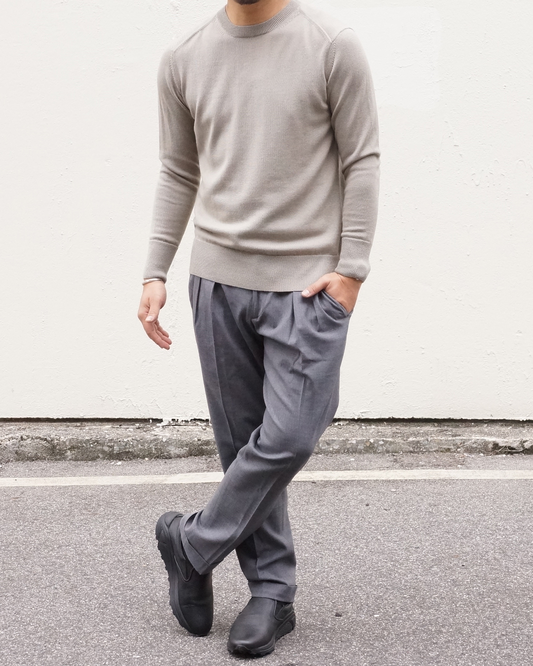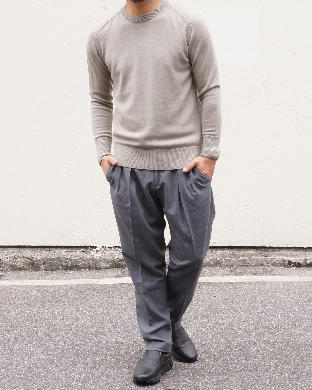 杢調のニュアンスが効いた柔らかな色合いで、カジュアルからドレススタイルまで自在に対応します。