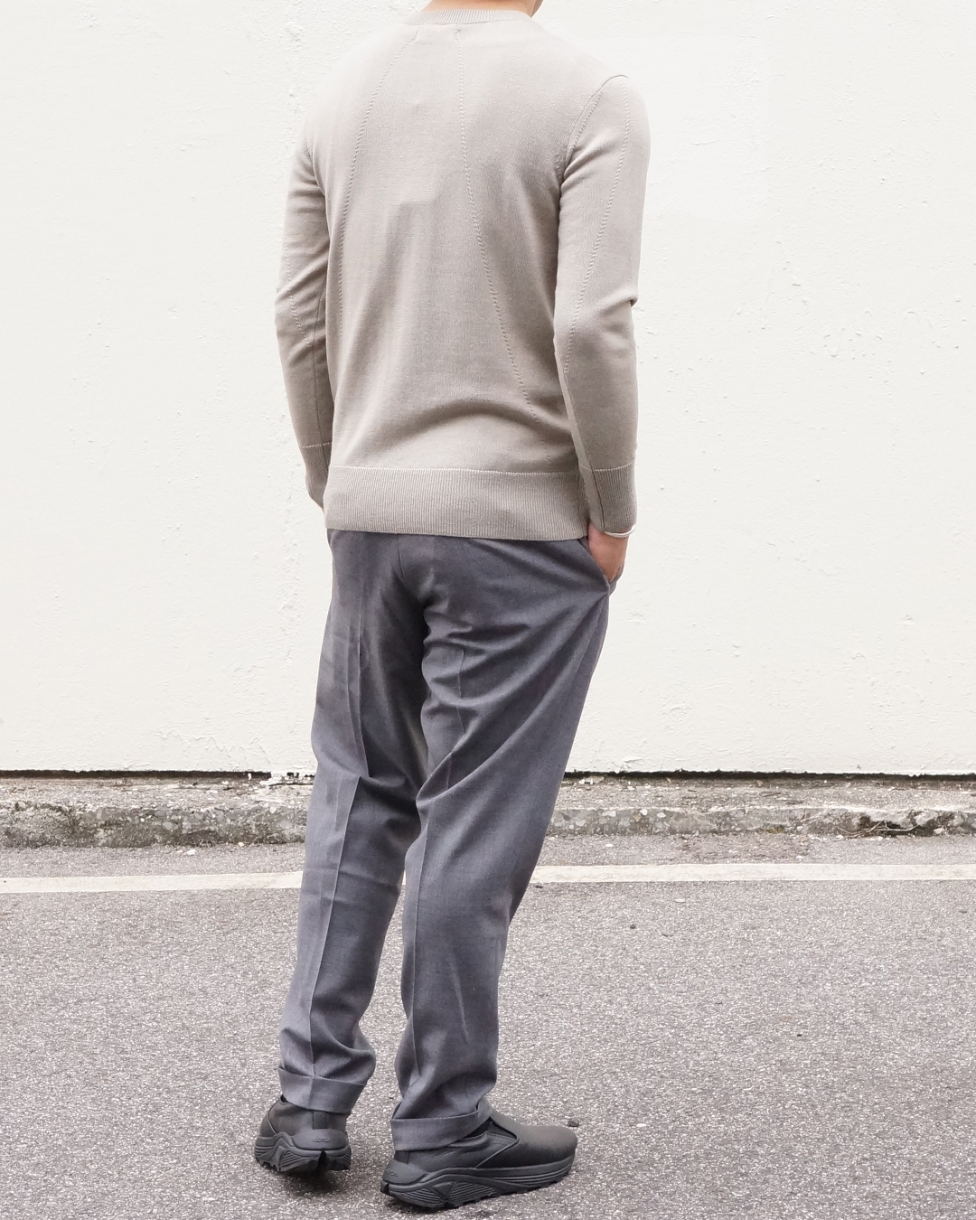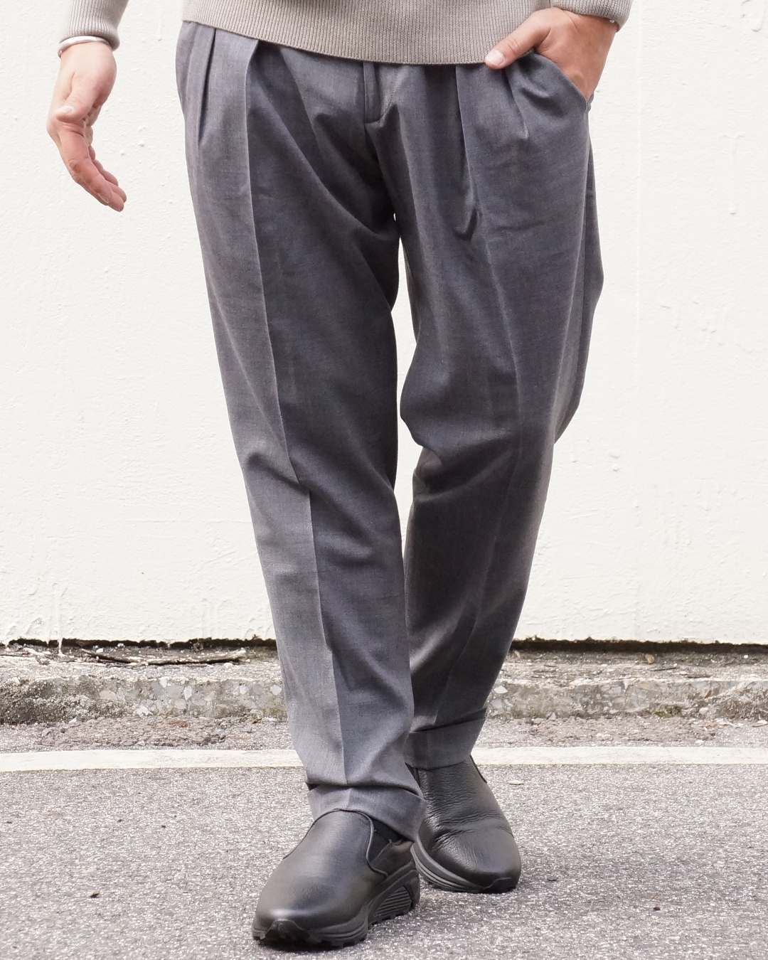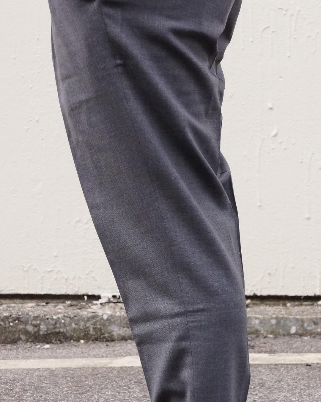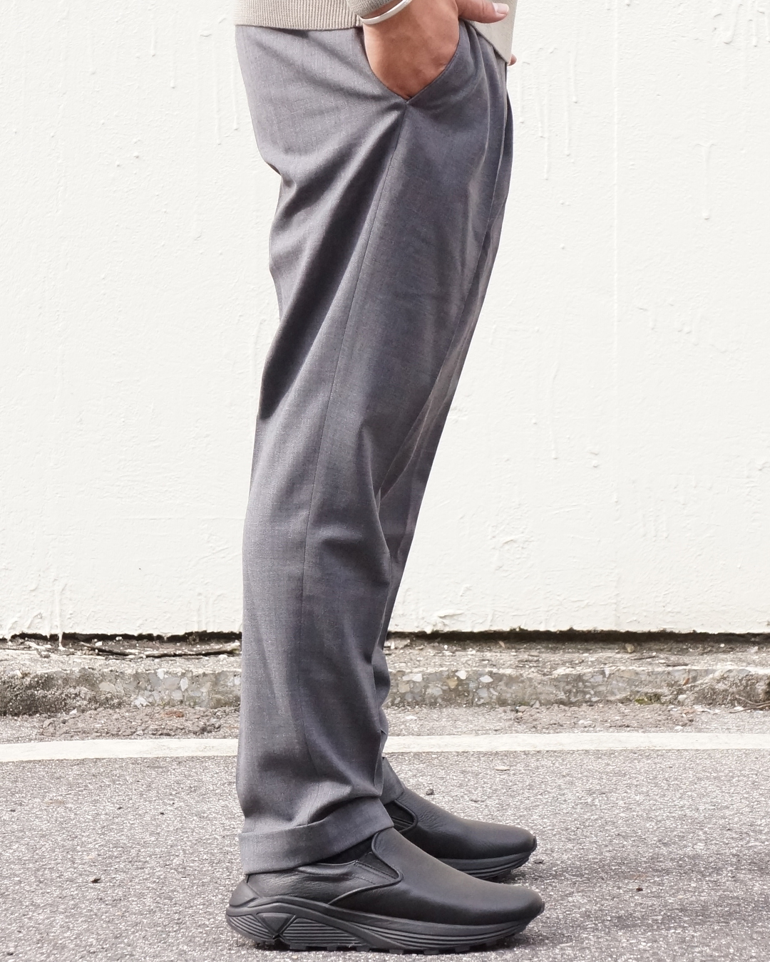 ゆったりとした腰回りと裾口にかけての美しいテーパードが目を惹くモダンクラシックな表情が特徴です。