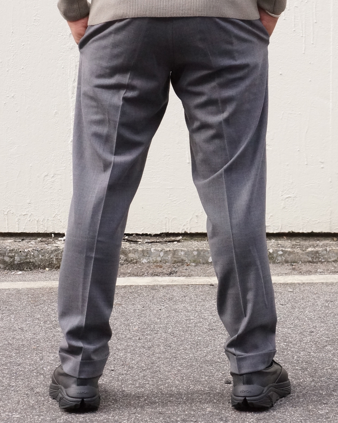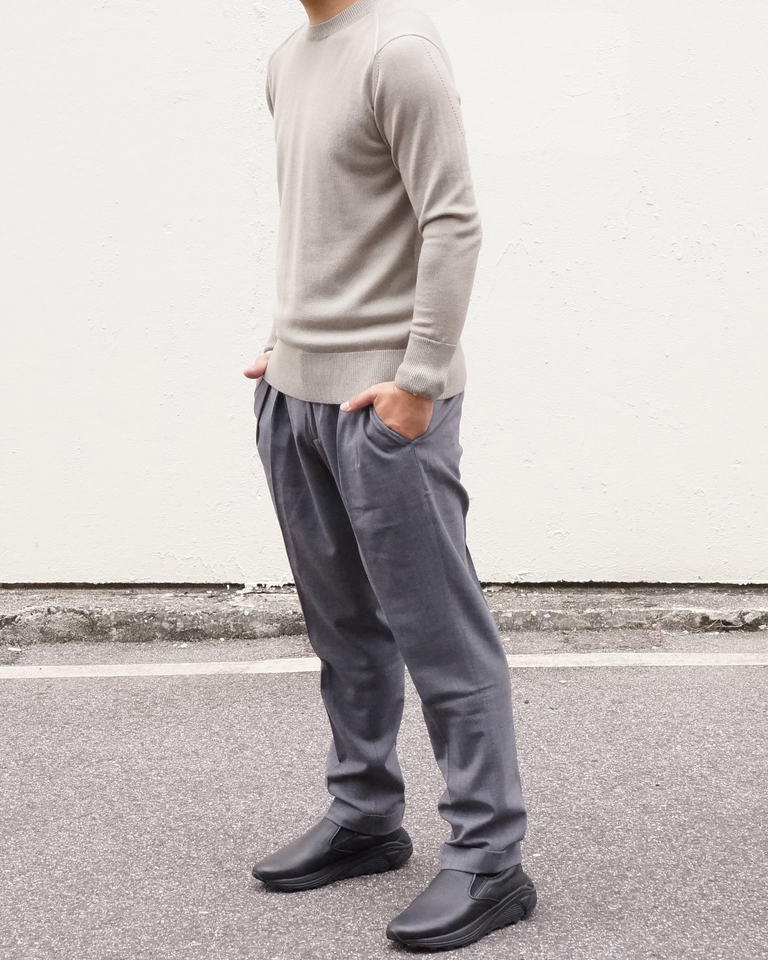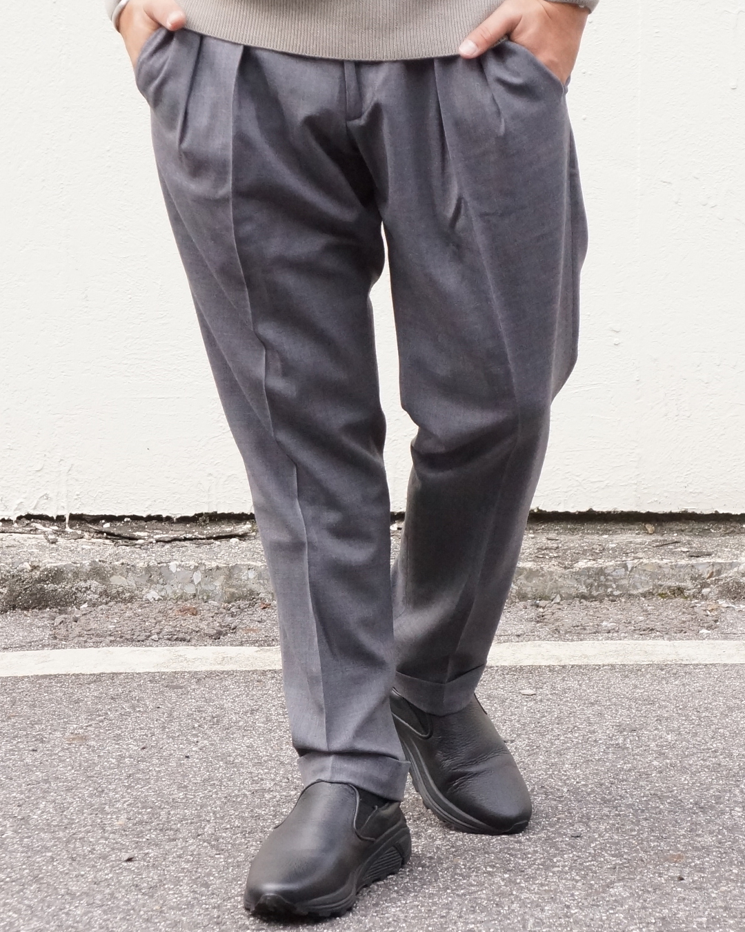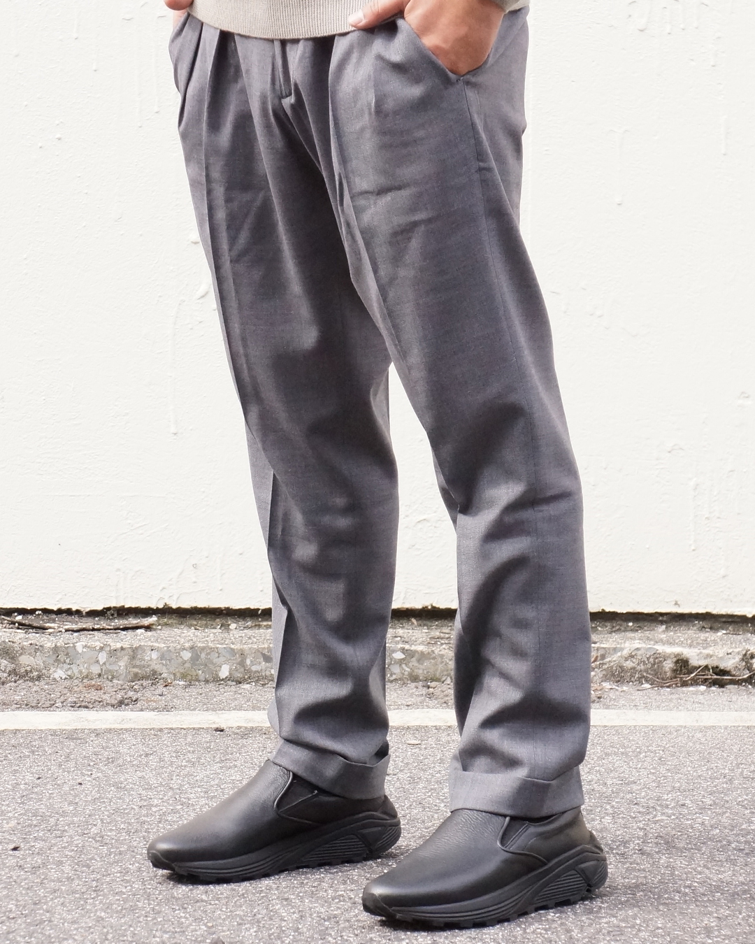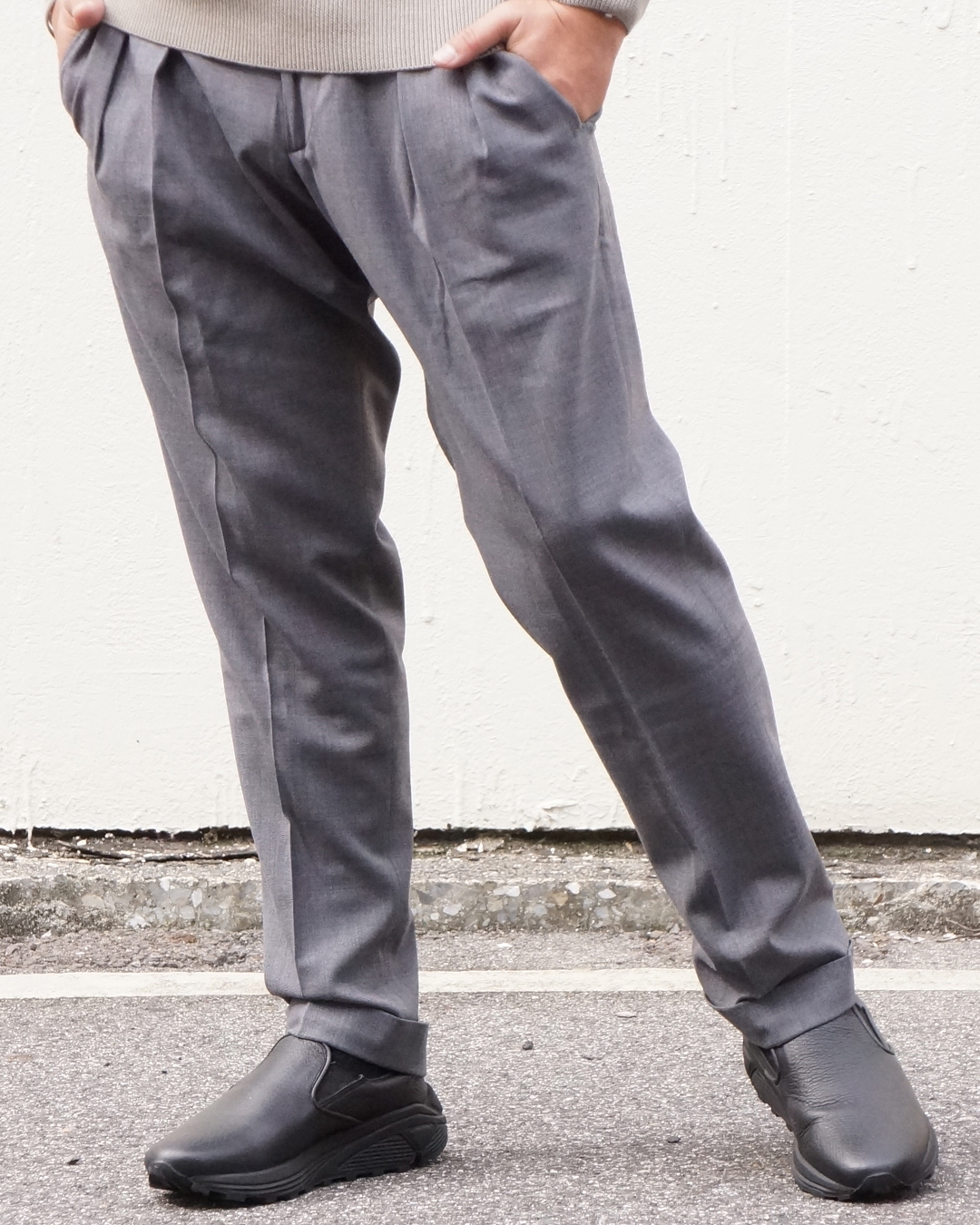 ゆったりとした腰回りと裾口にかけての美しいテーパードが目を惹くモダンクラシックな表情が特徴です。