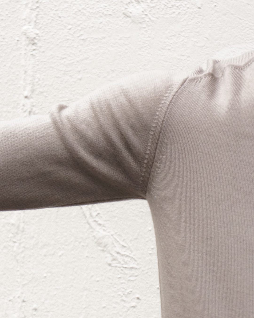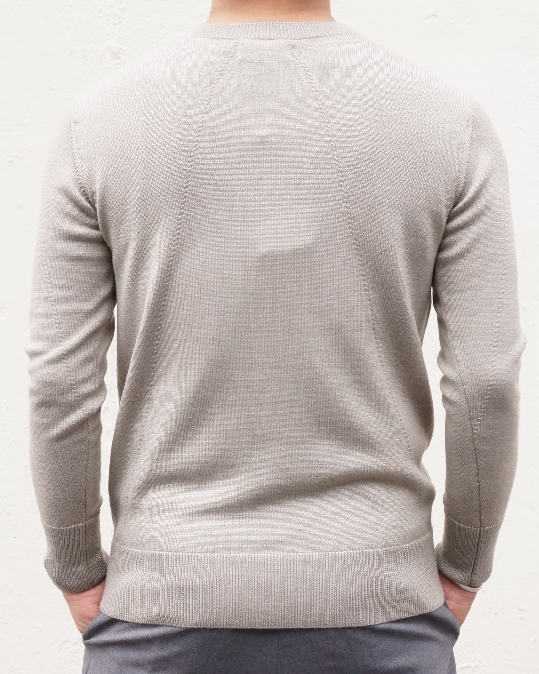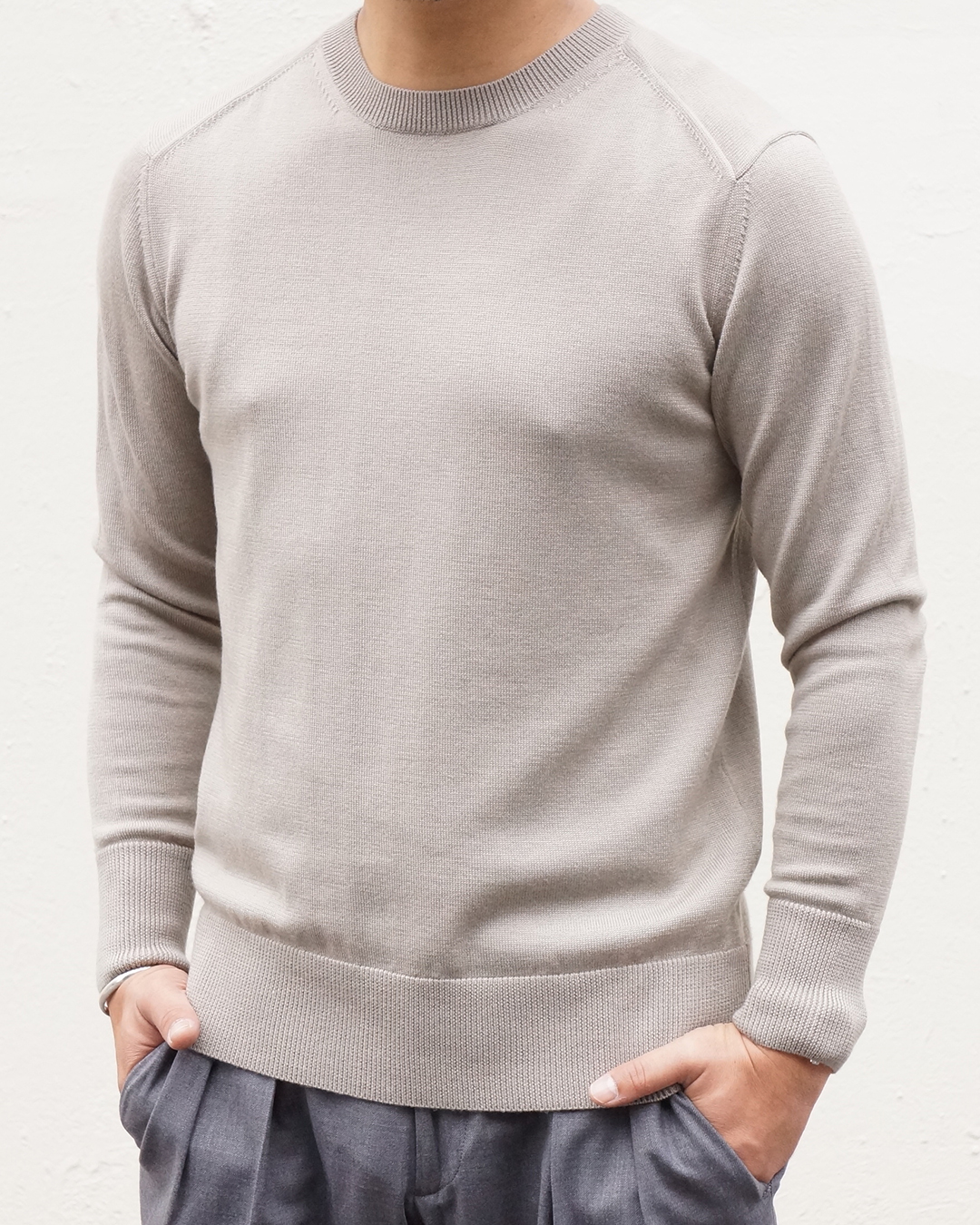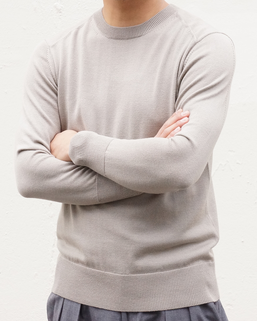 目の詰まった12ゲージの編み目で構成しつつ、エクストラファインメリノウールの特性である