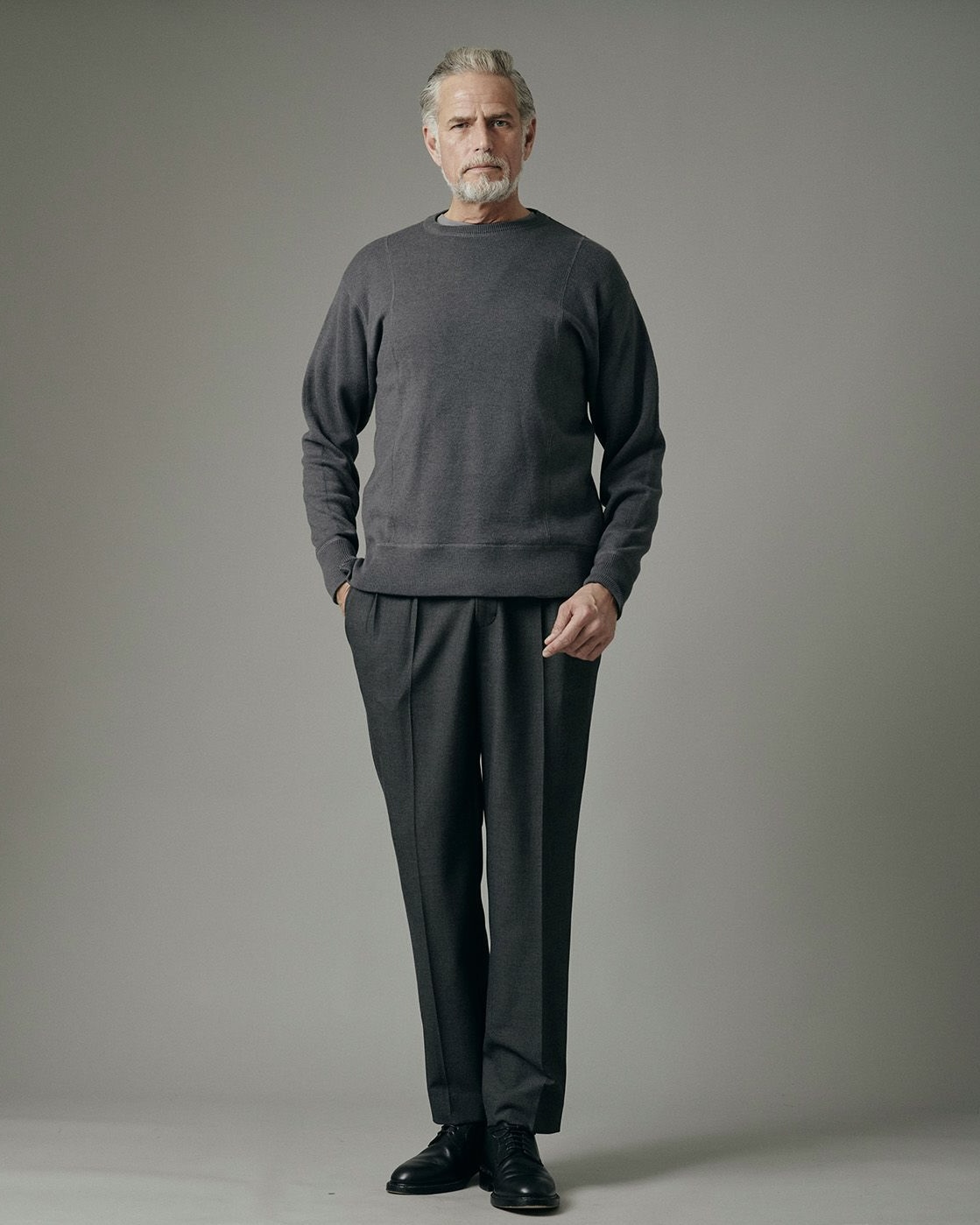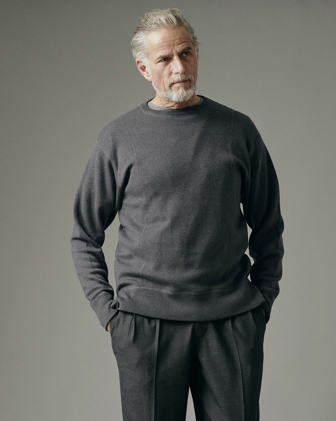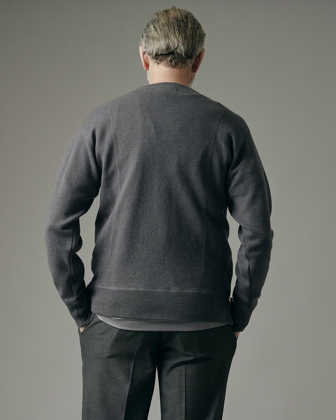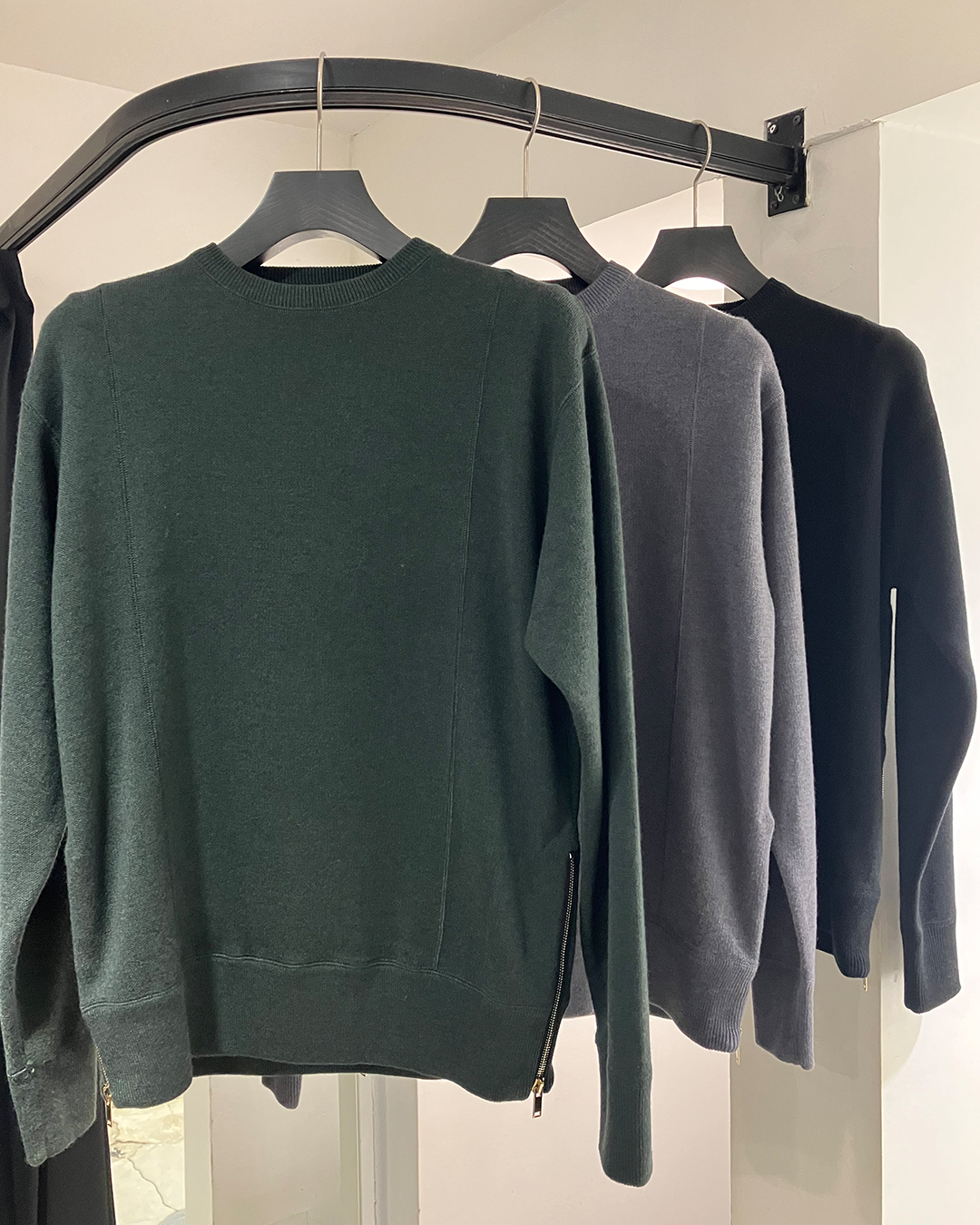 こちらは、シンプルなデザインの中に細部のアイディアを取り入れたミディアムウェイトのニットです。