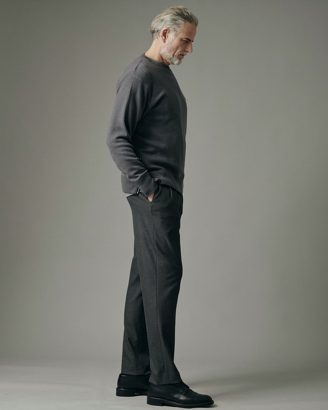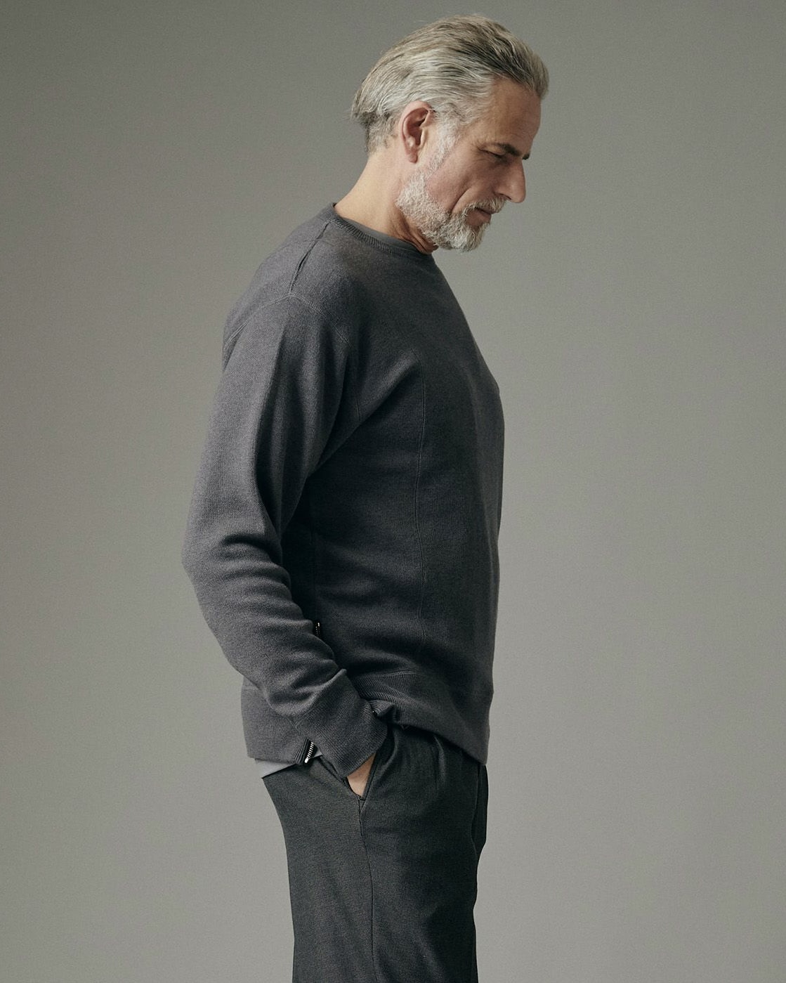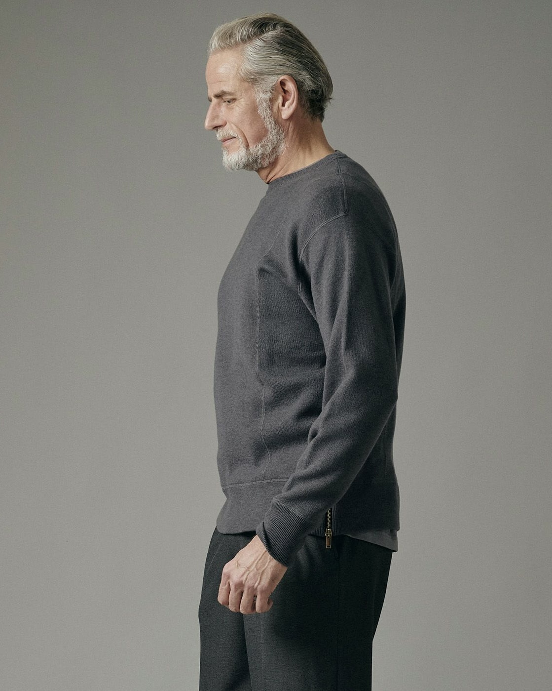 袖口や裾のリブが生地の表面の表情に変化を持たせているので、さりげない洗練性が伺えます。