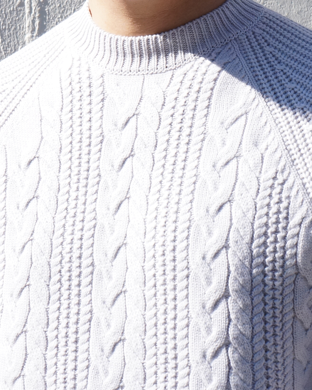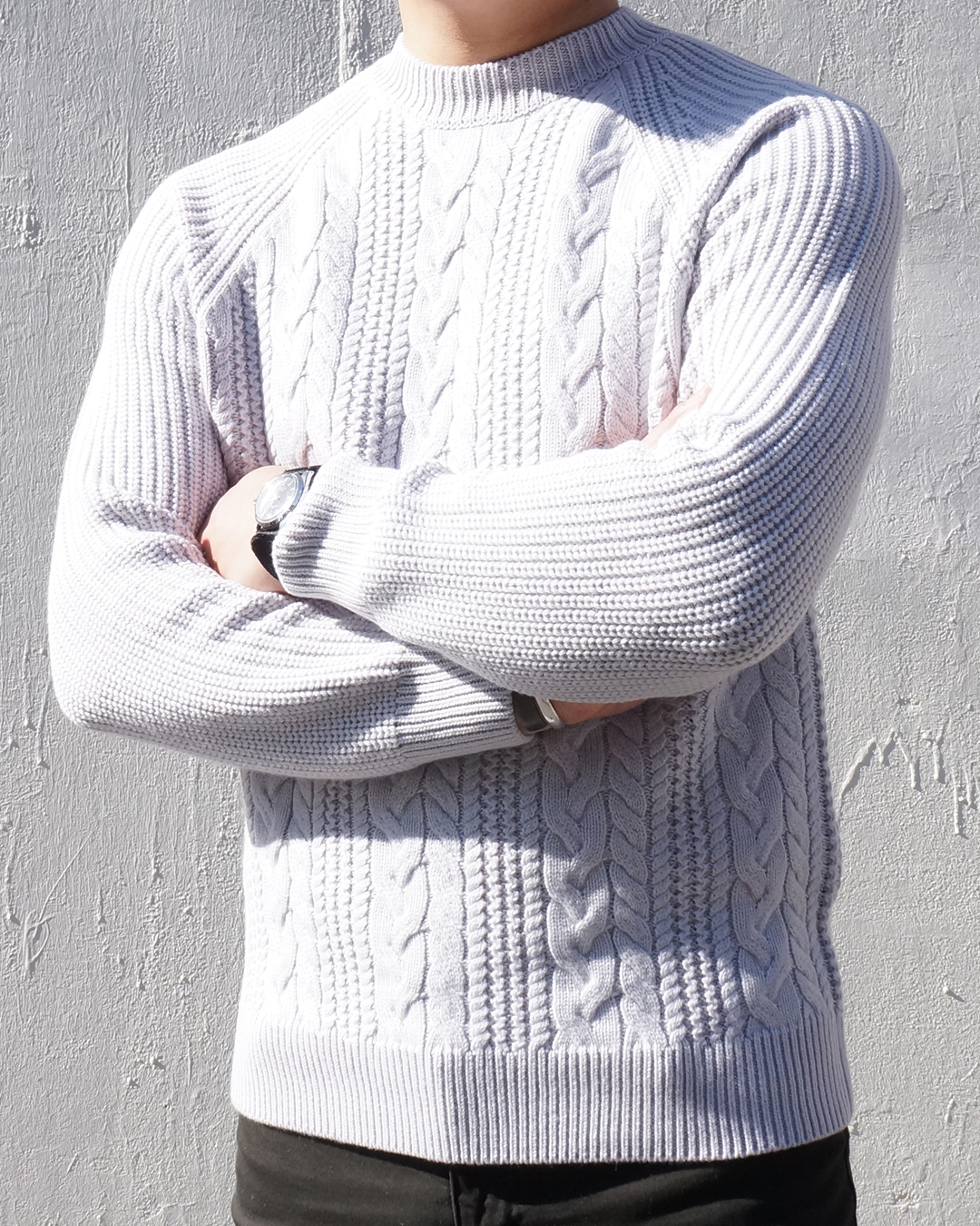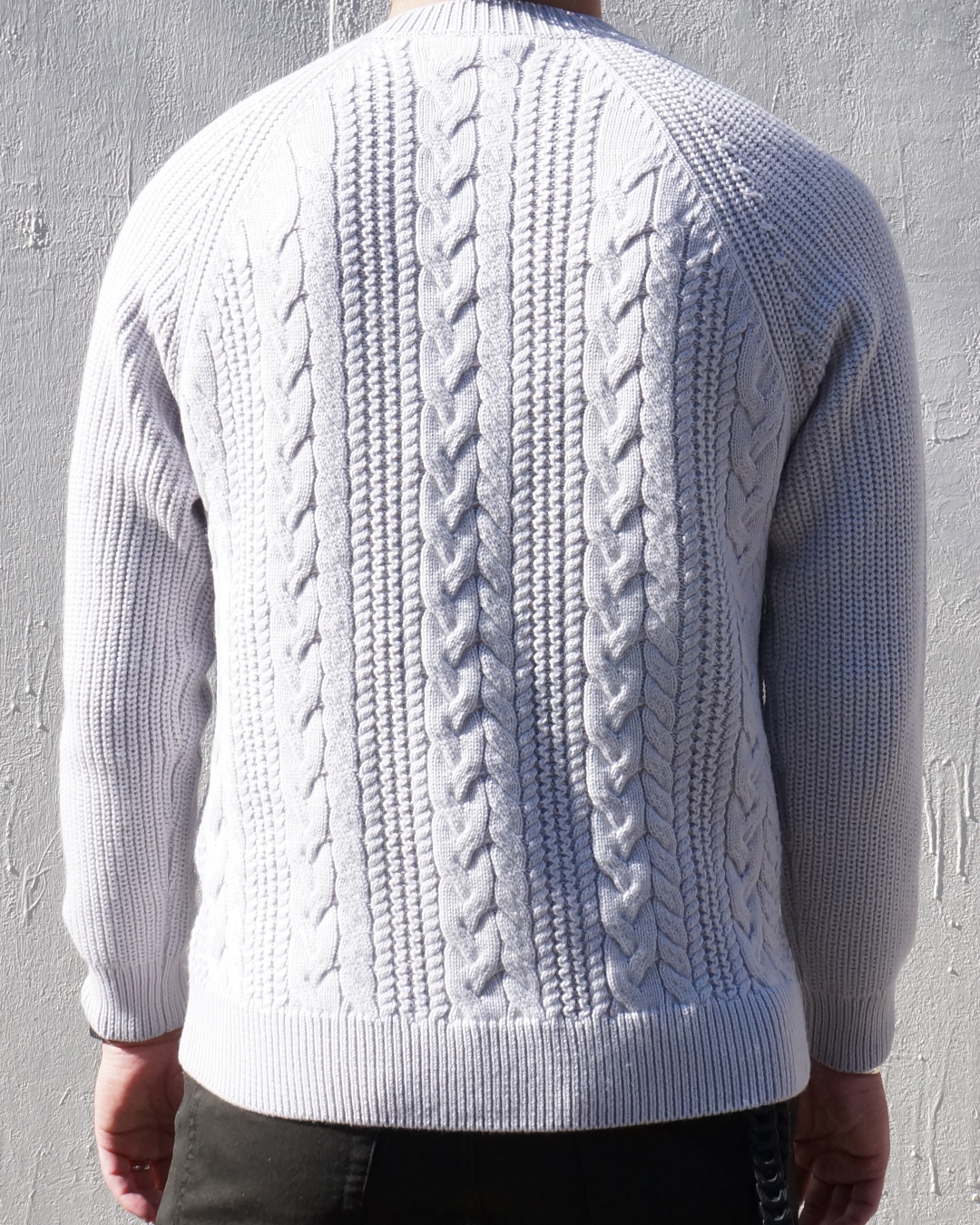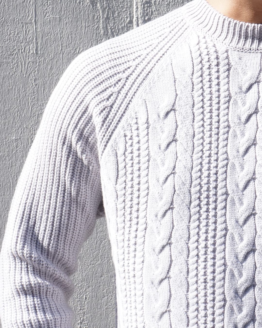 こちらは、プレーティング編みという 表側に暖かさを感じさせるウールを、肌面側にはチクチク感を極力抑えたコットンに切り替える技法が用いられた、異素材の掛け合わせのケーブル柄ニットです。