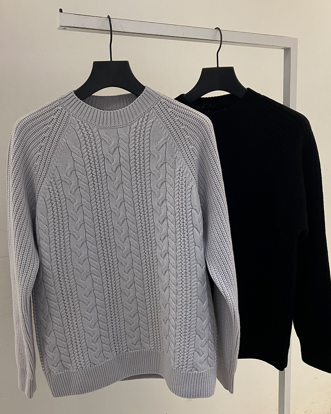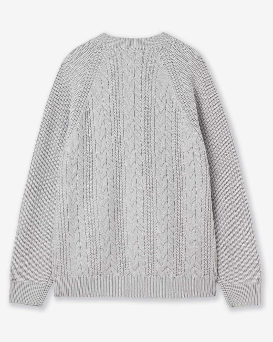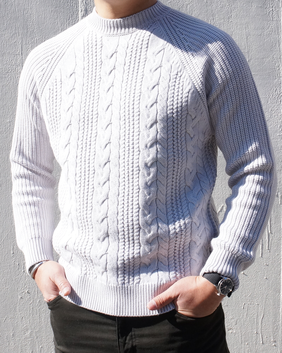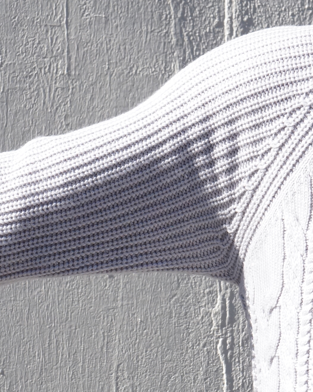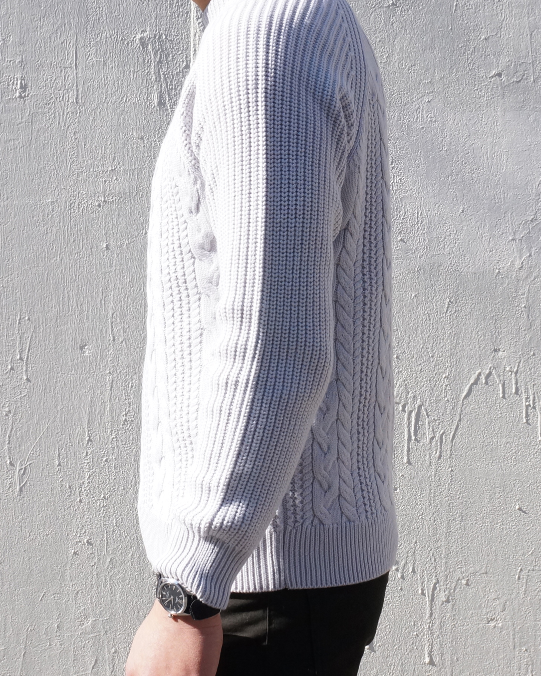 こちらは、プレーティング編みという 表側に暖かさを感じさせるウールを、肌面側にはチクチク感を極力抑えたコットンに切り替える技法が用いられた、異素材の掛け合わせのケーブル柄ニットです。
