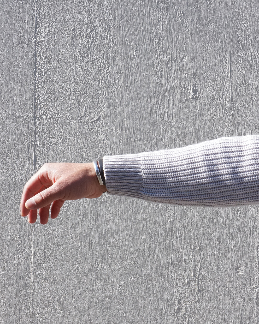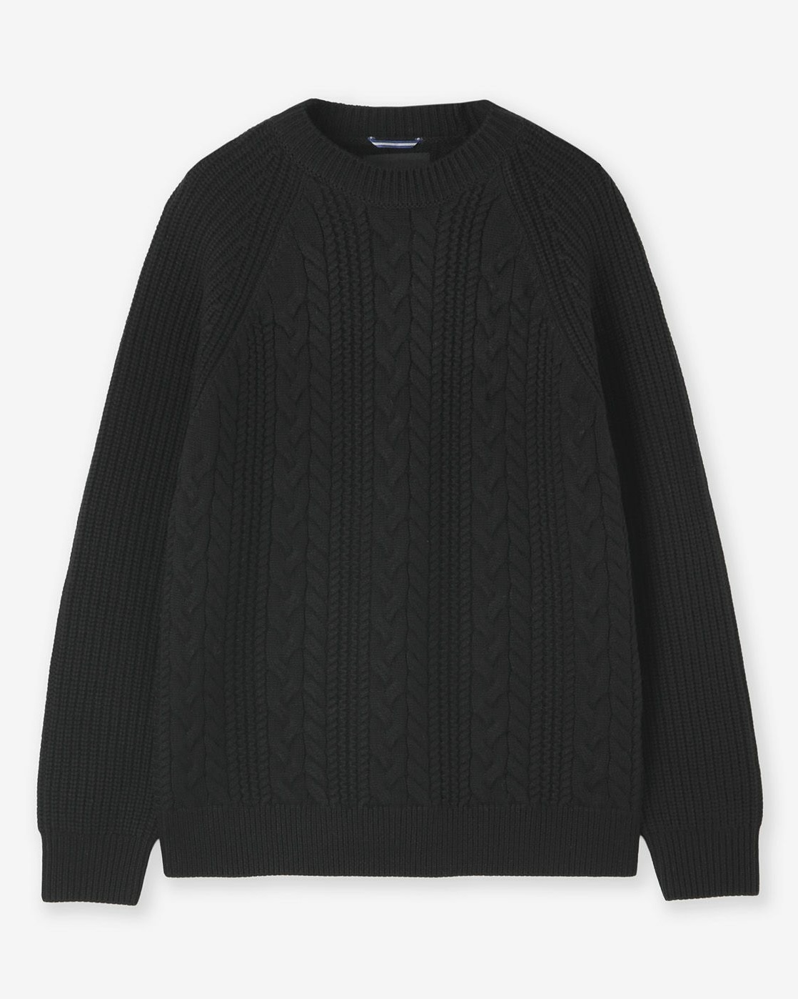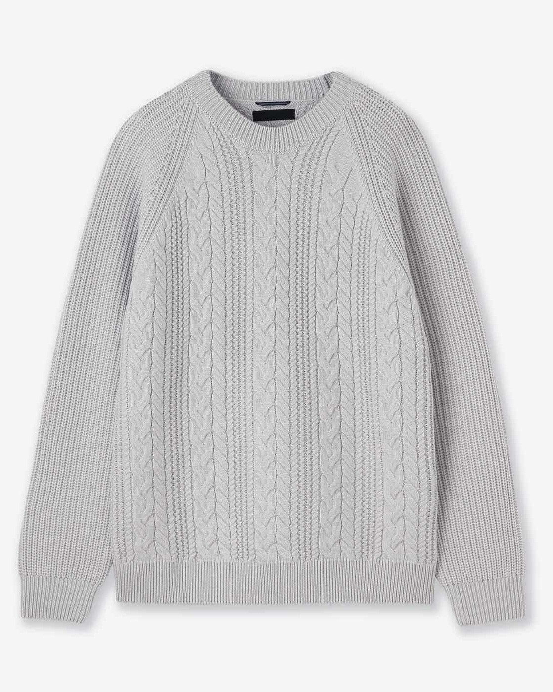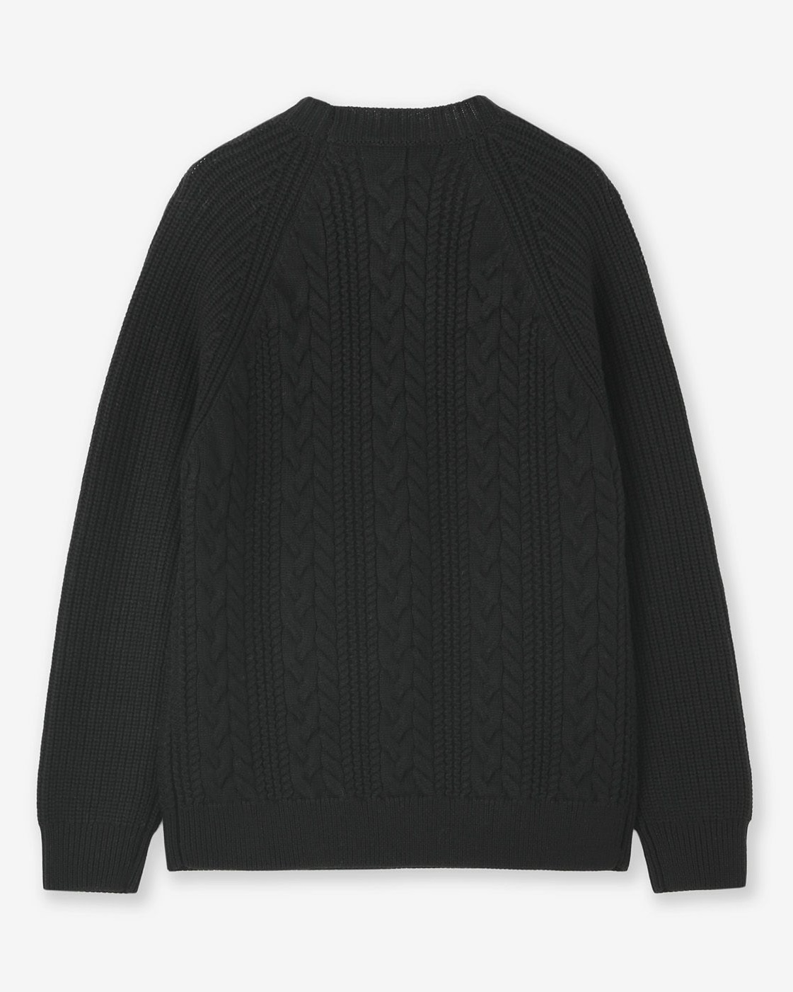 こちらは、プレーティング編みという 表側に暖かさを感じさせるウールを、肌面側にはチクチク感を極力抑えたコットンに切り替える技法が用いられた、異素材の掛け合わせのケーブル柄ニットです。