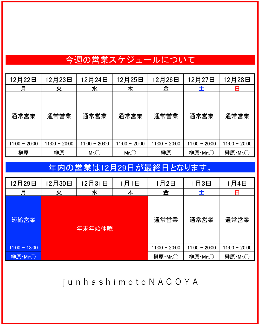 ・12月29日(月) : 短縮営業 ( 11:00 – 18:00 ) / 榊原・Mr.○