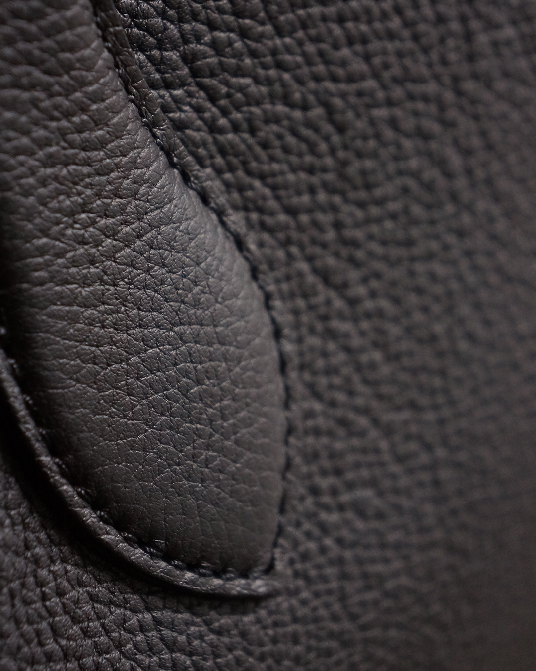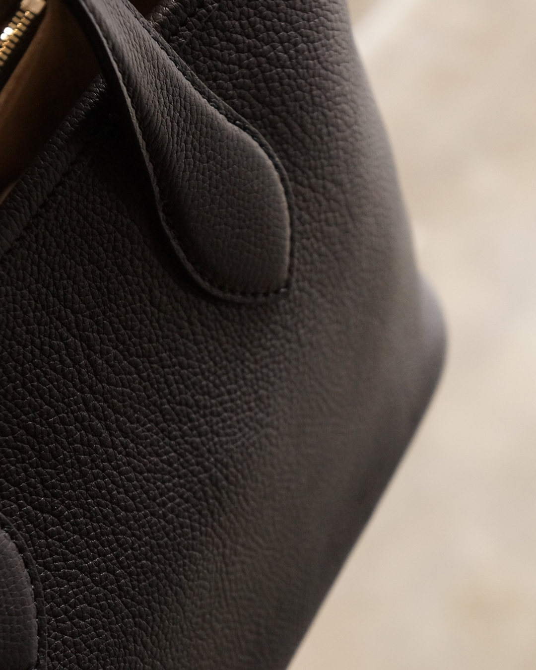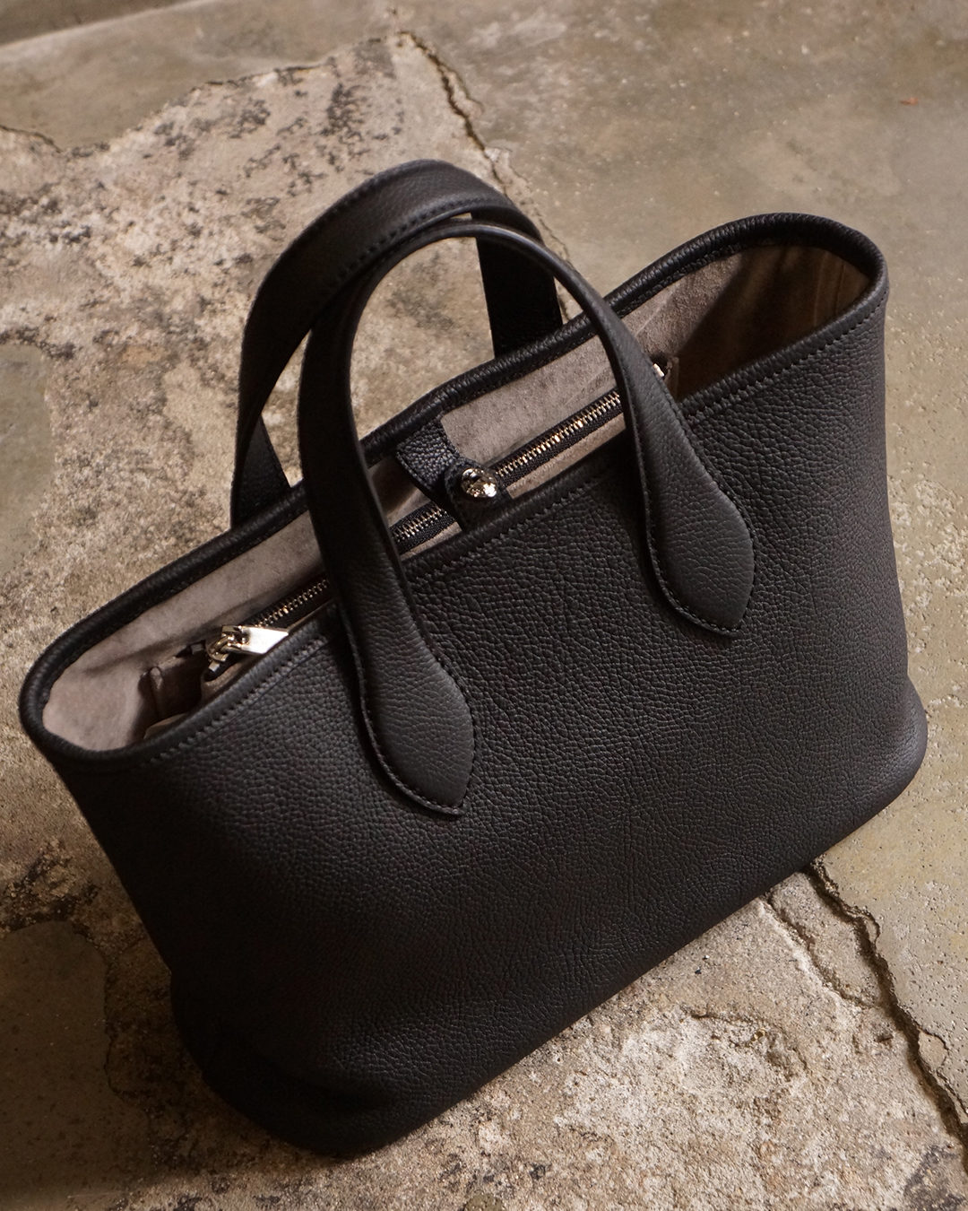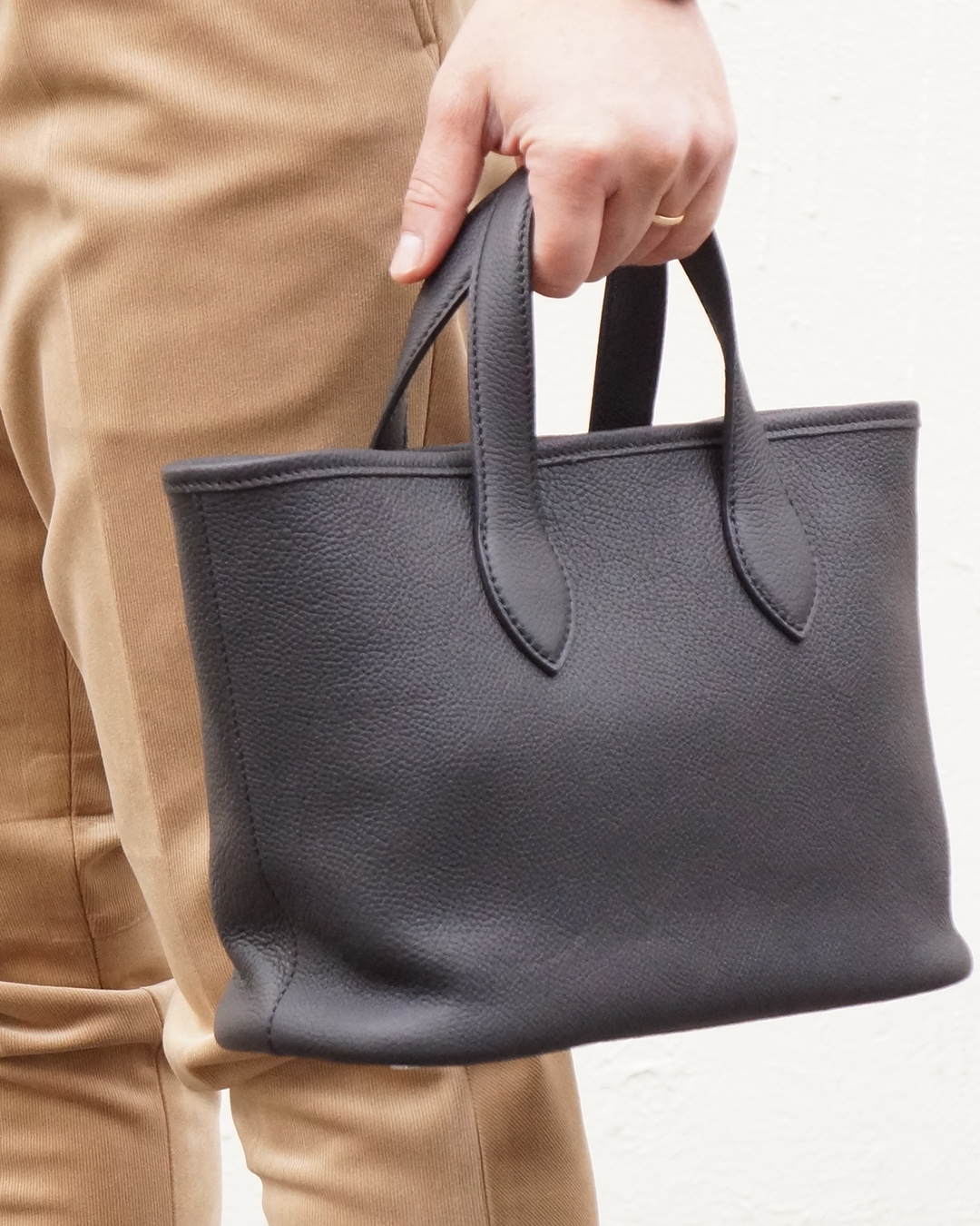 コンパクトで品のあるデザインとトリヨン・モーリスの張りのある柔らかなシボ感が上手く合わさっており、革の性質と縫製技術が非常に高次元で合わさった美しい仕上がりです。ハンドルは全て熟練の職人の手仕事によるコバ磨きで仕上げられています。