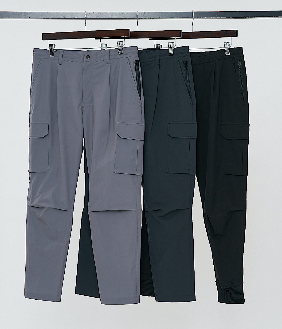 コート、ジャケット、パンツ、カットソー、バッグ。