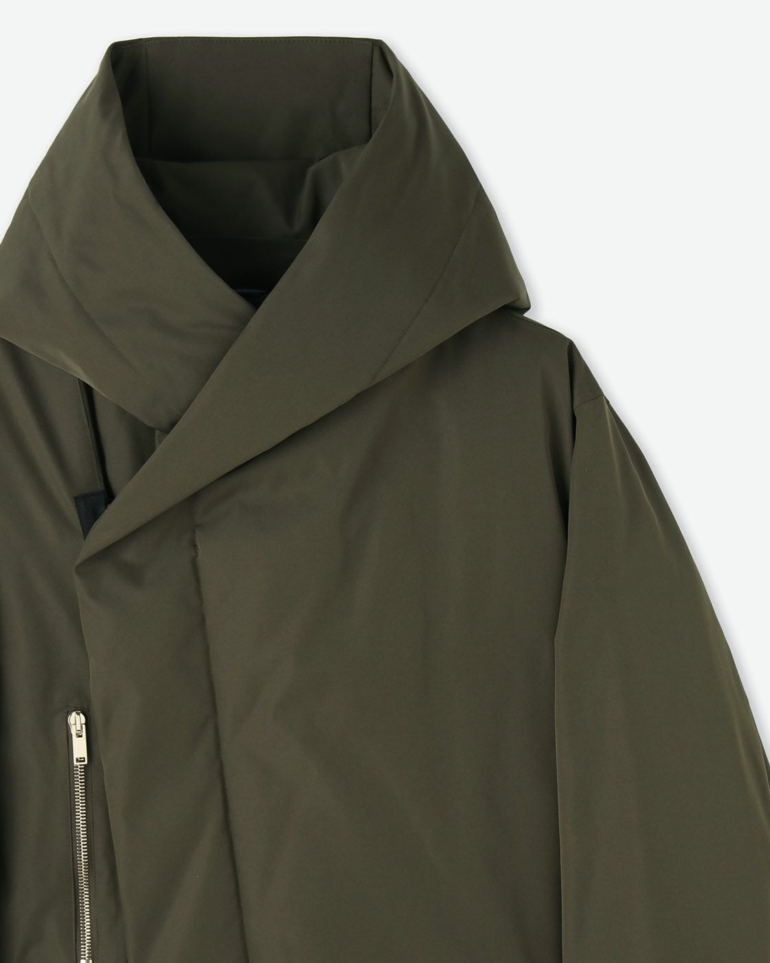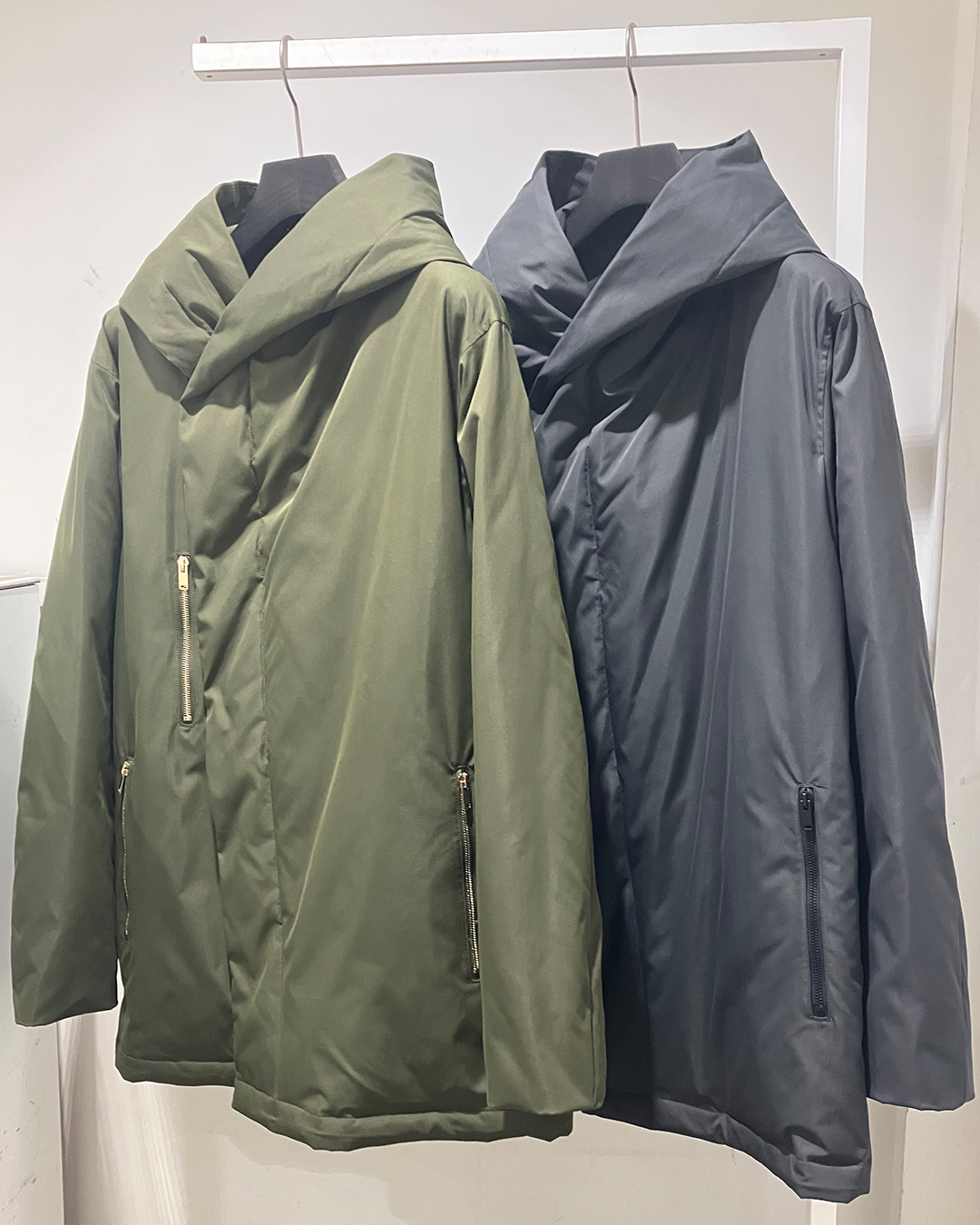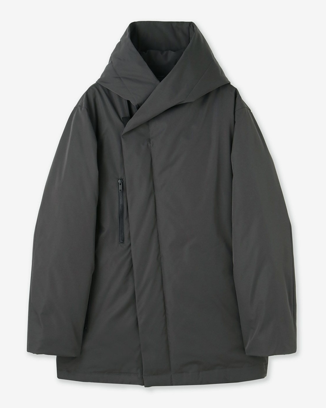 こちらは、junhashimotoの定番モデルとして高い人気を誇るWRAP COATの流線系シルエットをそのまま活かして、ダウンの代名詞とも言える「軽さ」と「暖かさ」を融合させたダウンコートです。