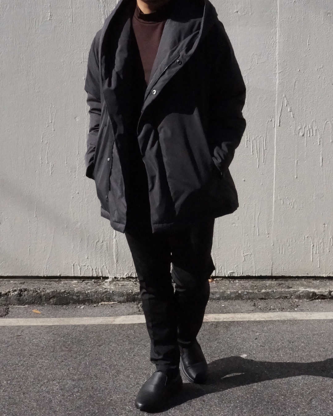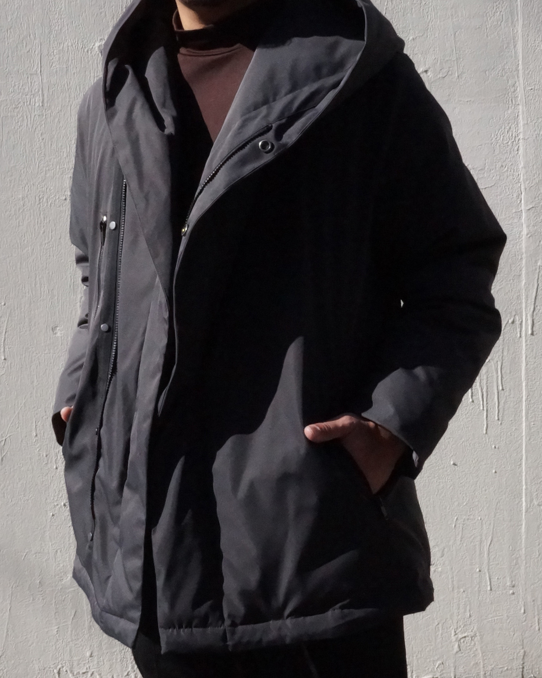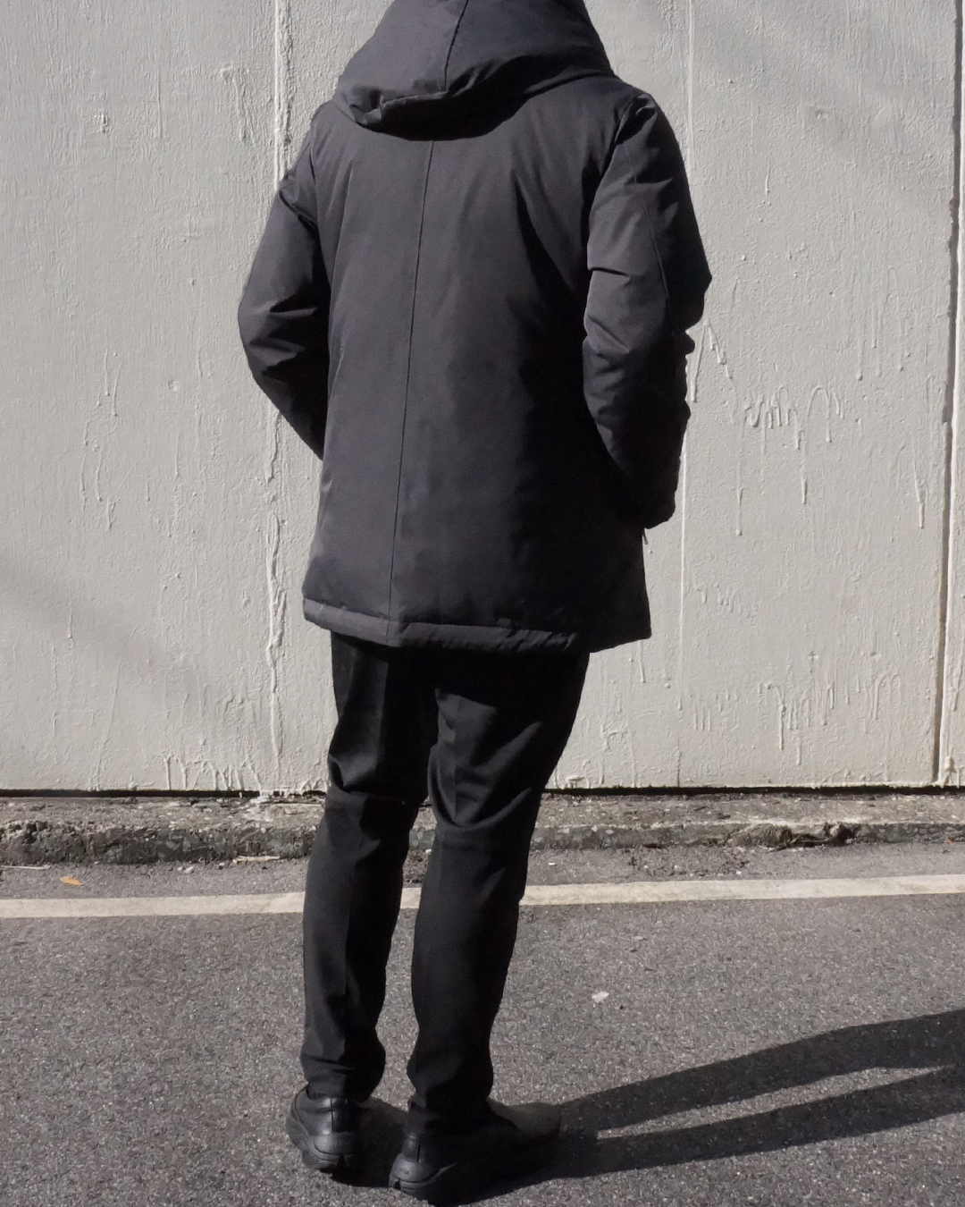 従来のダウンコートが持つ 縦に長くて身体全体がまん丸に膨らみがちなイメージを、junhashimotoらしい現代的なエッセンスを取り入れることにより、アクティブな印象に仕上がり、短く設定された着丈がより一層の軽快感をまとい、着回ししやすいバランスを実現しました。