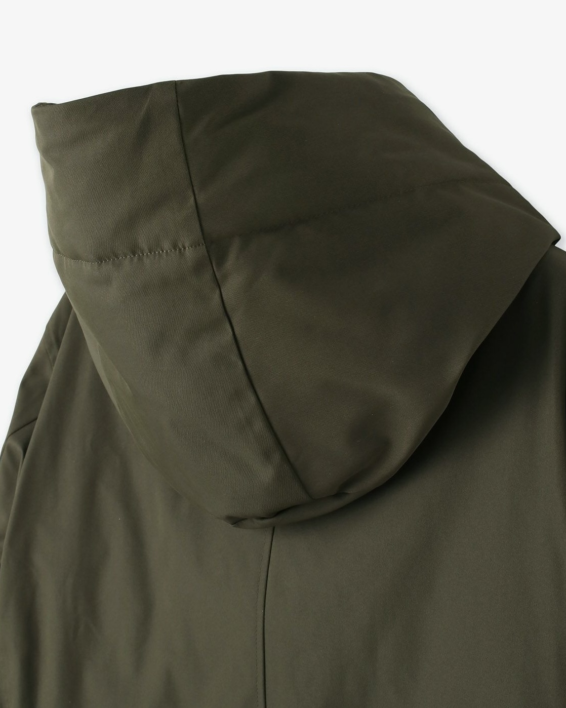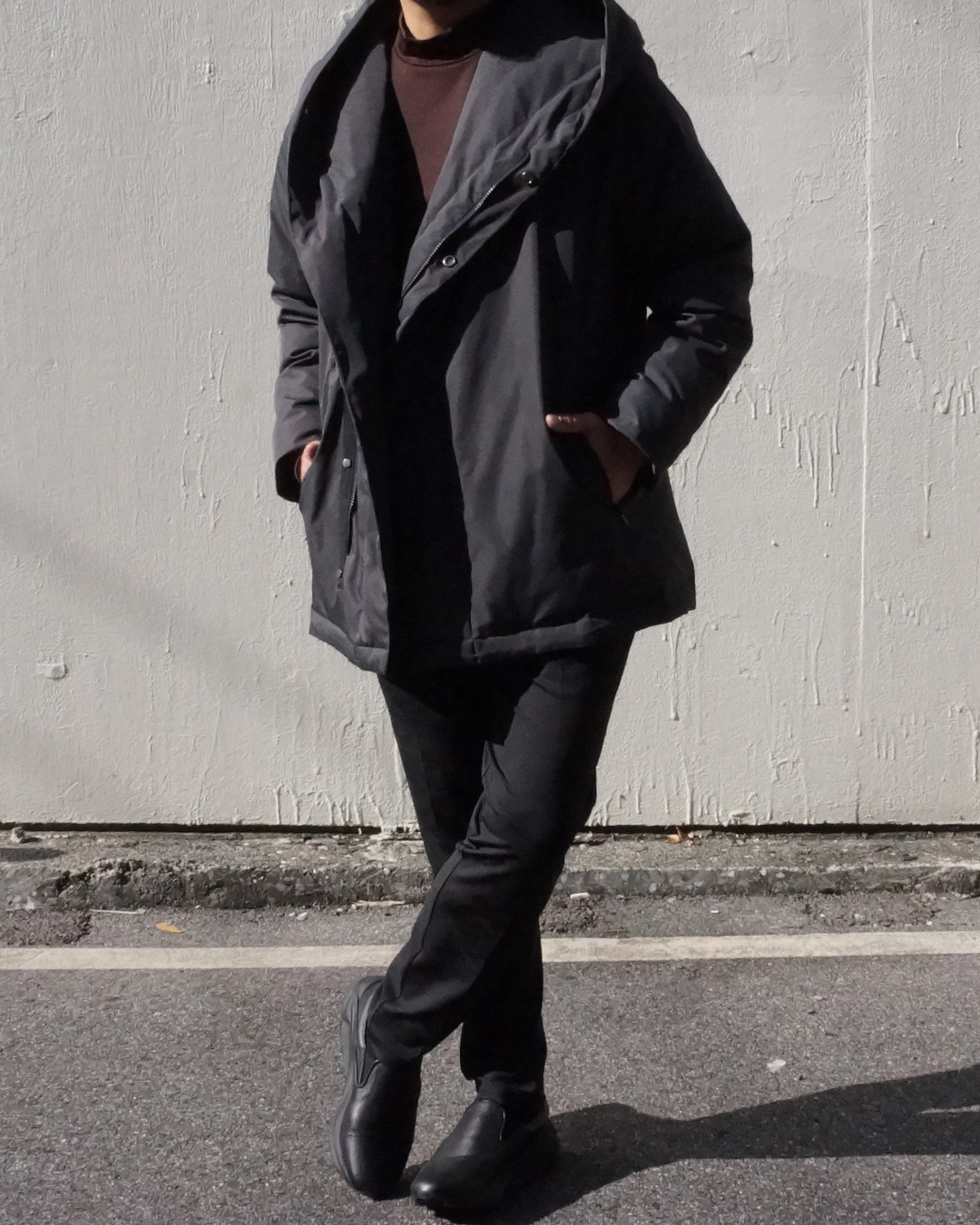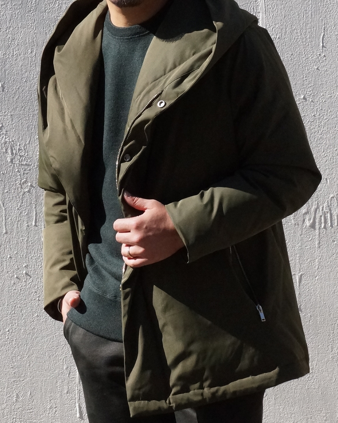 従来のダウンコートが持つ 縦に長くて身体全体がまん丸に膨らみがちなイメージを、junhashimotoらしい現代的なエッセンスを取り入れることにより、アクティブな印象に仕上がり、短く設定された着丈がより一層の軽快感をまとい、着回ししやすいバランスを実現しました。