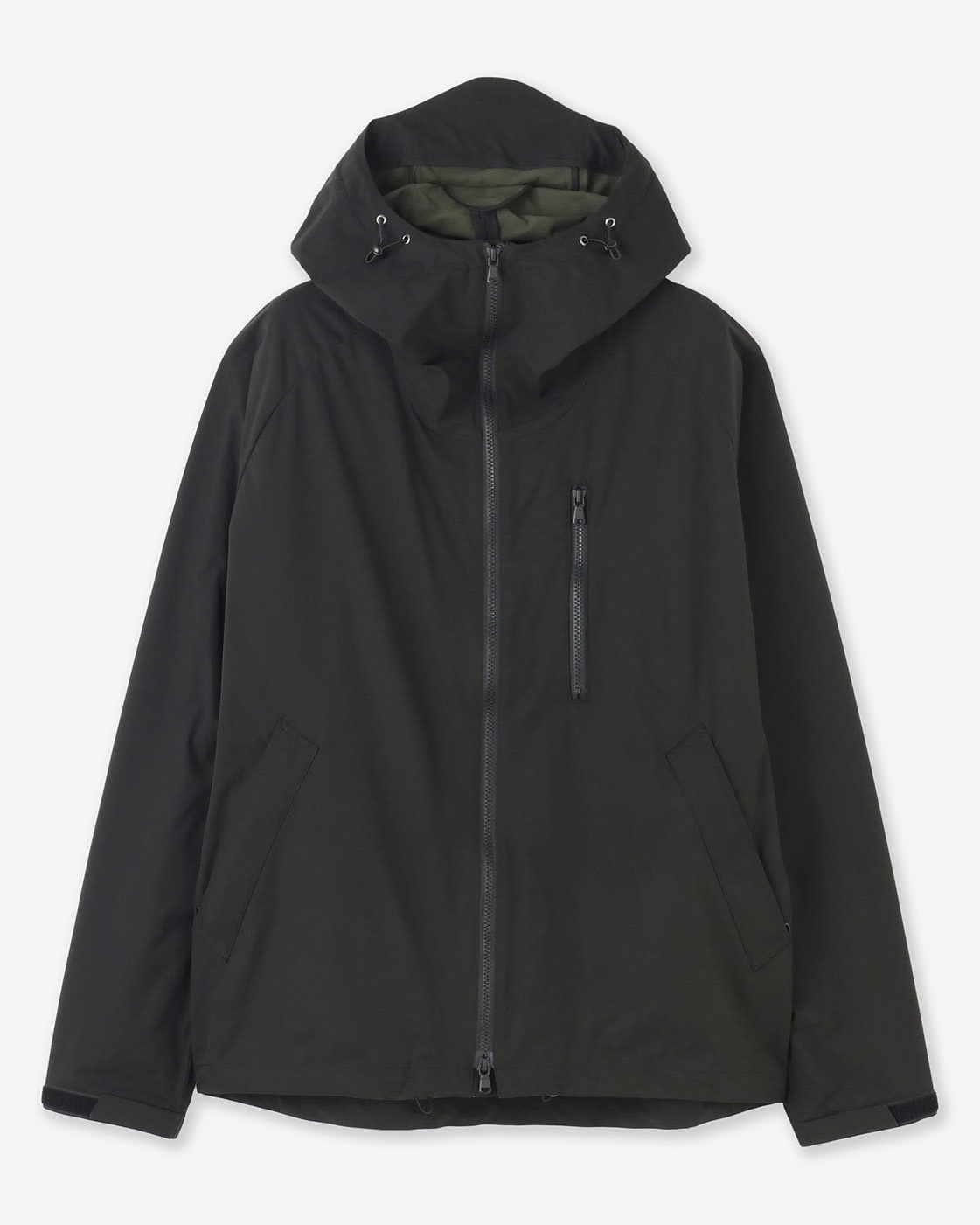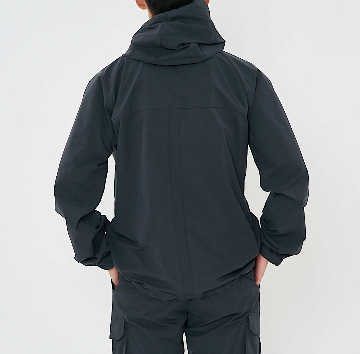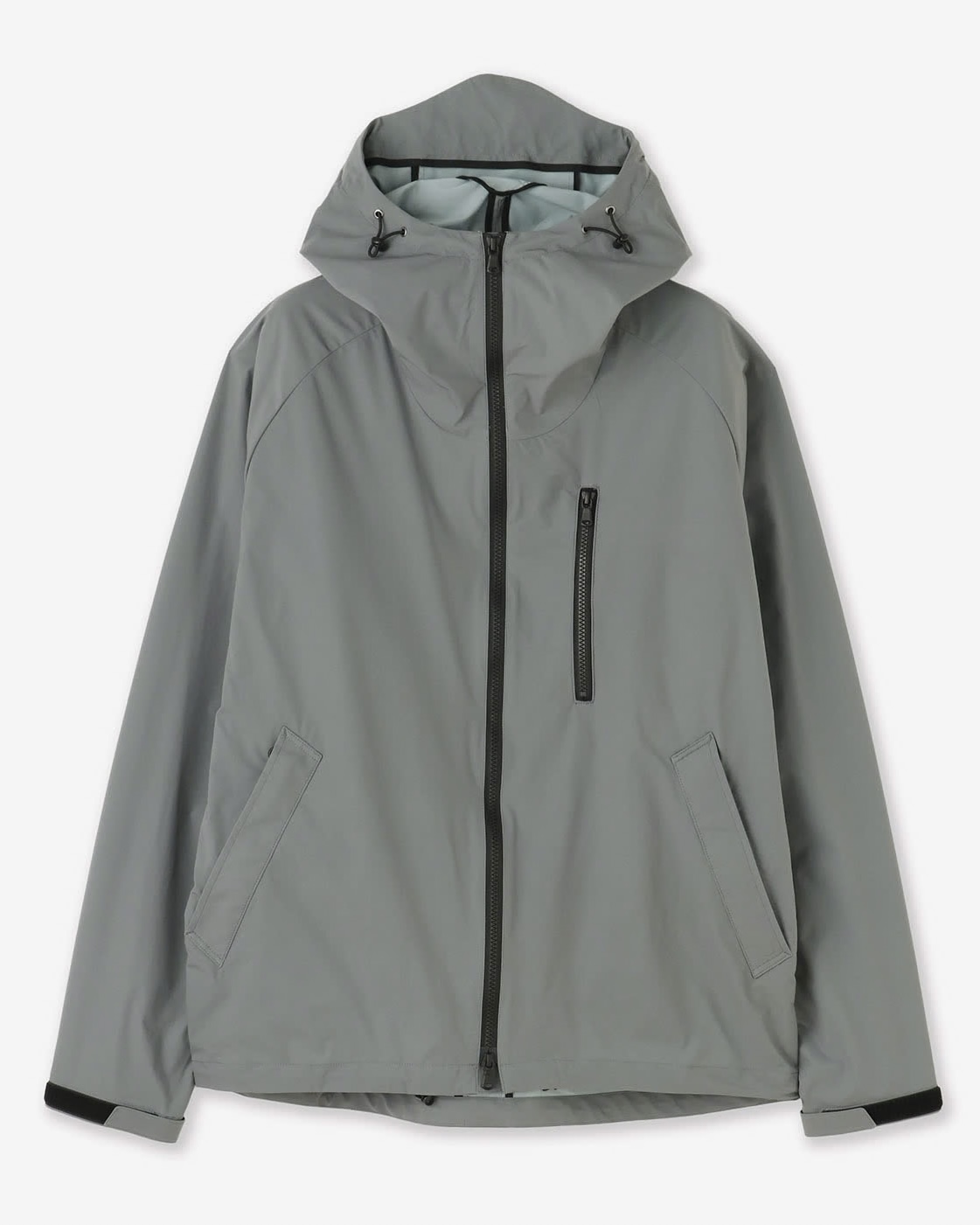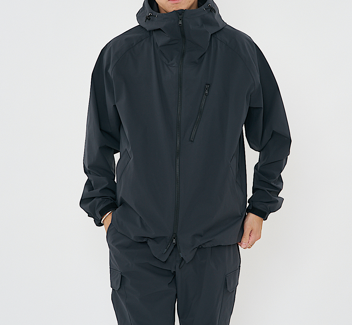 こちらは、日常生活の着用に適した 撥水性とストレッチ性を備えた軽量タフタ素材を使った 軽やかなフード付きブルゾンです。