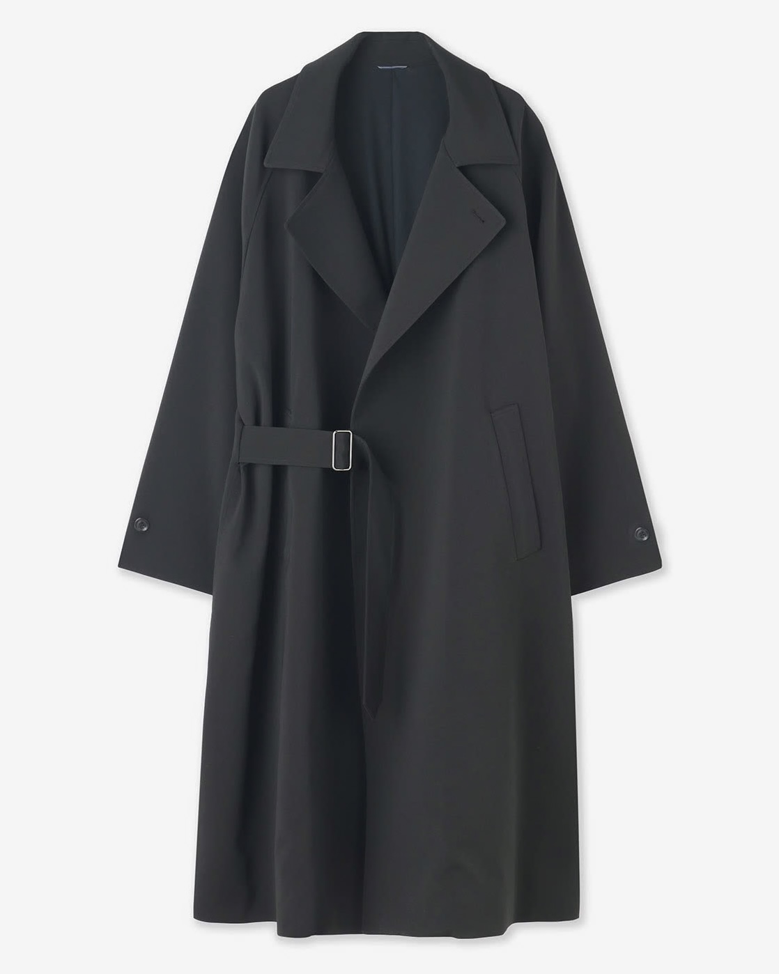 ベルトを締めるバックルが左右非対称の位置にあるのがポイントで、ベルトを締めた後に垂らした時の雰囲気がエレガントに映ります。