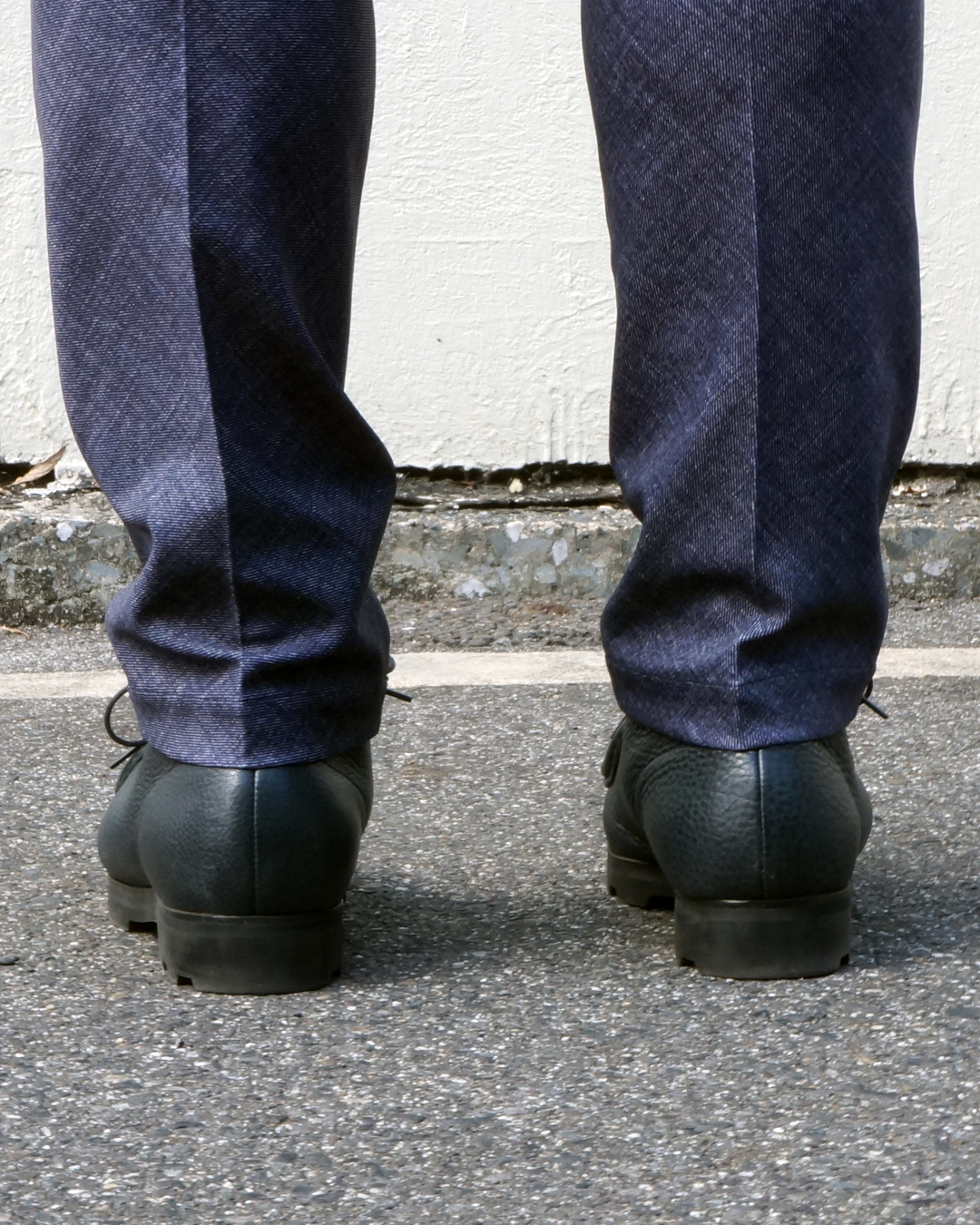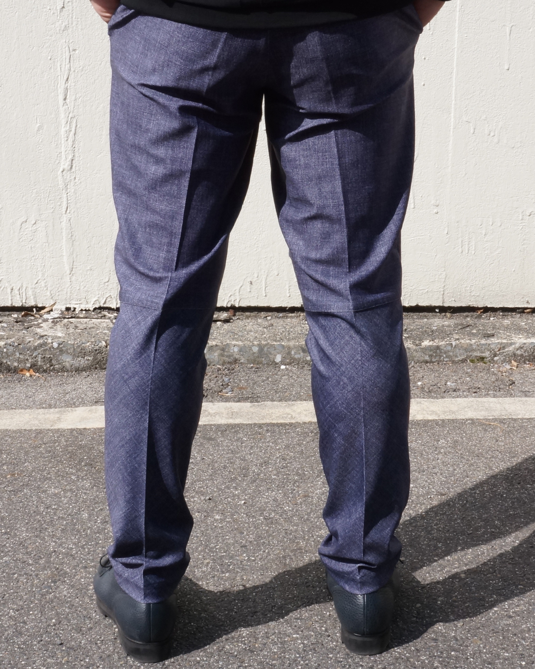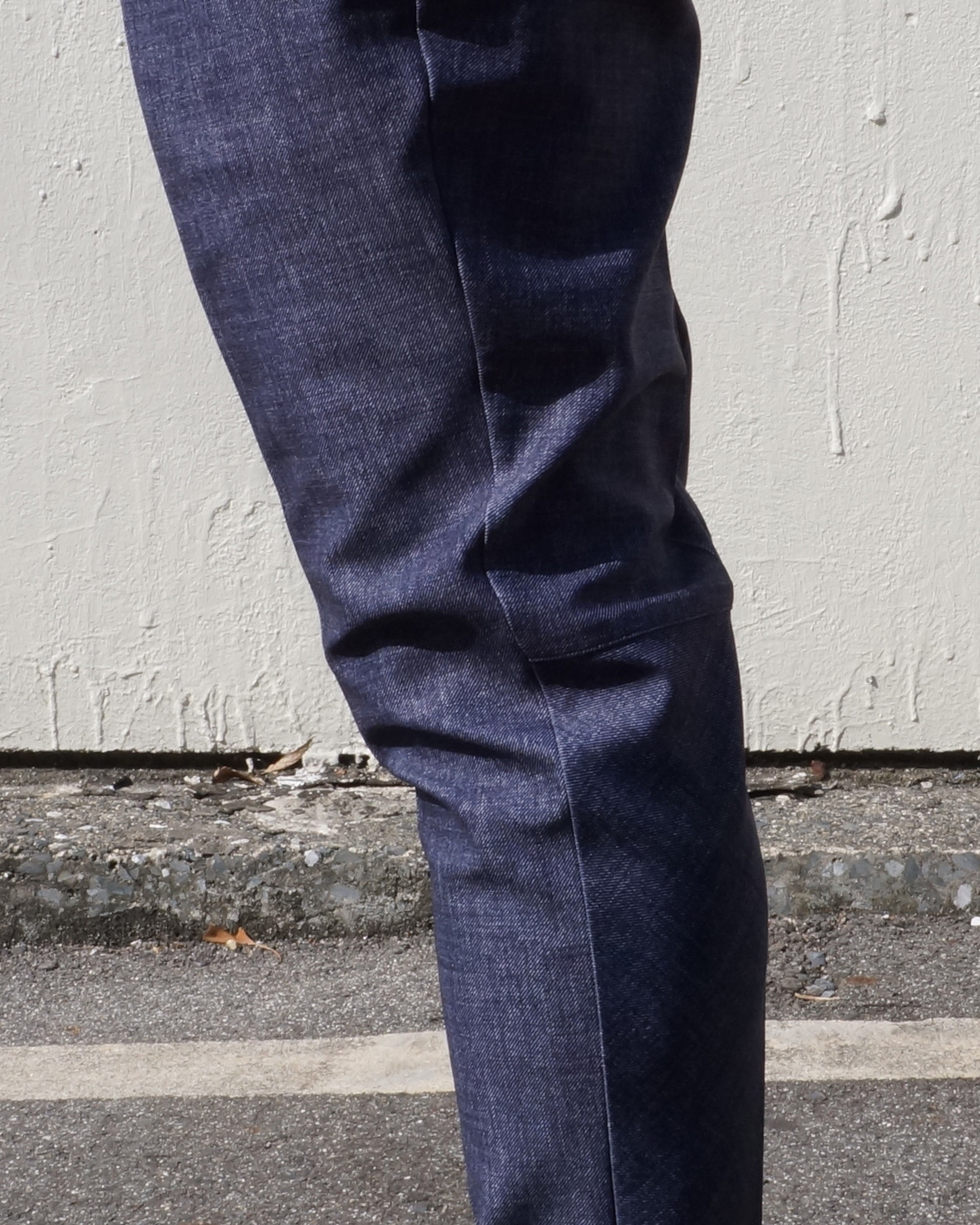 タックによる腿周りのゆとりと、膝下のビシッとしたメリハリの利いたシルエット。
