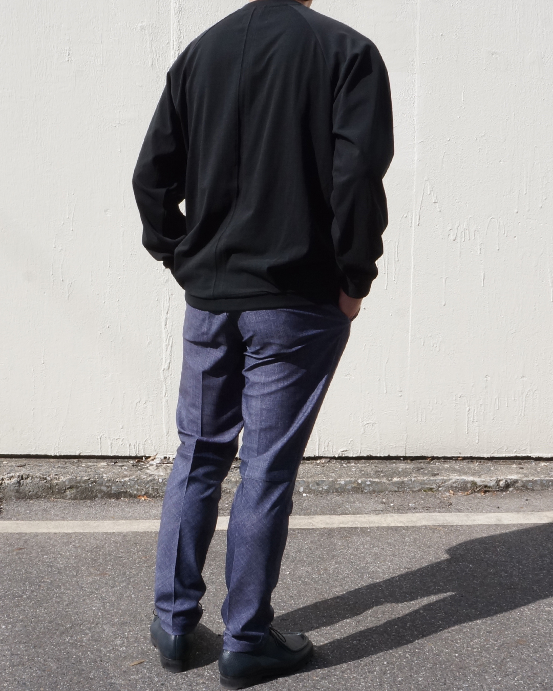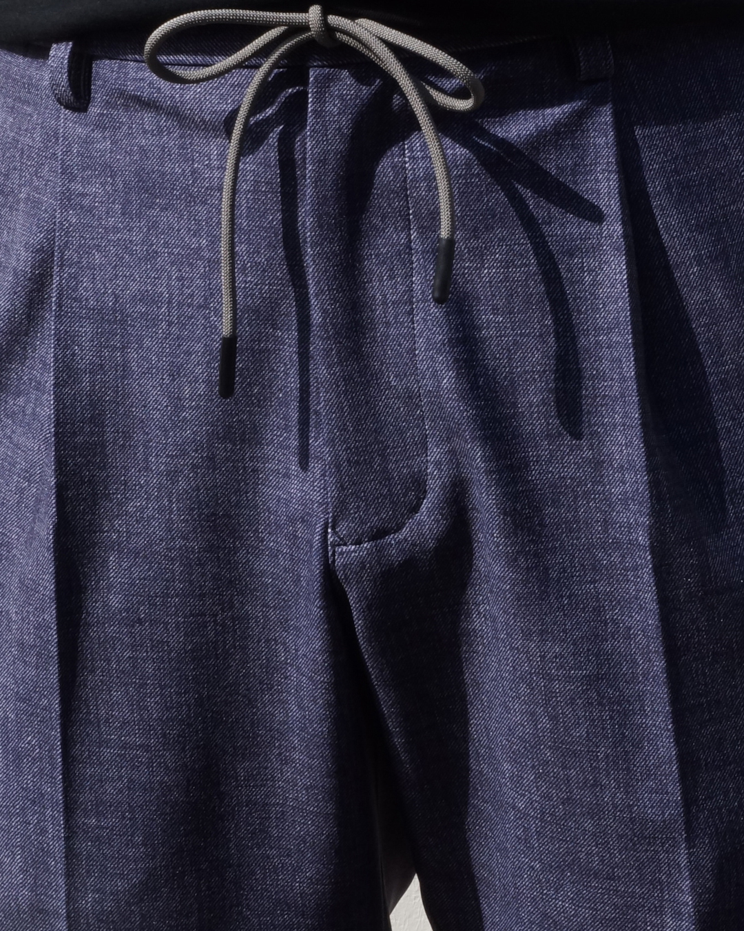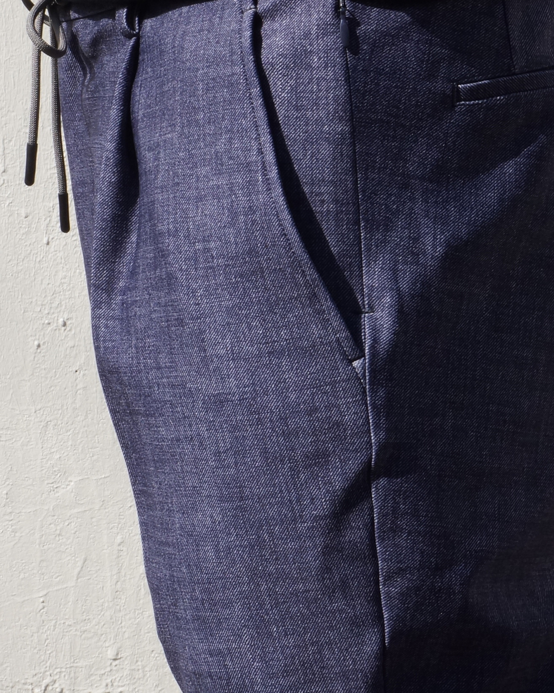 タックによる腿周りのゆとりと、膝下のビシッとしたメリハリの利いたシルエット。