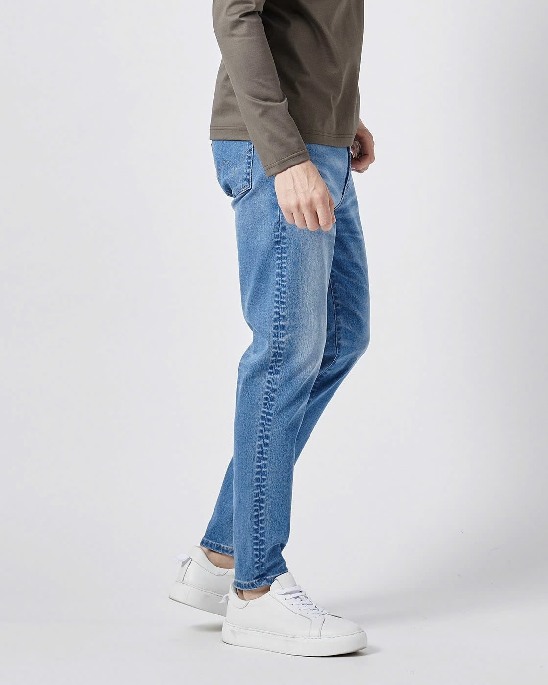 生地に使われている素材の含有率は、コットンを中心にカラーによって多少異なりますが、デニム特有のザラザラ感を抑えたサラッとした肌触りと、「スリム + 動きやすさ」の方程式をそのまま表現したようなフィット感と柔軟な伸縮性を兼ね備えています。